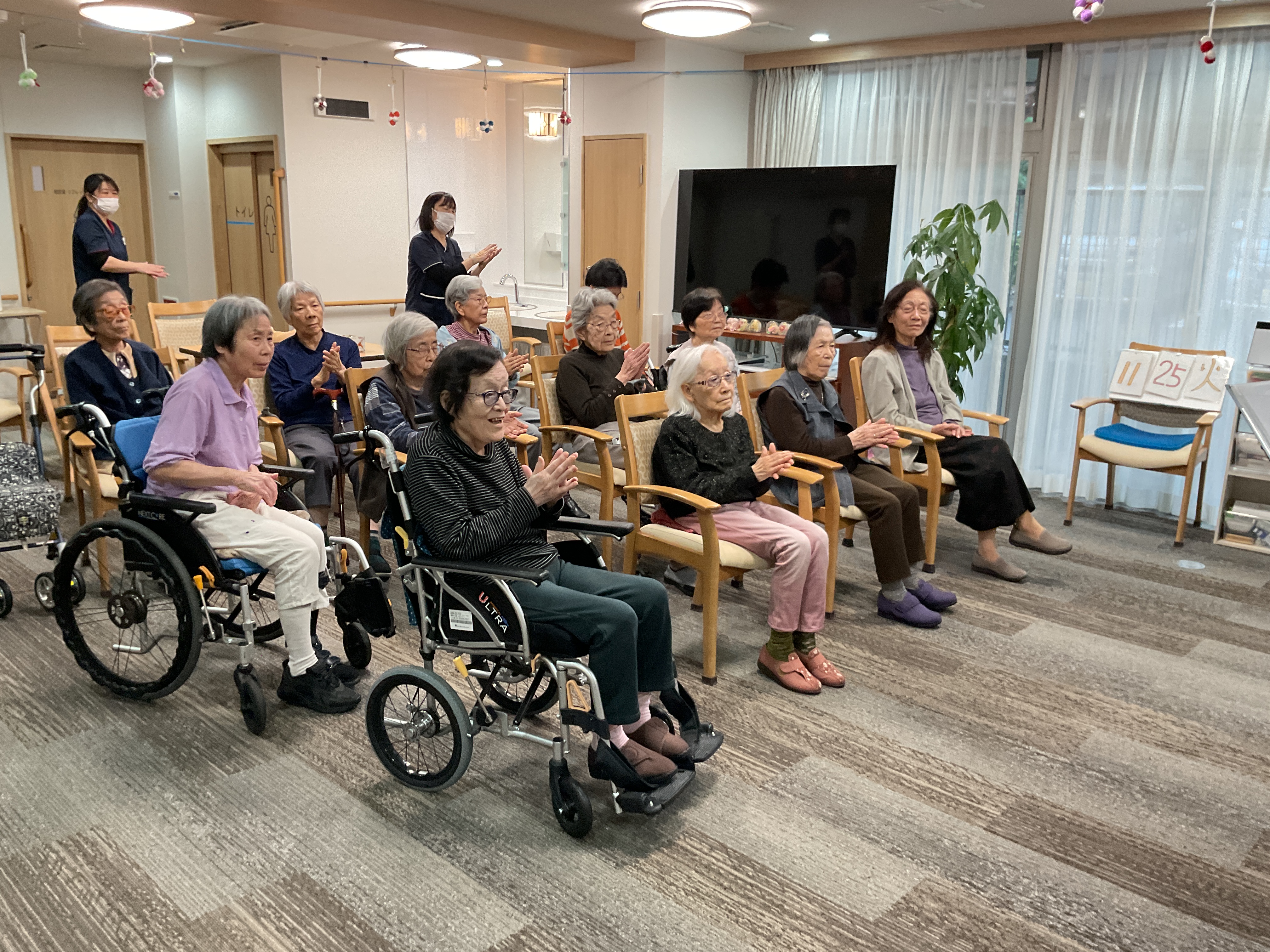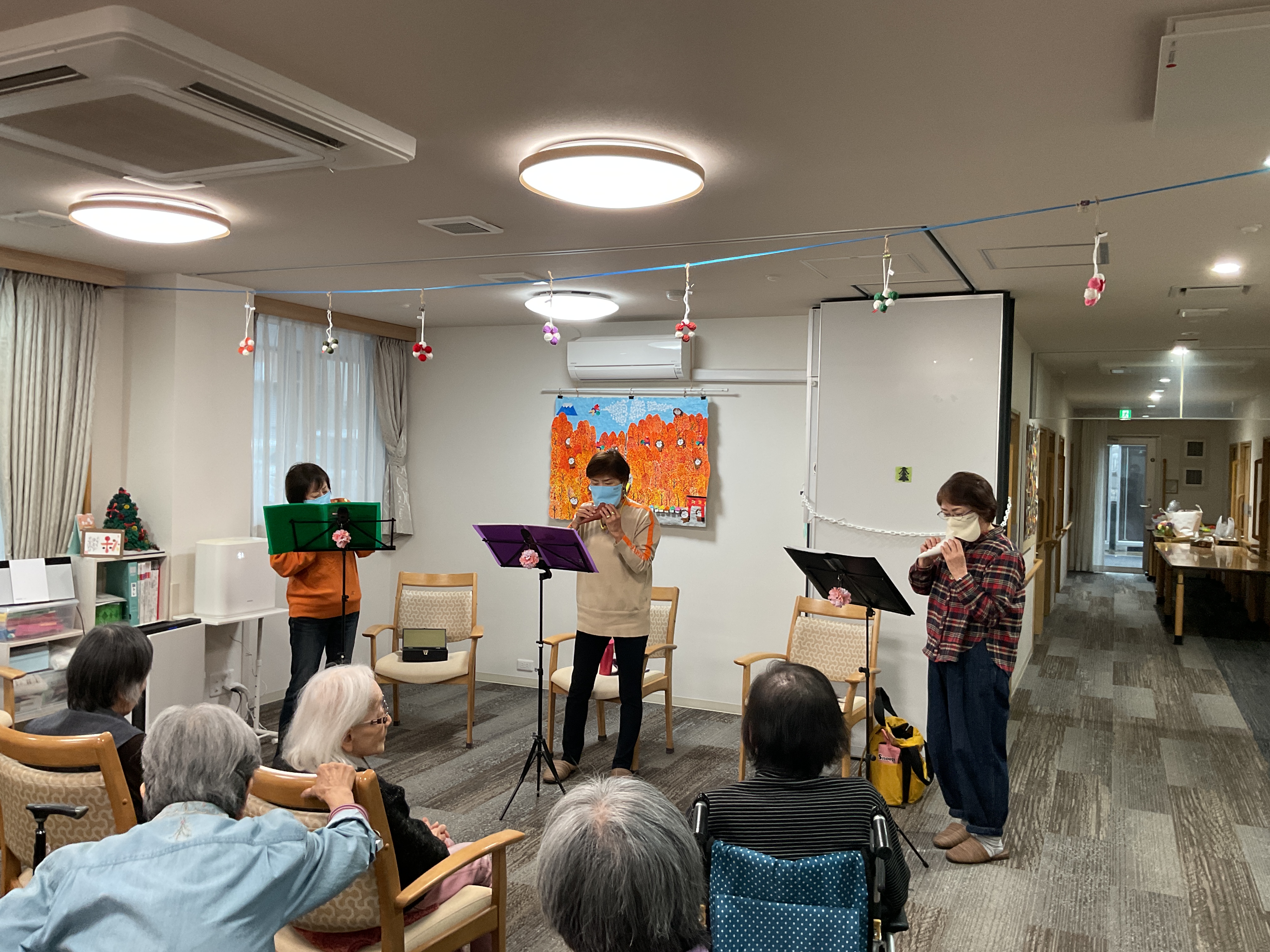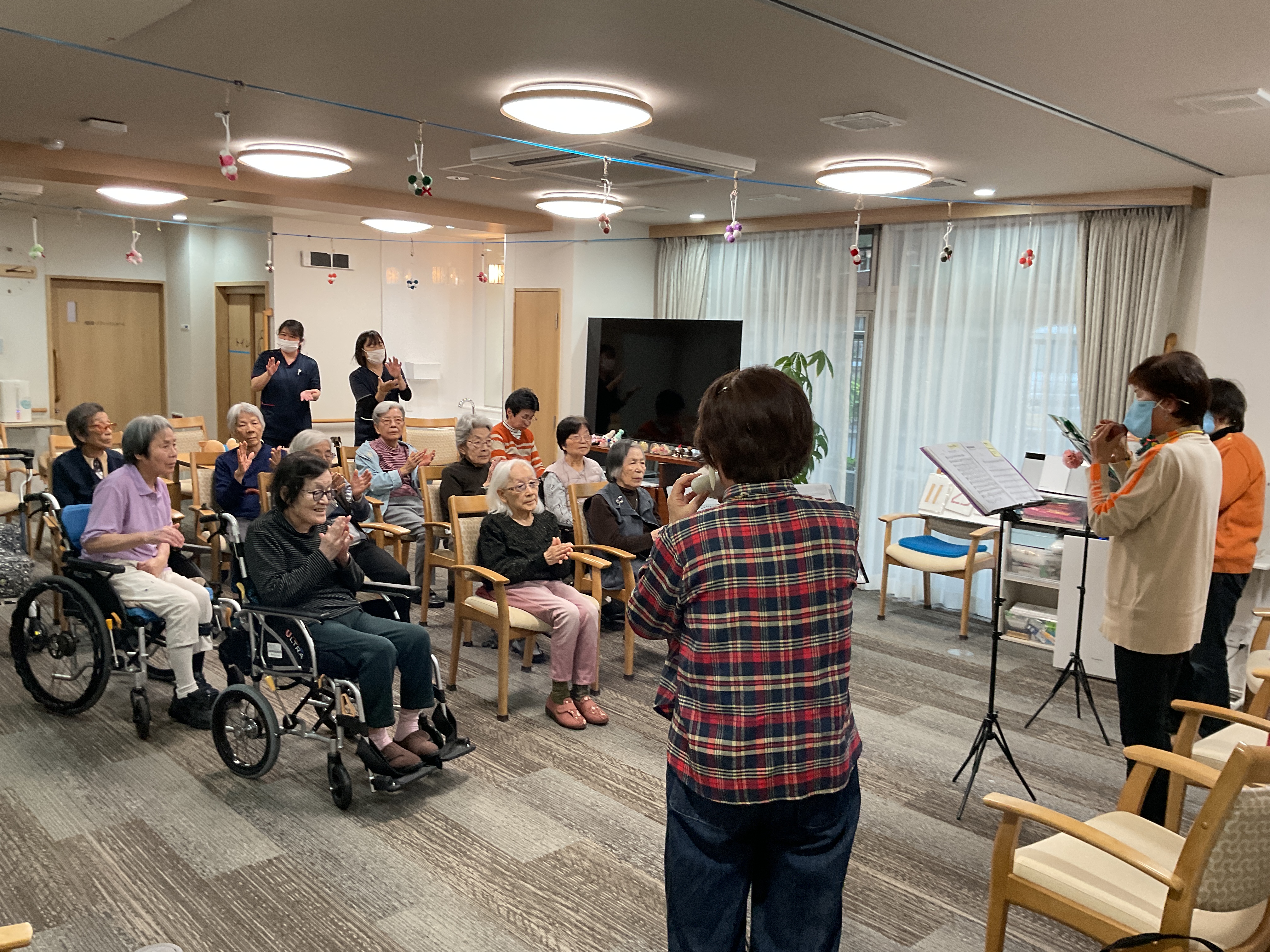 今日はボランティアさんをお迎えしオカリナの演奏を聴いて楽しみました♪優しく心地のいい音色で皆様聴き入っていました。いろんな曲を披露してくださり、テンポのいい曲では手拍子したり、知ってる曲は口ずさんだりととても楽しんでるご様子でした!
