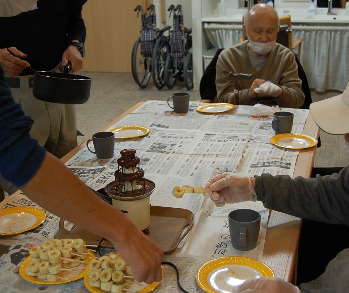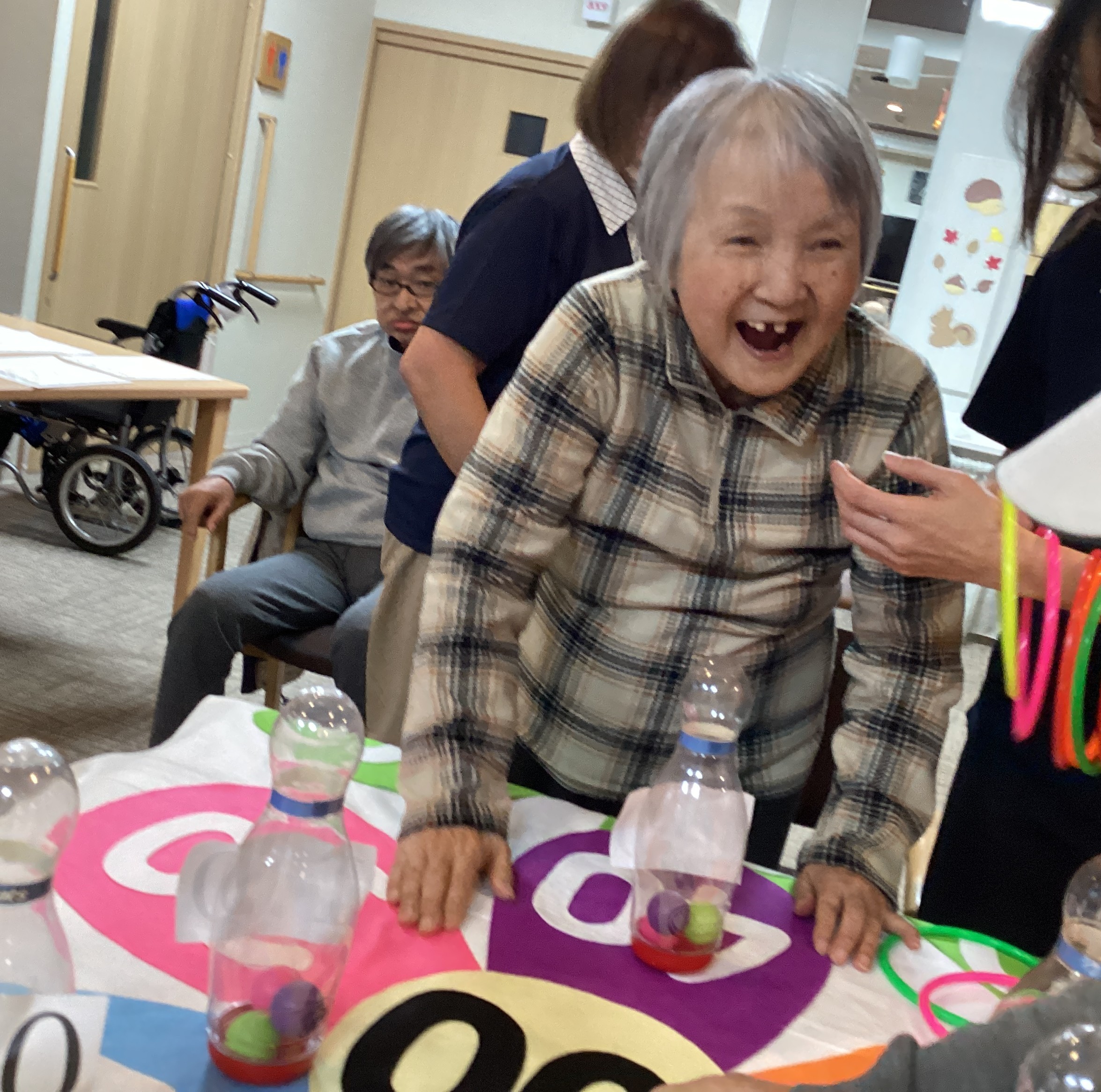 今日は秋まつりを開催しました🍂 昼食は職員手作りの焼きそば・豚汁をお出ししました。 午後からは、メダルをかけたゲームを開催し盛り上がりました! ボーリング・わなげ・的あてゲームもすべて職員お手製☆ おやつにチョコフォンデュも🍌