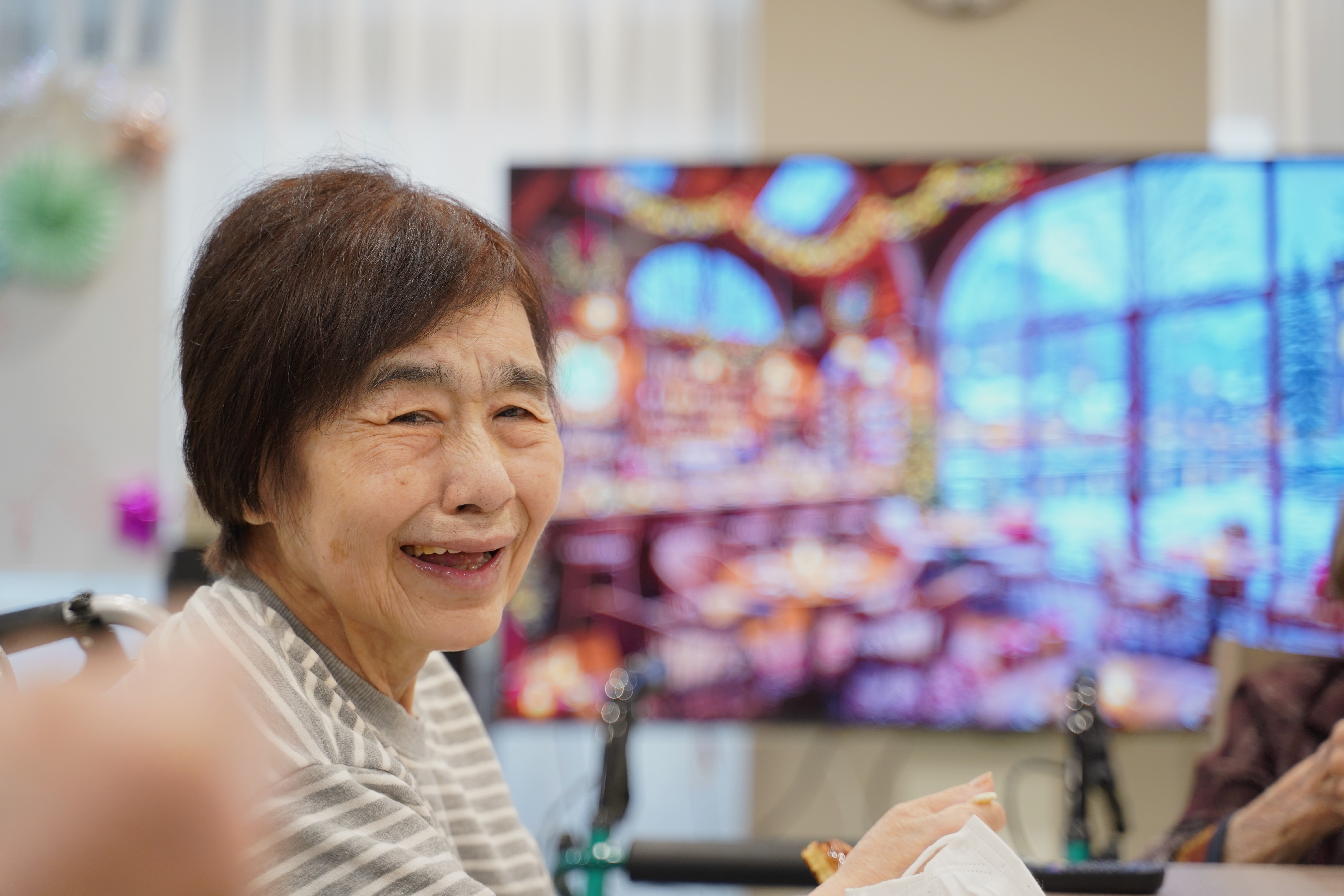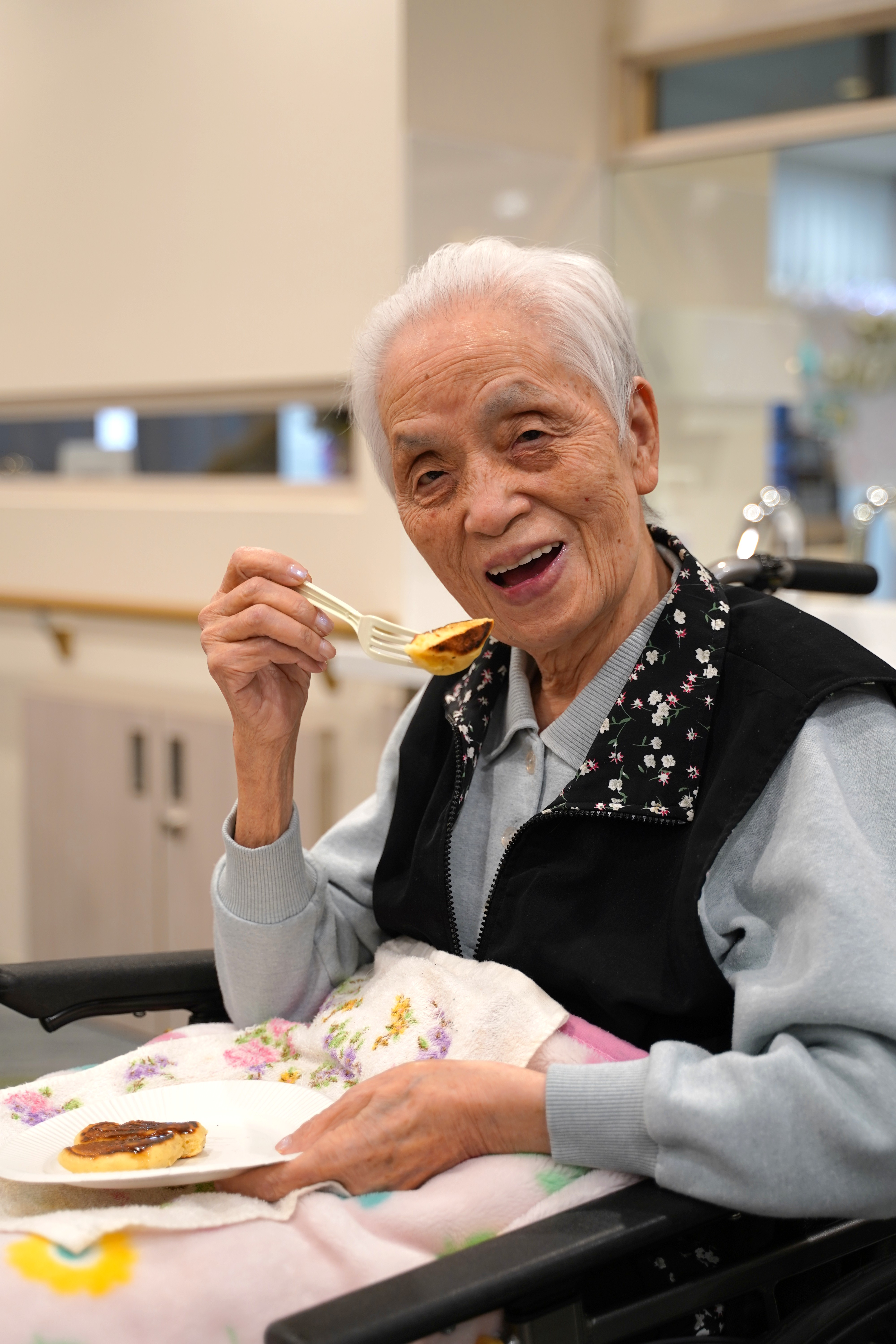 本日の午後の時間に、パンケーキ作りをしました。 ホットプレートで焼いて、チョコレートメイプルシロップ、はちみつ等で味付けをして、出来立ての熱々を召し上がっていただきました。「美味しい、美味しい」とおっしゃっていただき、楽しいひと時でした。