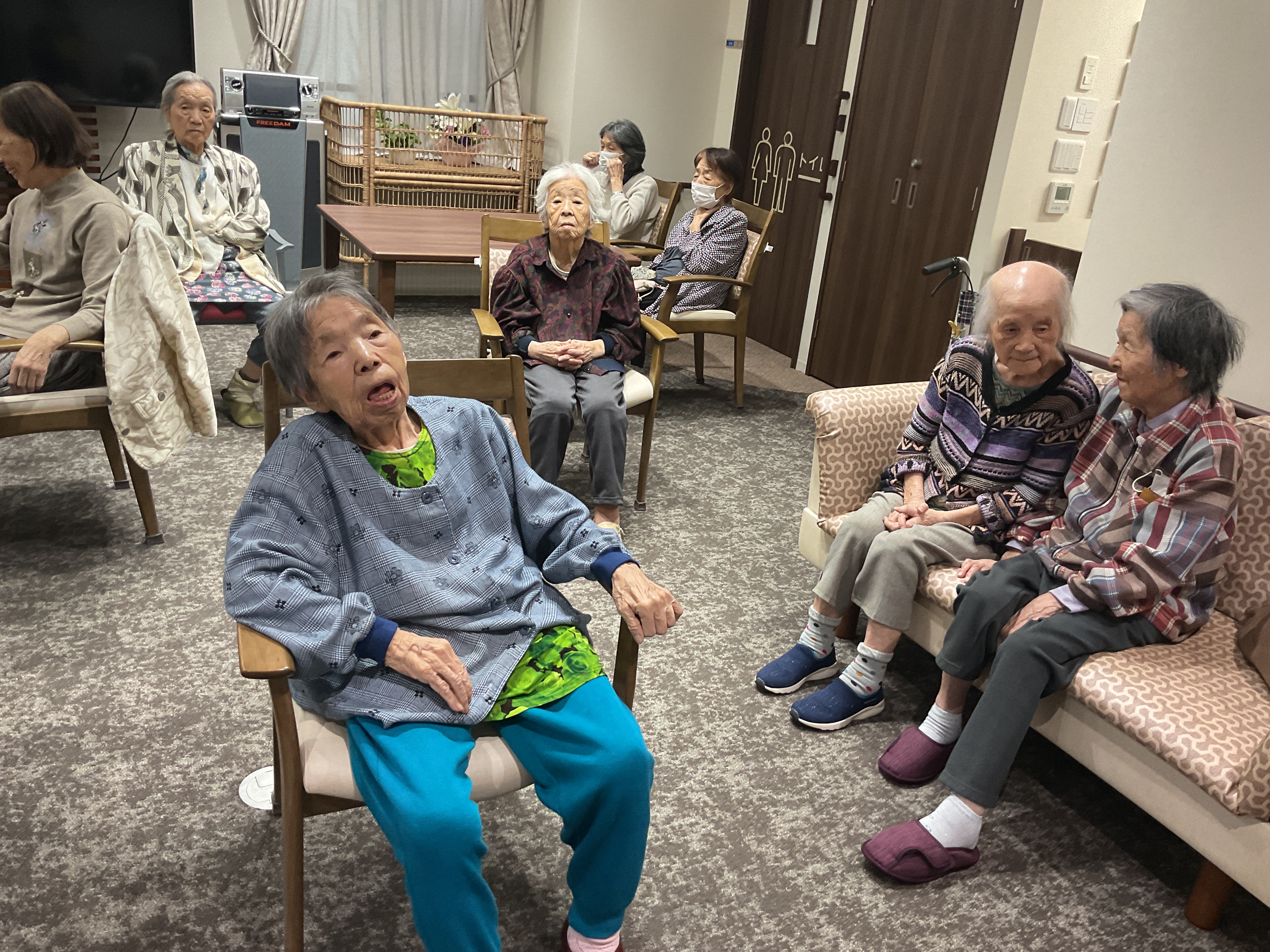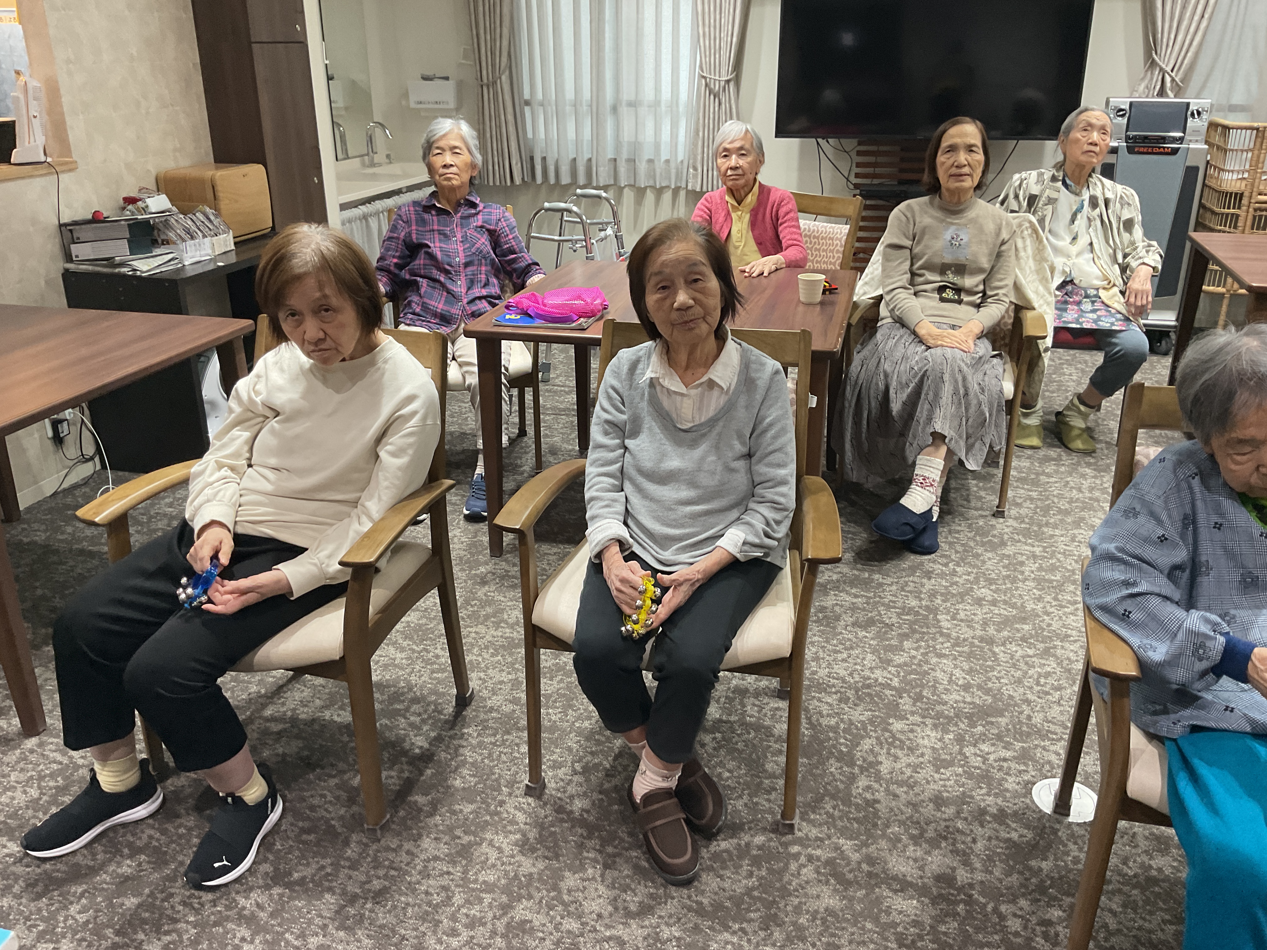 先日4階フロアでは3階ご利用者と合同で音楽レクを開催しました! 楽器を用いて演奏しながら歌ったり、懐かしの歌を歌われ皆様楽しまれていました。