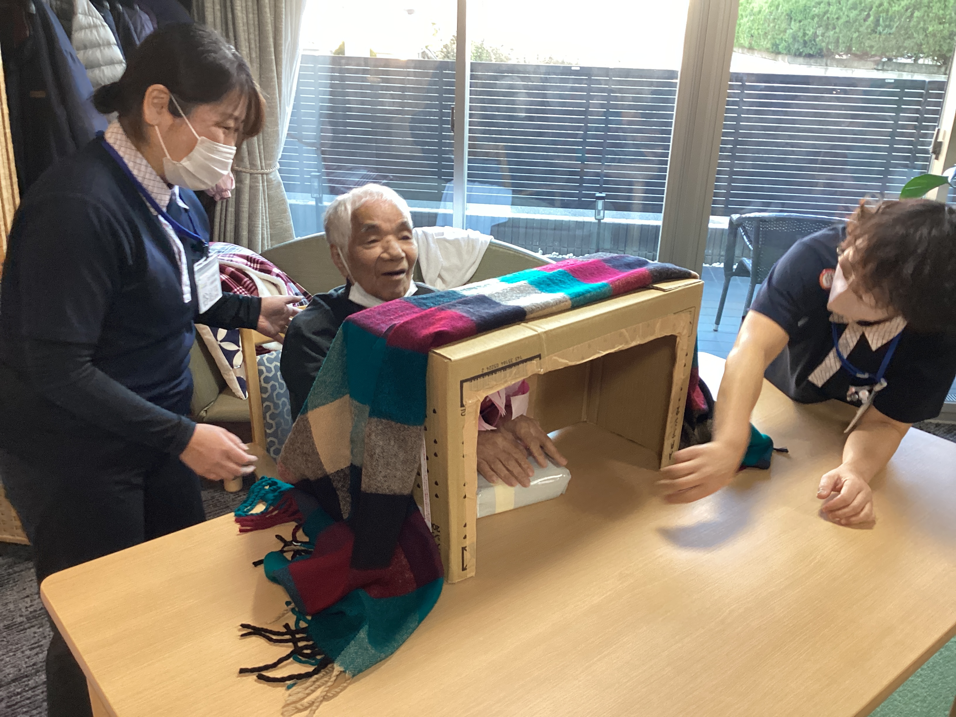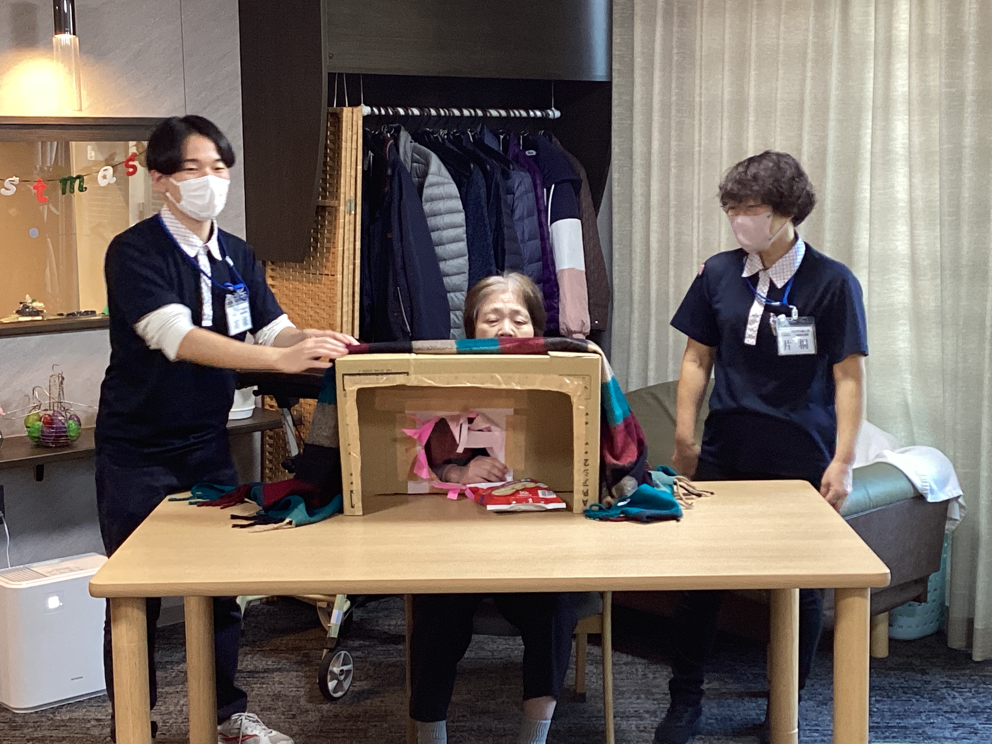 穴から手を入れて 何が隠されているかを当てるゲームをおこないました ヘアブラシや排水溝ネットなど 難問にも数々挑戦していただきました