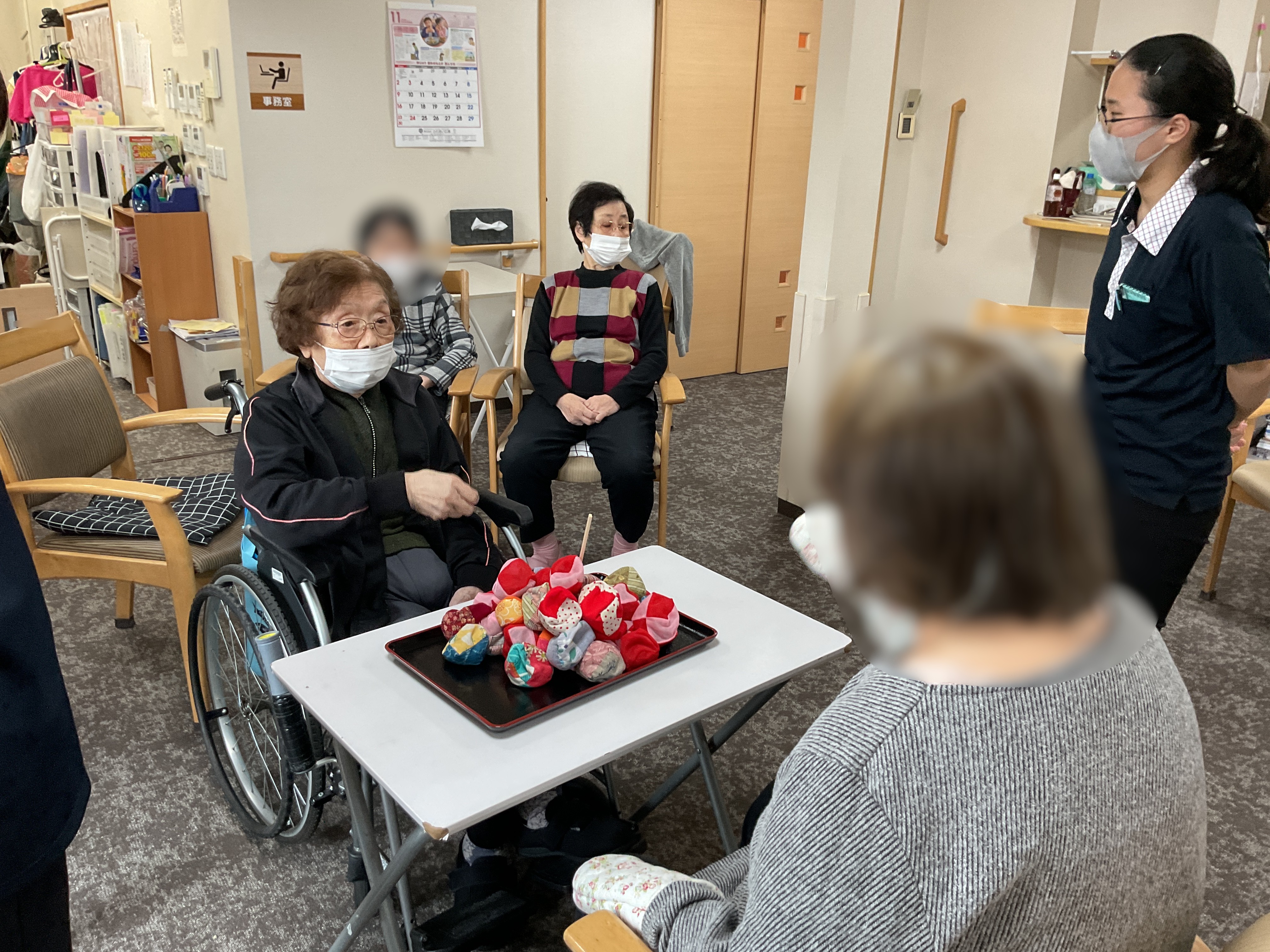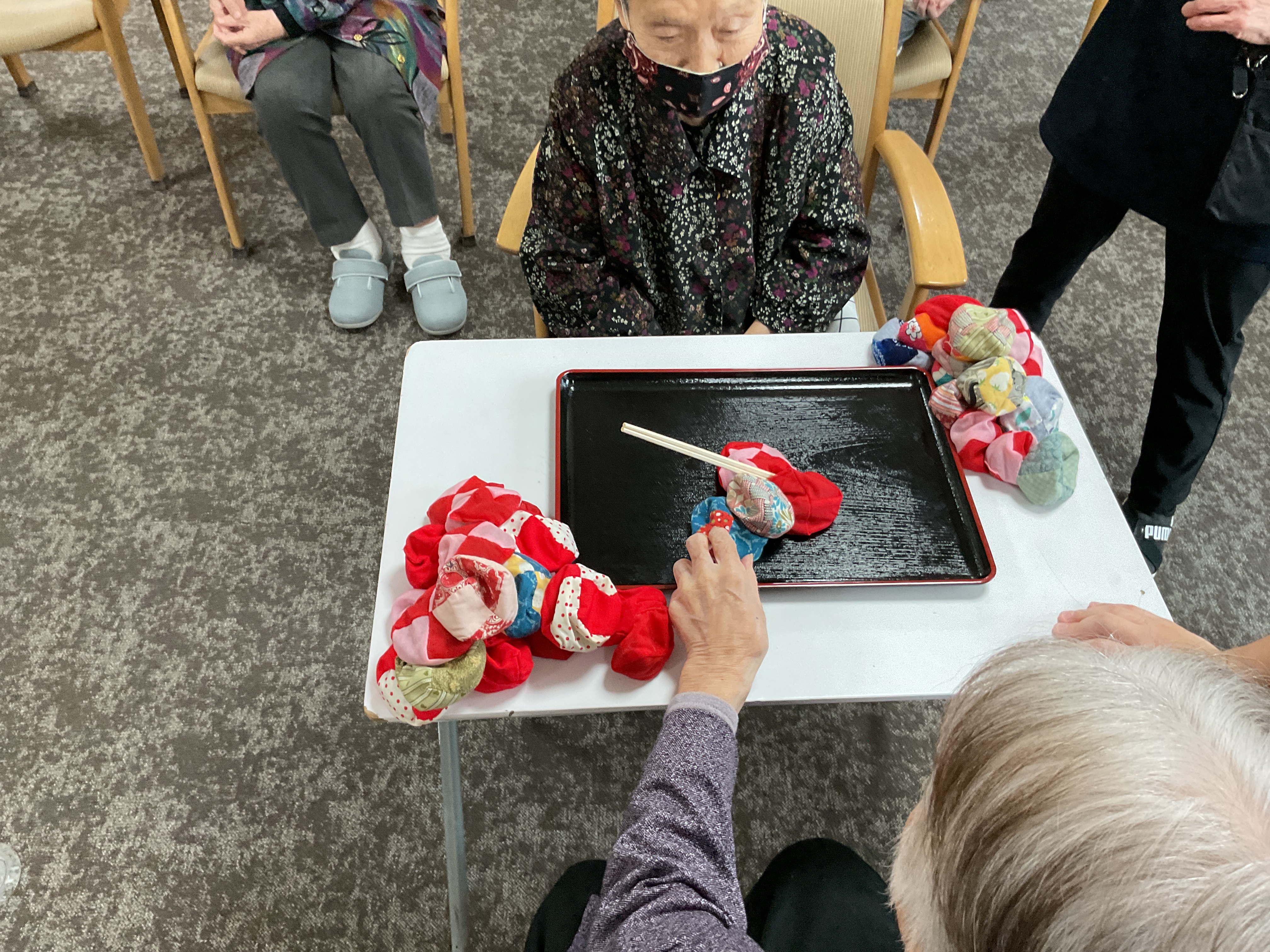 本日のレクレーションはお手玉を使ったレクレーション。 お手玉棒倒しをしました。 お手玉の山に割りばしを立て、お手玉を順番に一個ずつ取っていきます。 棒を倒したほうが負けです。 砂と違って飛び散る心配がないため、安心して楽しむことができます。