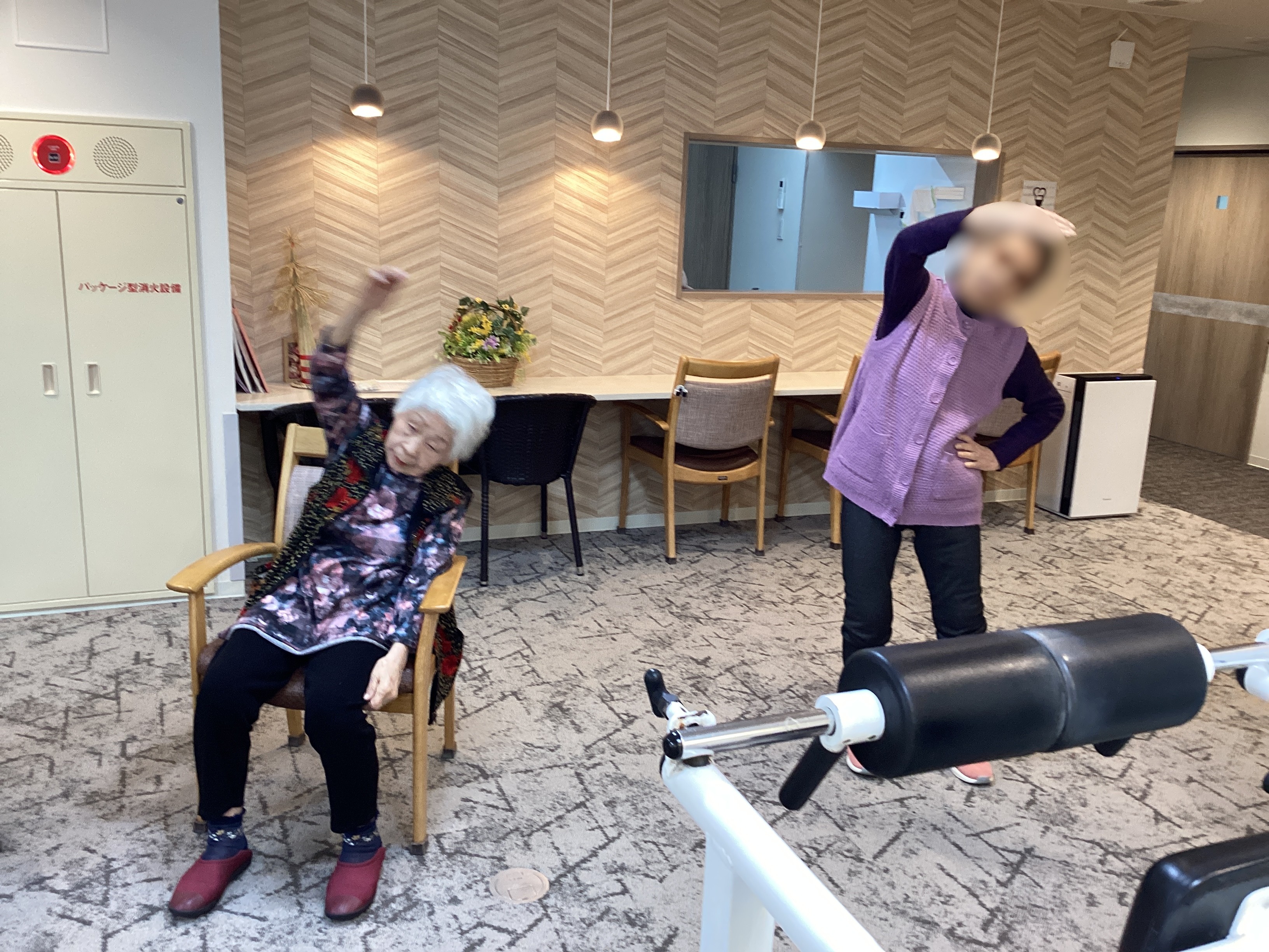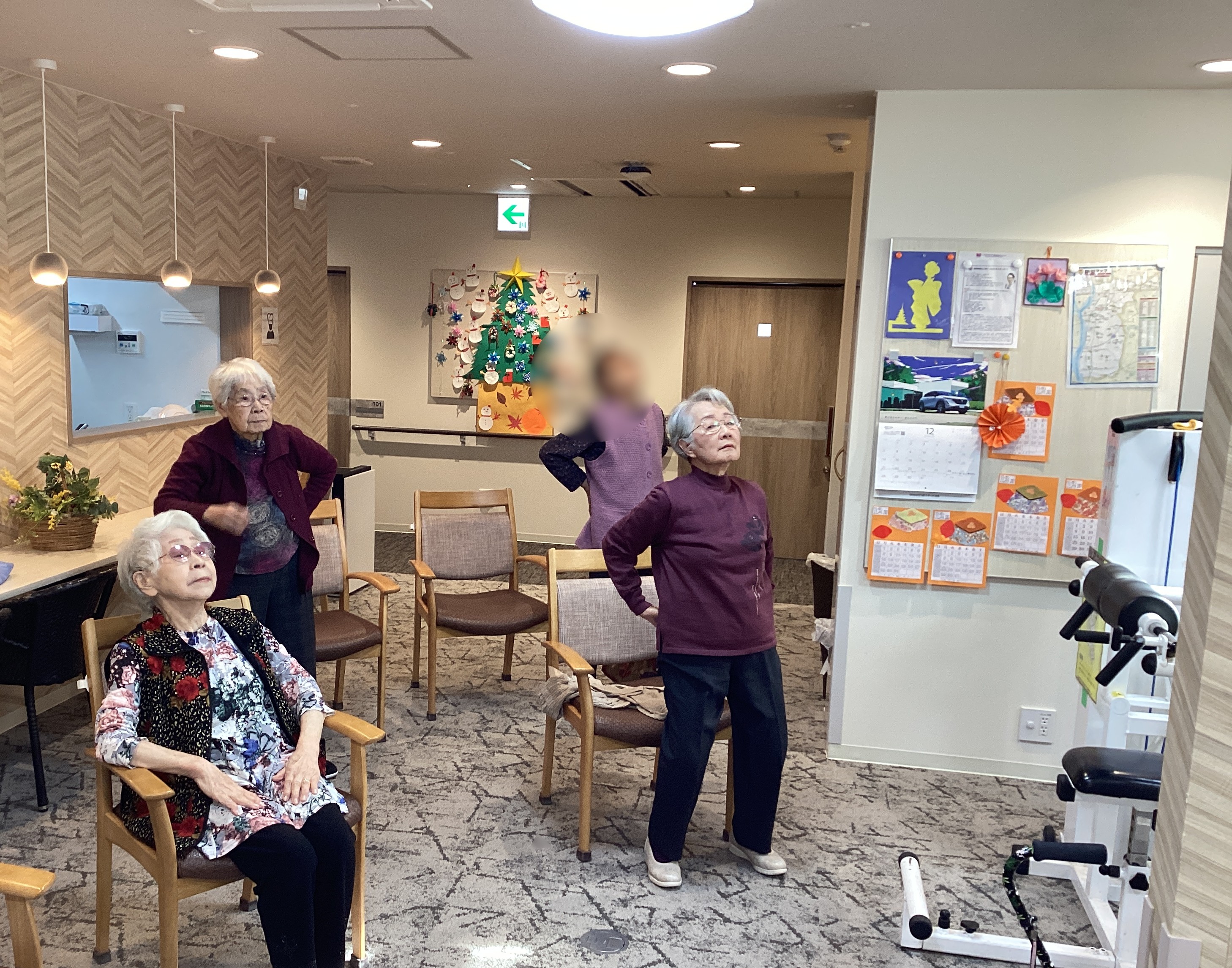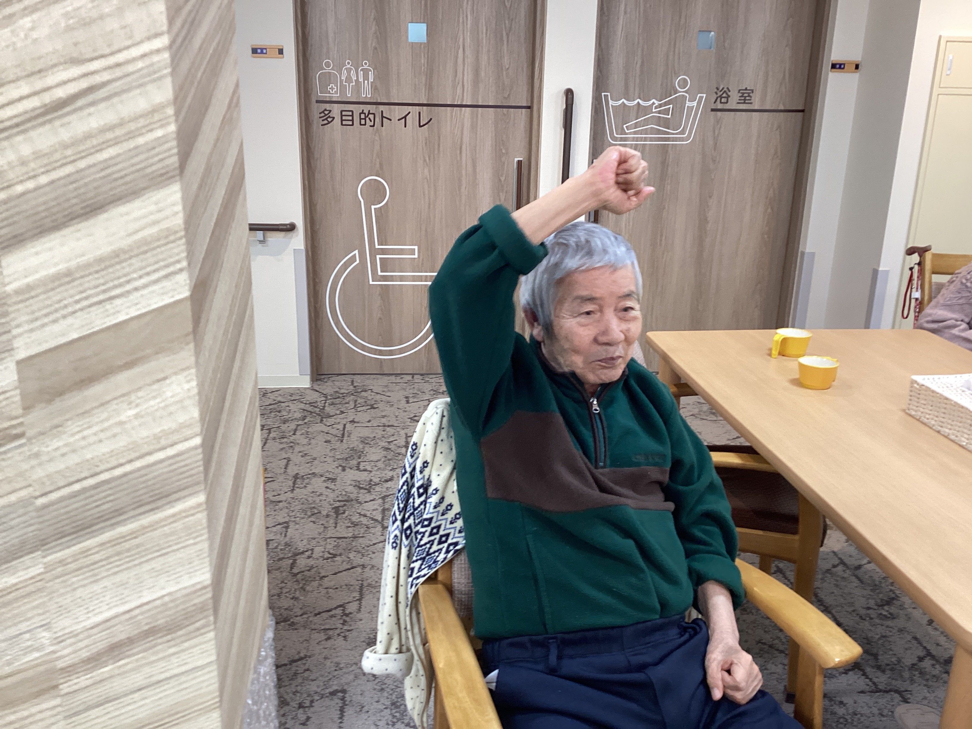 ミモザ海老名では、毎朝の日課としてラジオ体操などの体操を取り入れています! 利用者様の健康維持・増進を目的に無理のない範囲で体を動かし、和やかな表情で取り組まれています😄