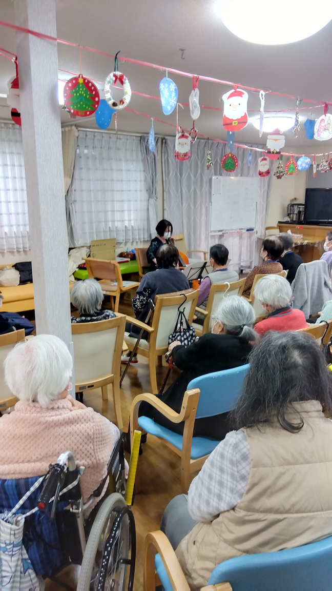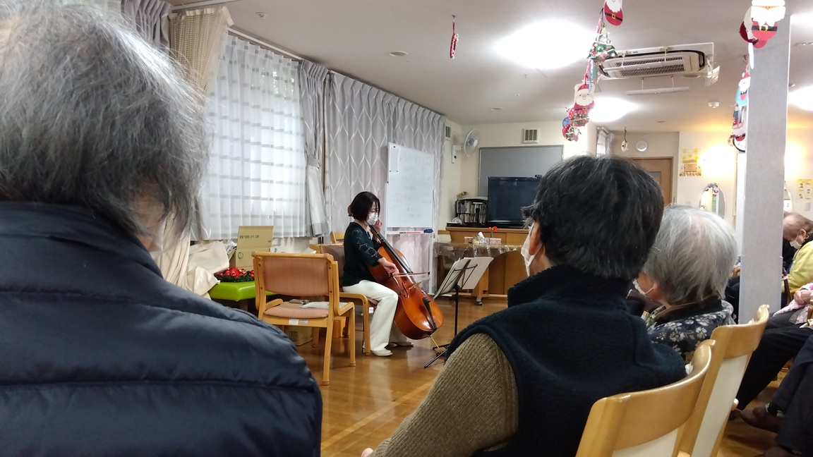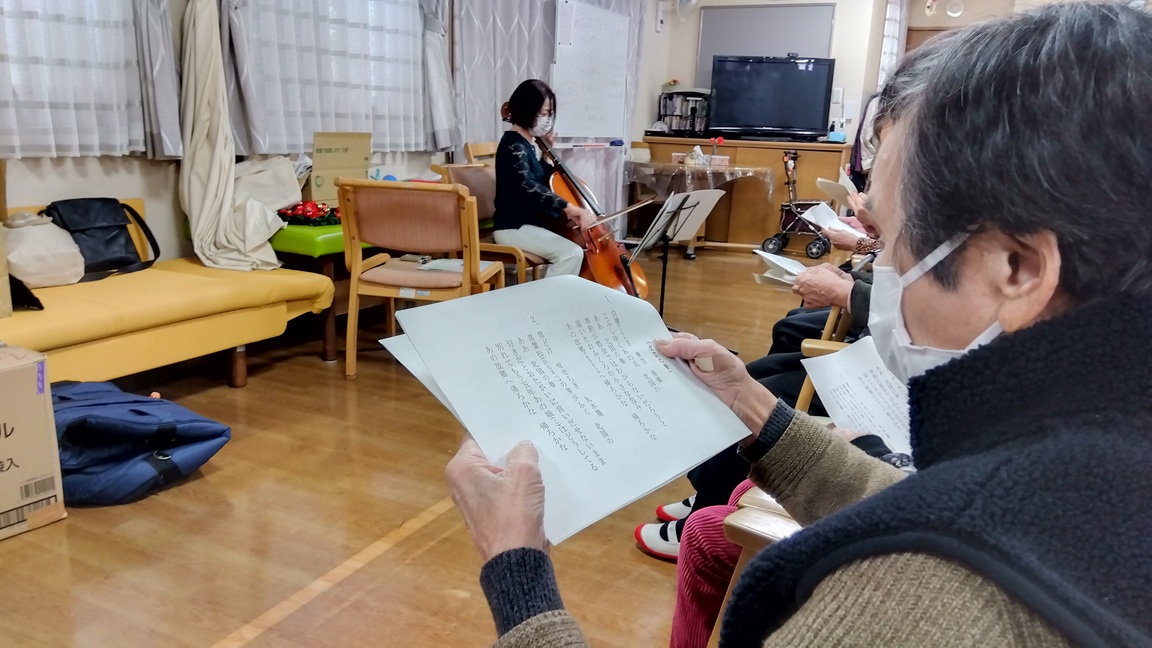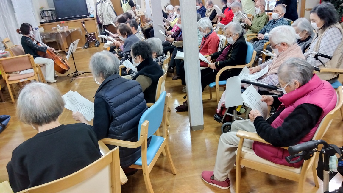 弦楽器でもあるチェロの音色に合わせて、昭和歌謡等の歌声をミモザ白寿庵真鶴施設全体でハーモニーができあがりました。 心地よい響きが心を穏やかにしてくれました。