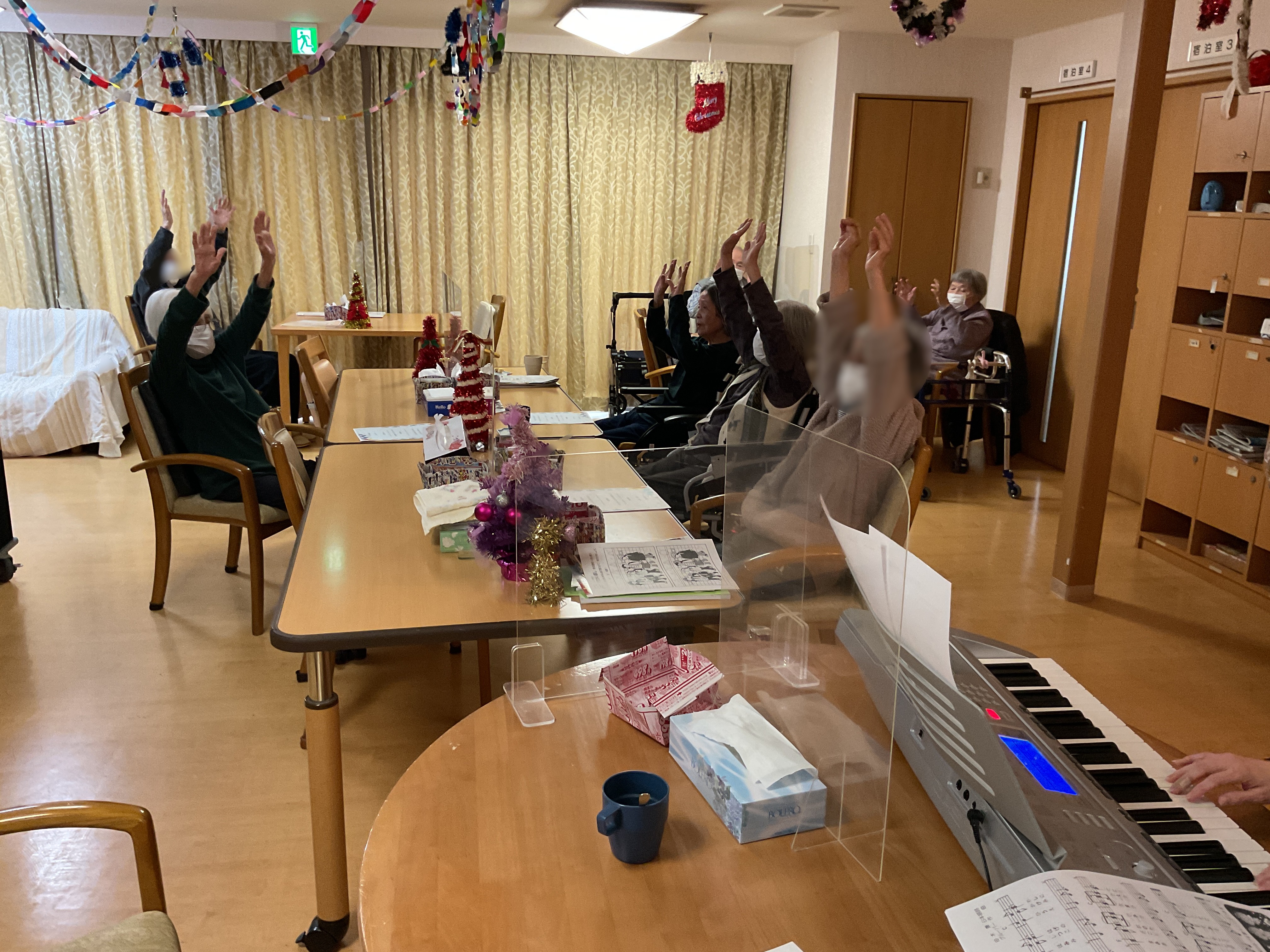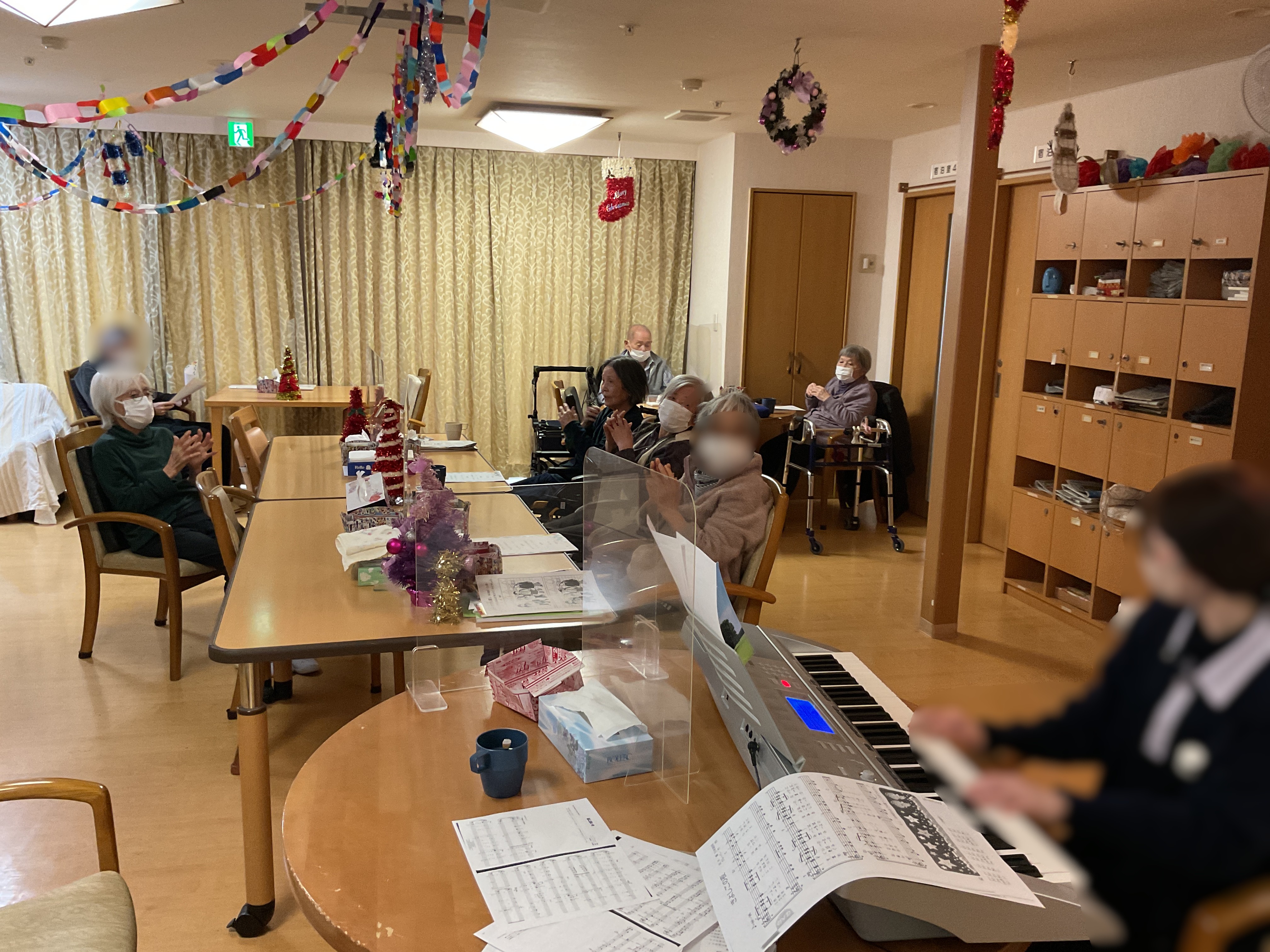 ここ最近のレクリエーションでクリスマス会で歌うクリスマスソングを練習しています♪職員のピアノに合わせて皆様一生懸命に歌っています♪ クリスマス会は23日に予定しています!それまでに練習して素敵な歌声を聞かせてほしいです😊