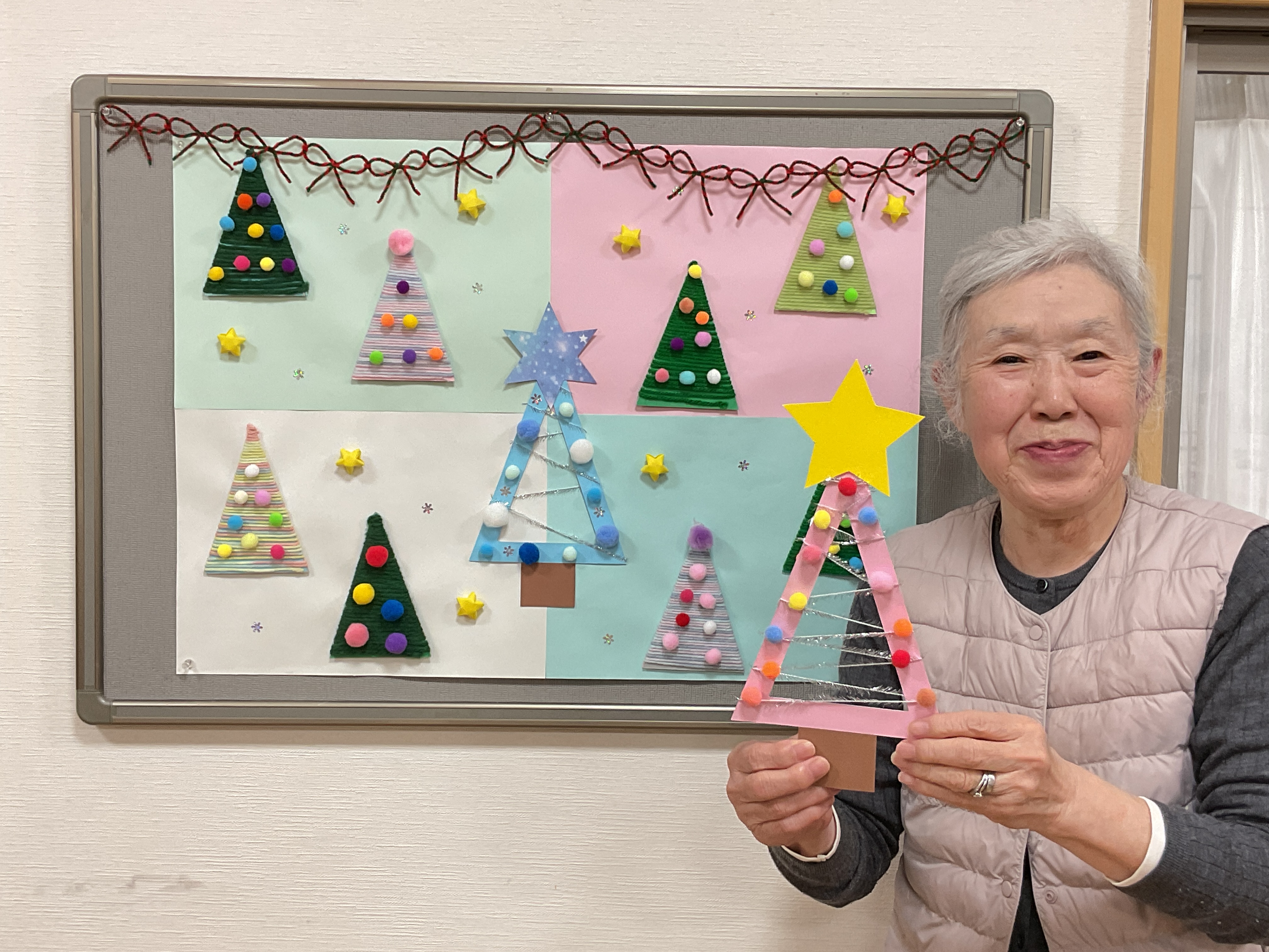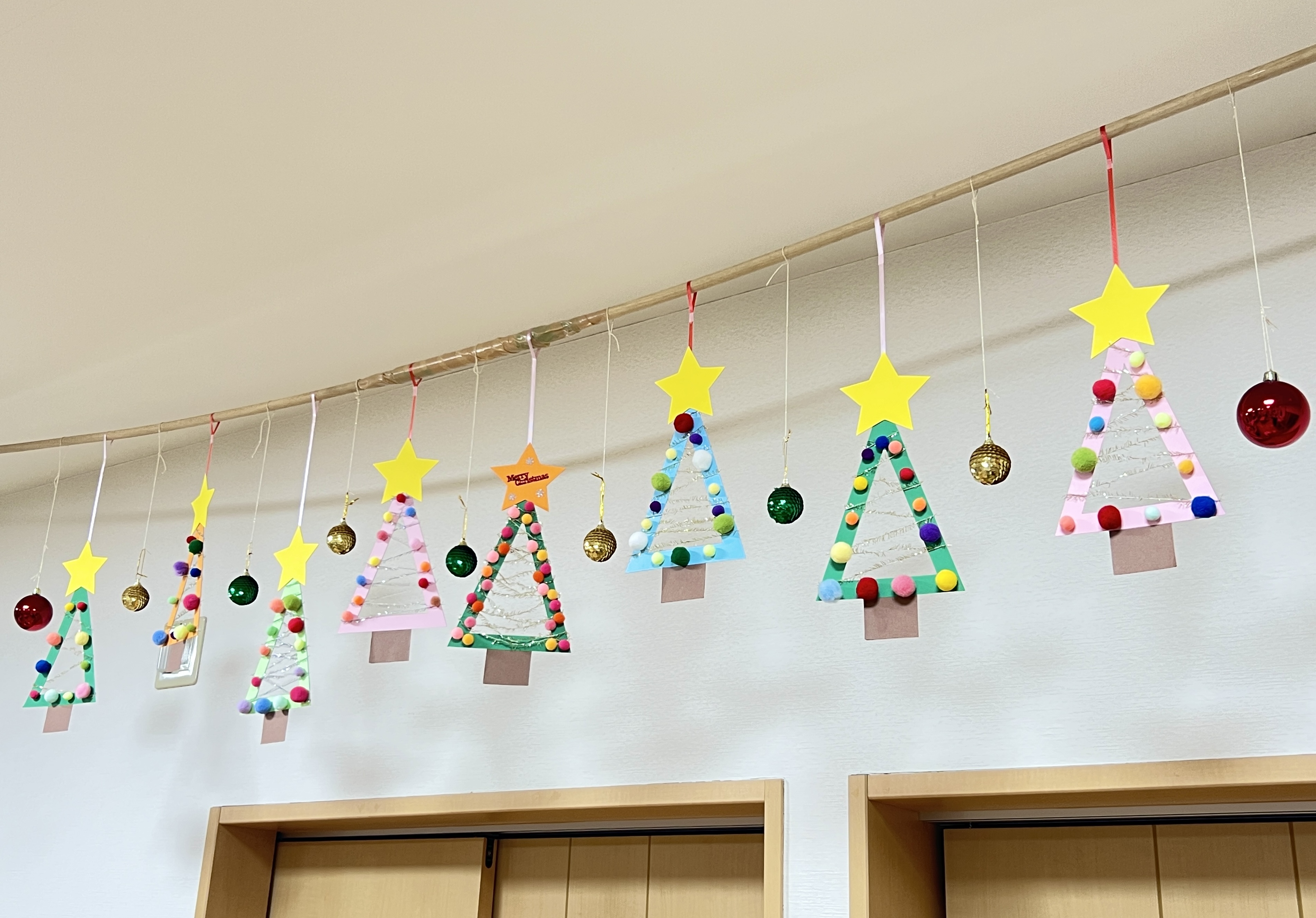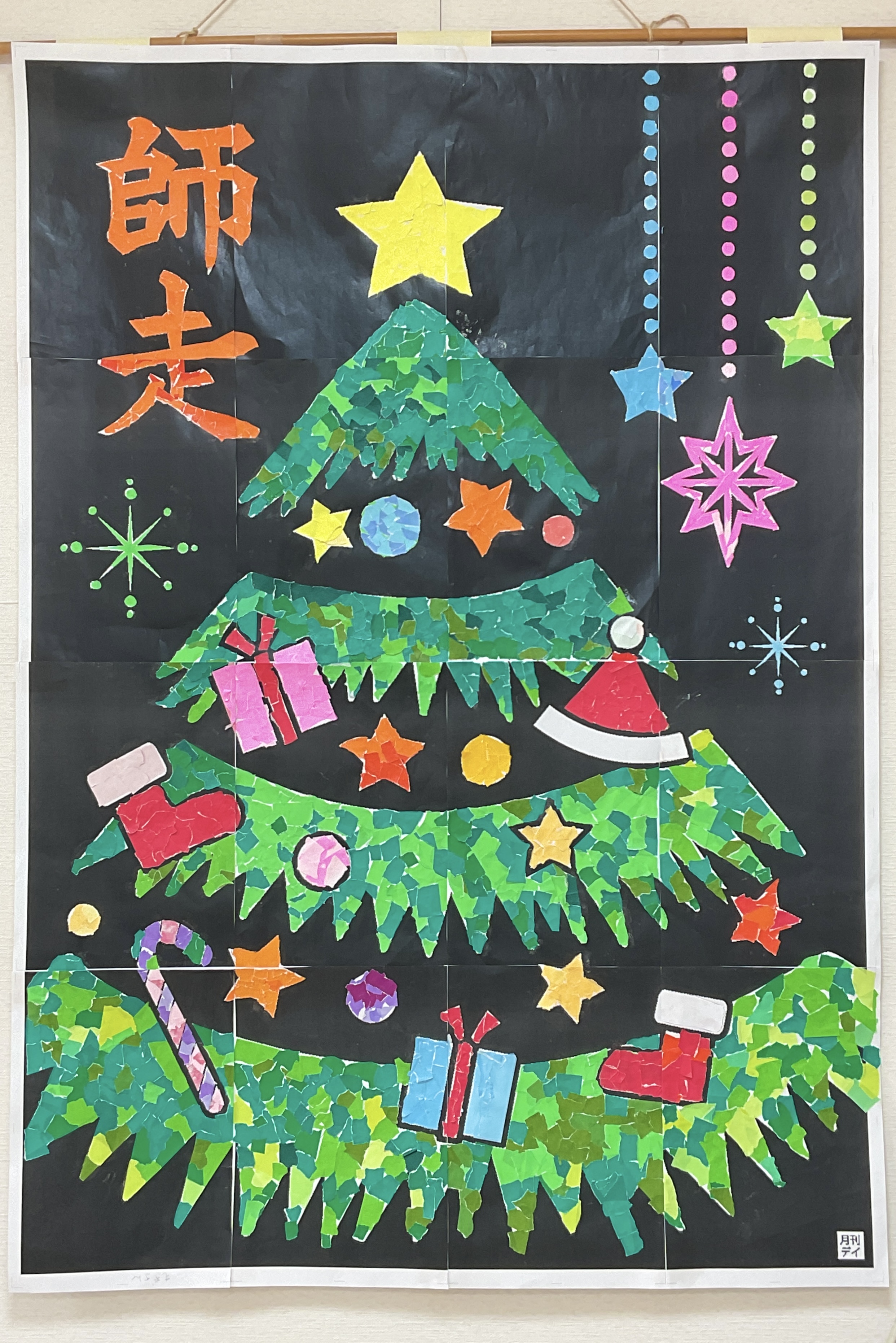 クリスマスツリーの壁面飾りと、ちぎり絵等が完成しました♪ カラフルでかわいく仕上がっていますね🎄