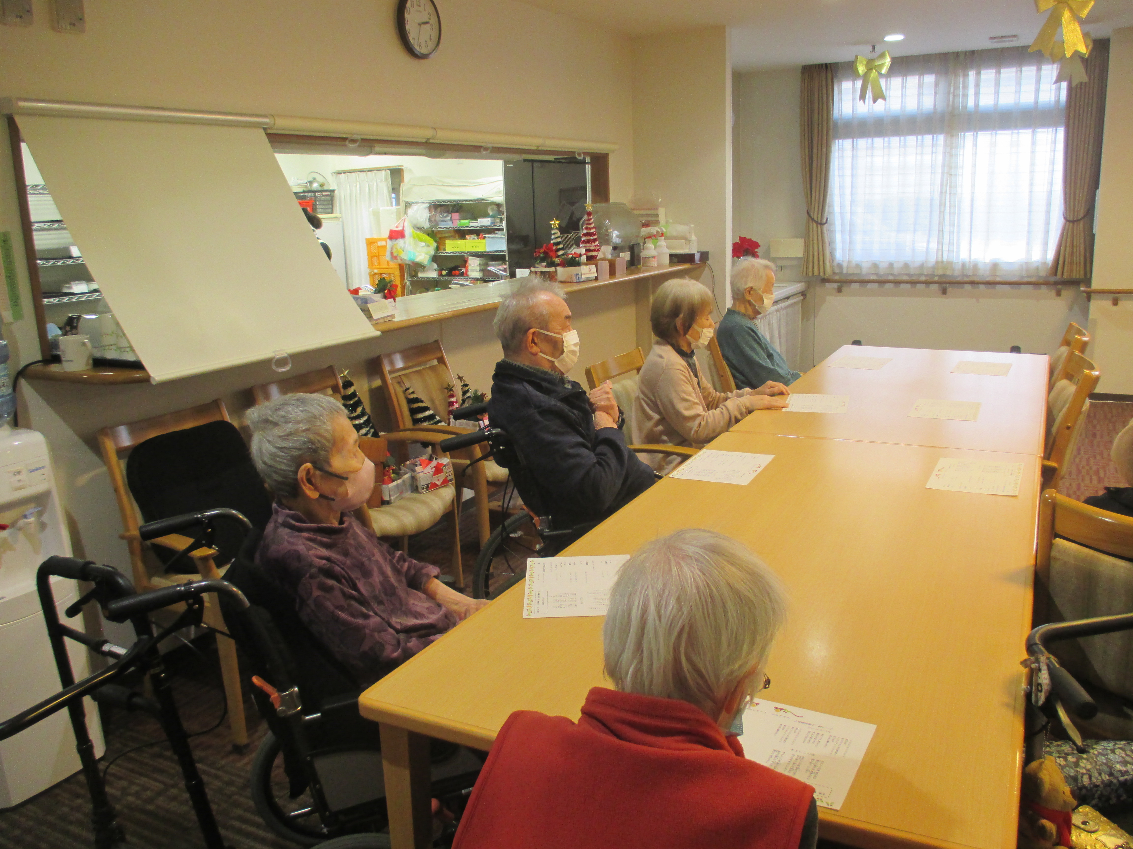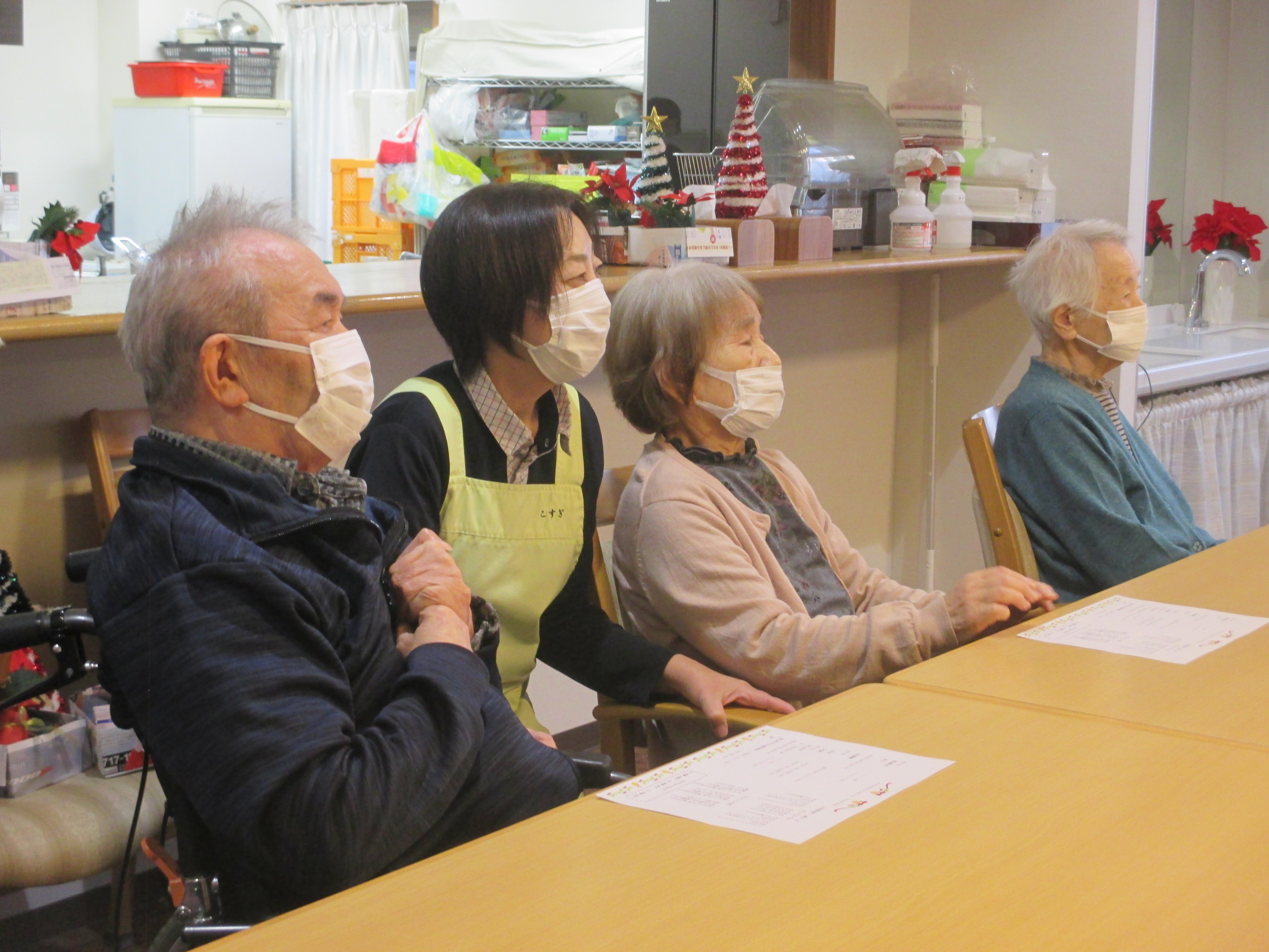 併設するサ高住のクリスマス会に参加しました。 ハープとバイオリンと歌の素敵な演奏会でした。
