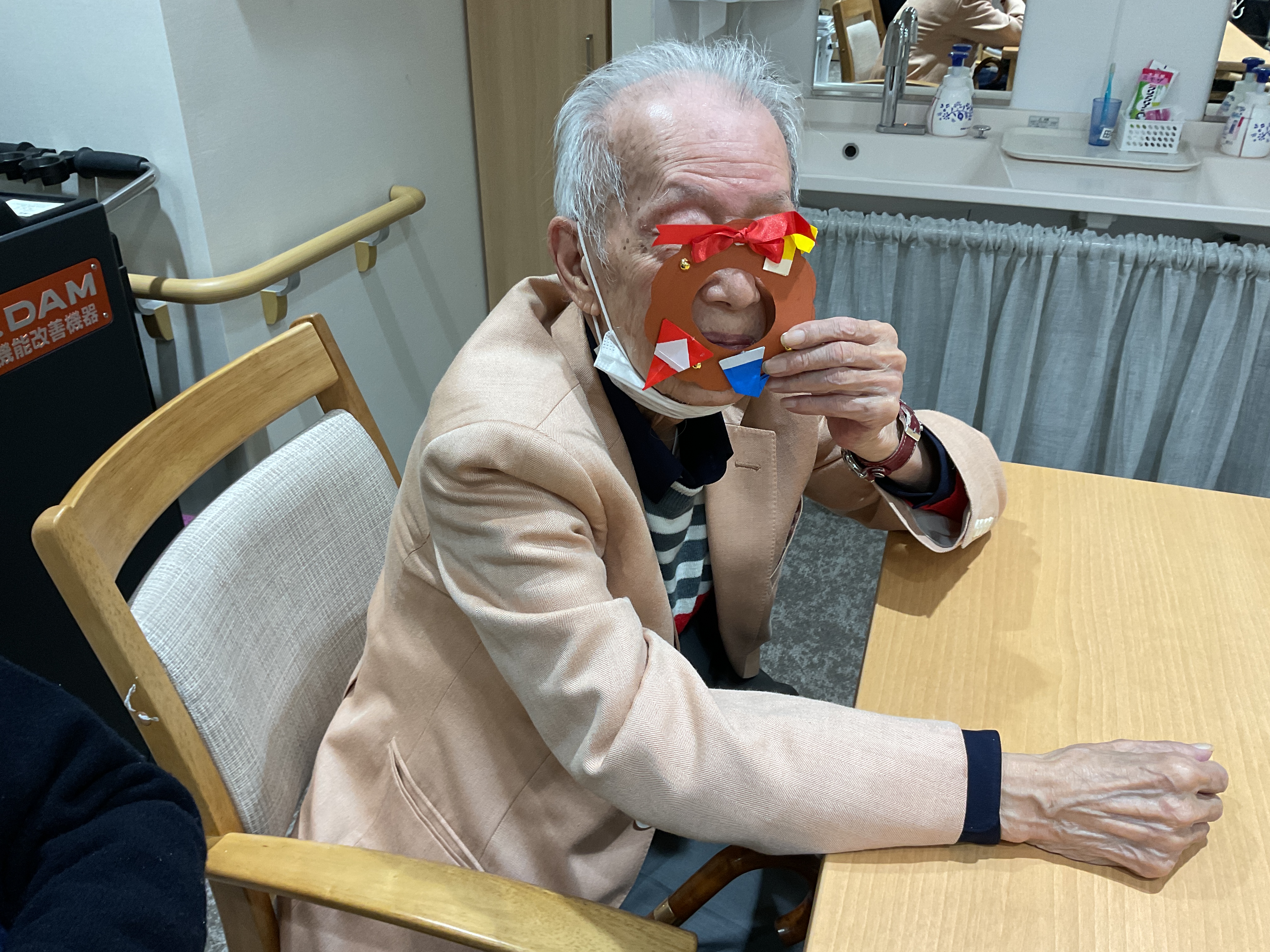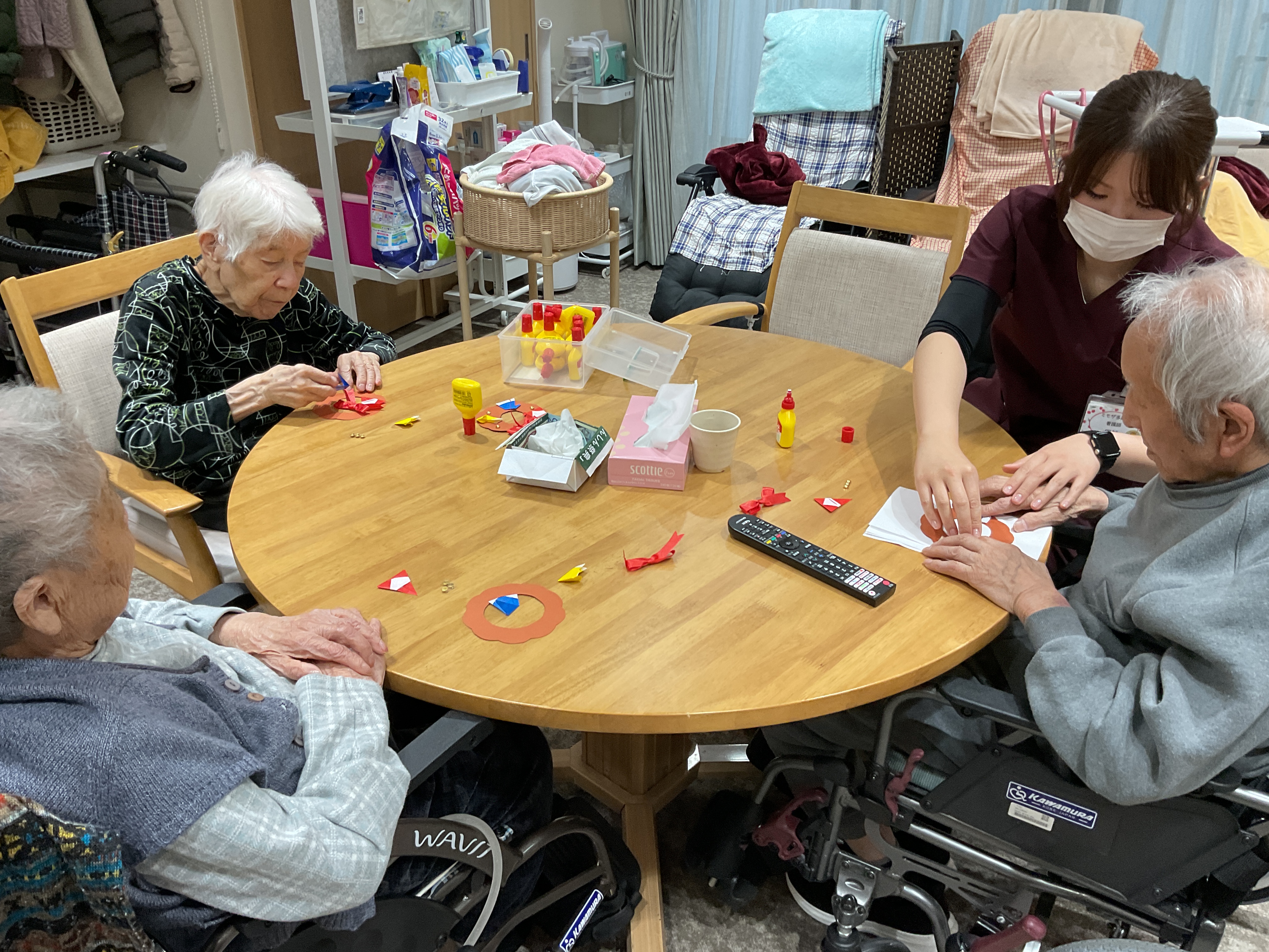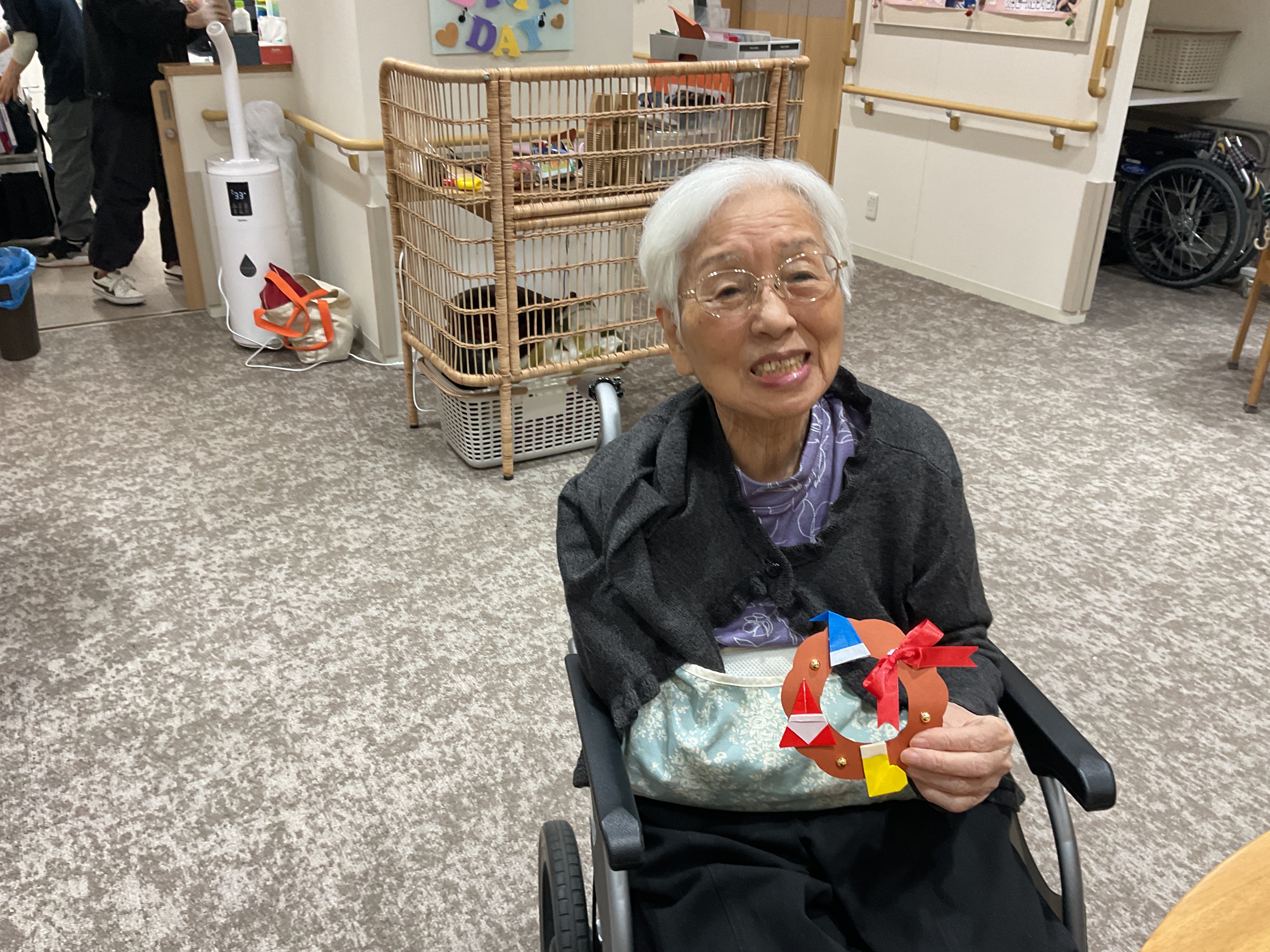 折り紙で作った【サンタの帽子・長靴・サンタさん】とリボンを貼って可愛く飾り付け✨