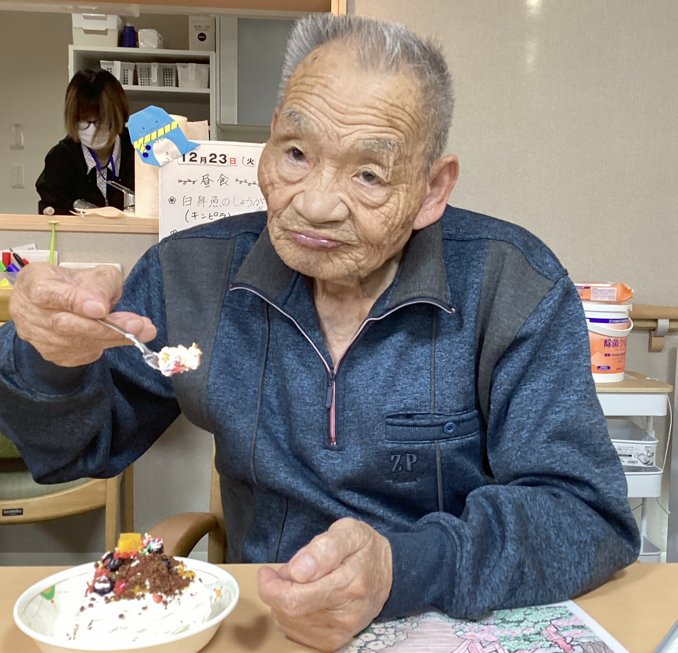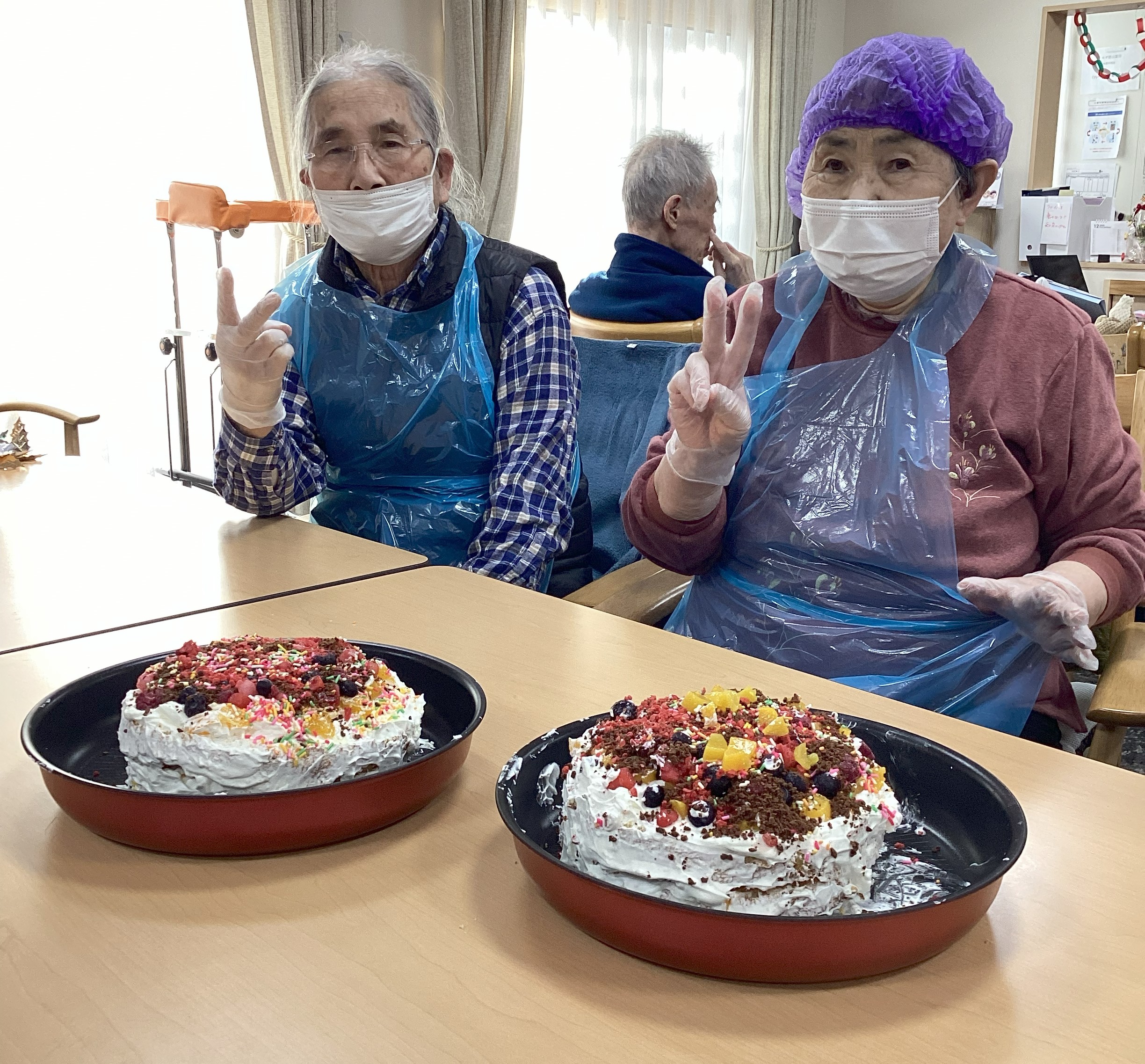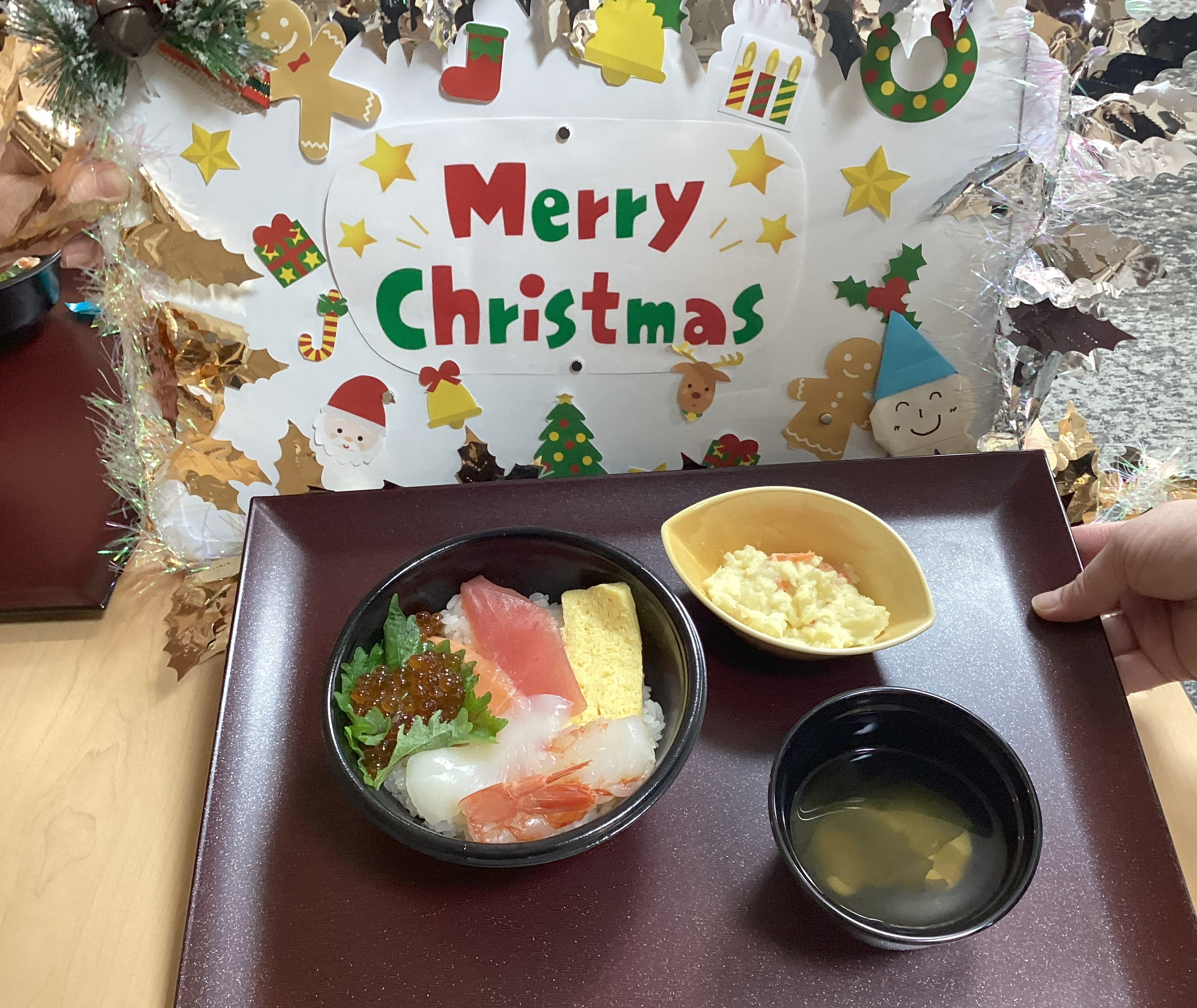 クリスマス会を行いました!皆さんで海鮮丼を食べたり、ケーキ作りを楽しまれました。 「難しいな」と話されながらも、真剣な表情でケーキを作っておられました✨ 手づくりしたケーキはおやつで召し上がられ、楽しいクリスマス会になりました!