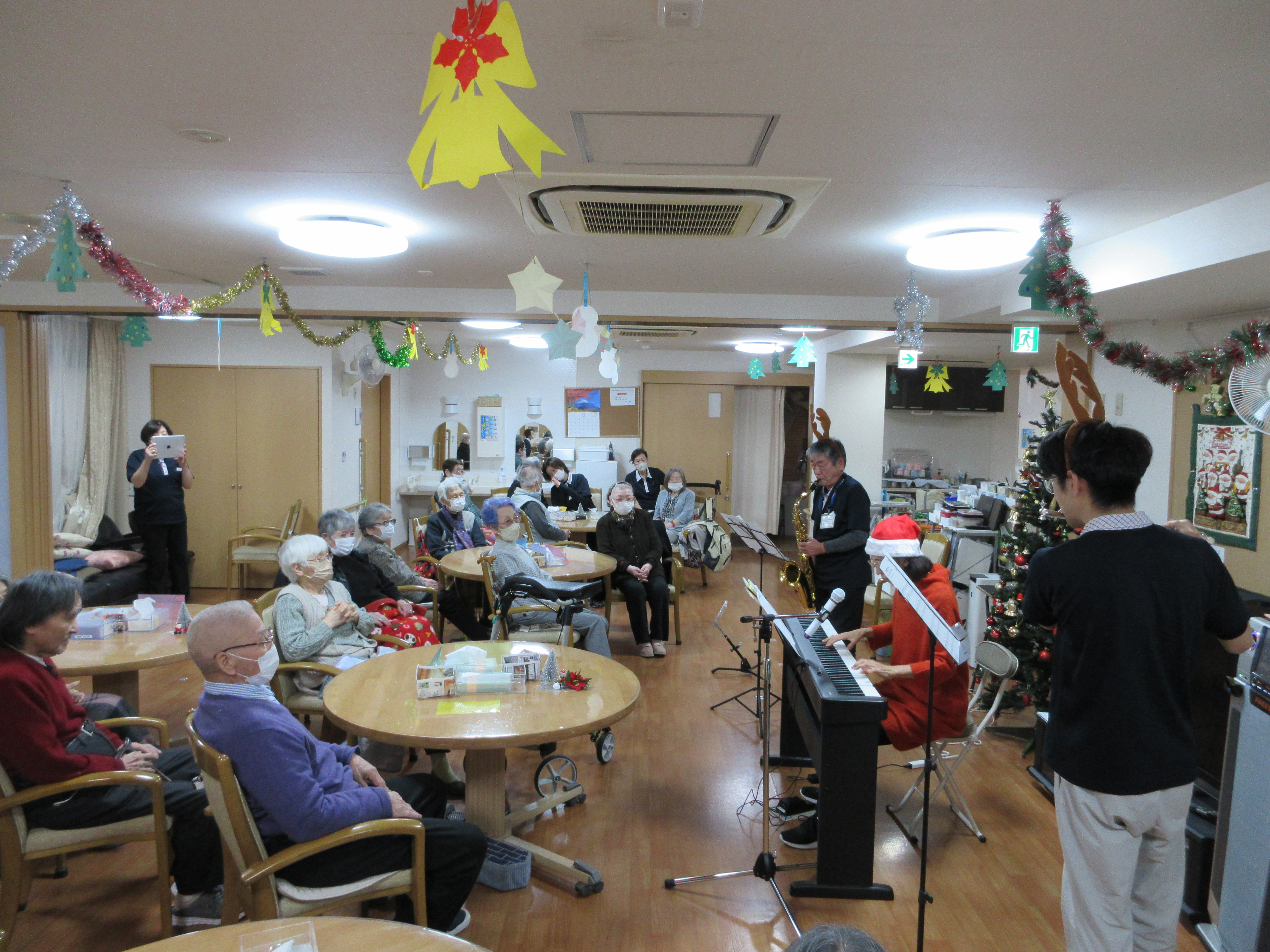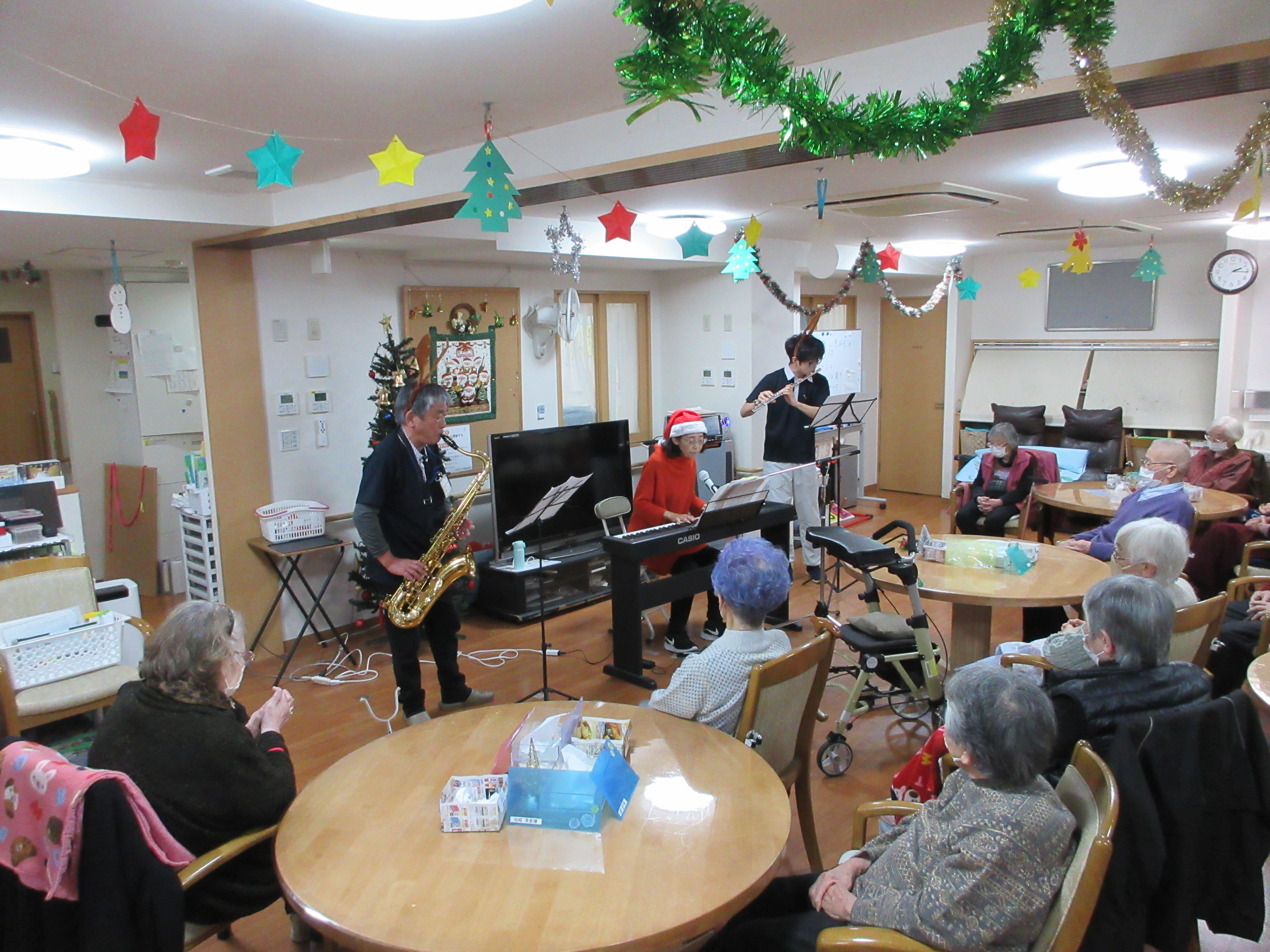 クリスマス会で演奏会がありました! サックスにフルート、ピアノとステキな音色で皆さまとても喜んでいただけました。