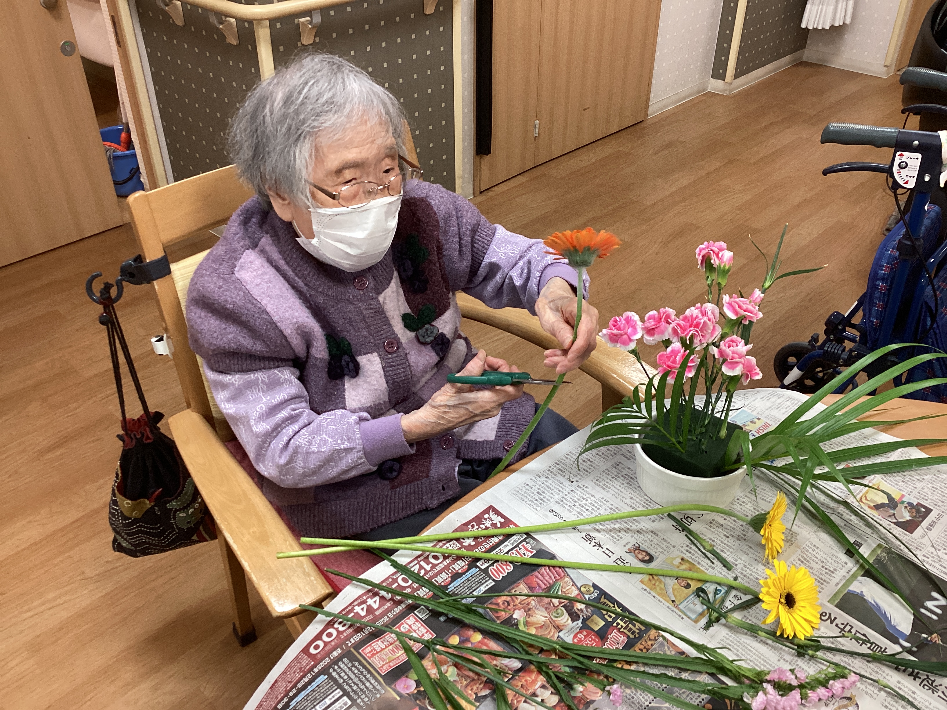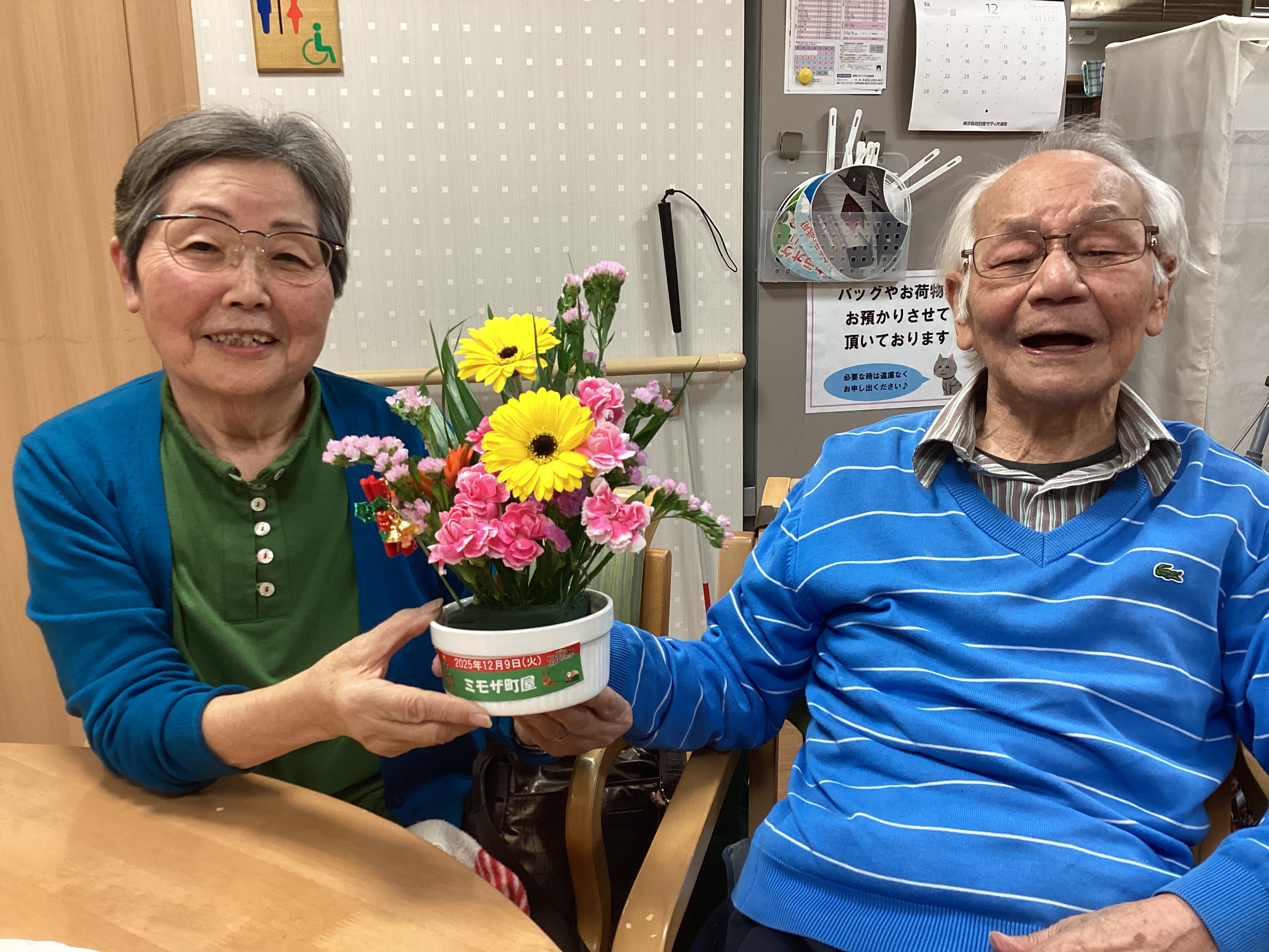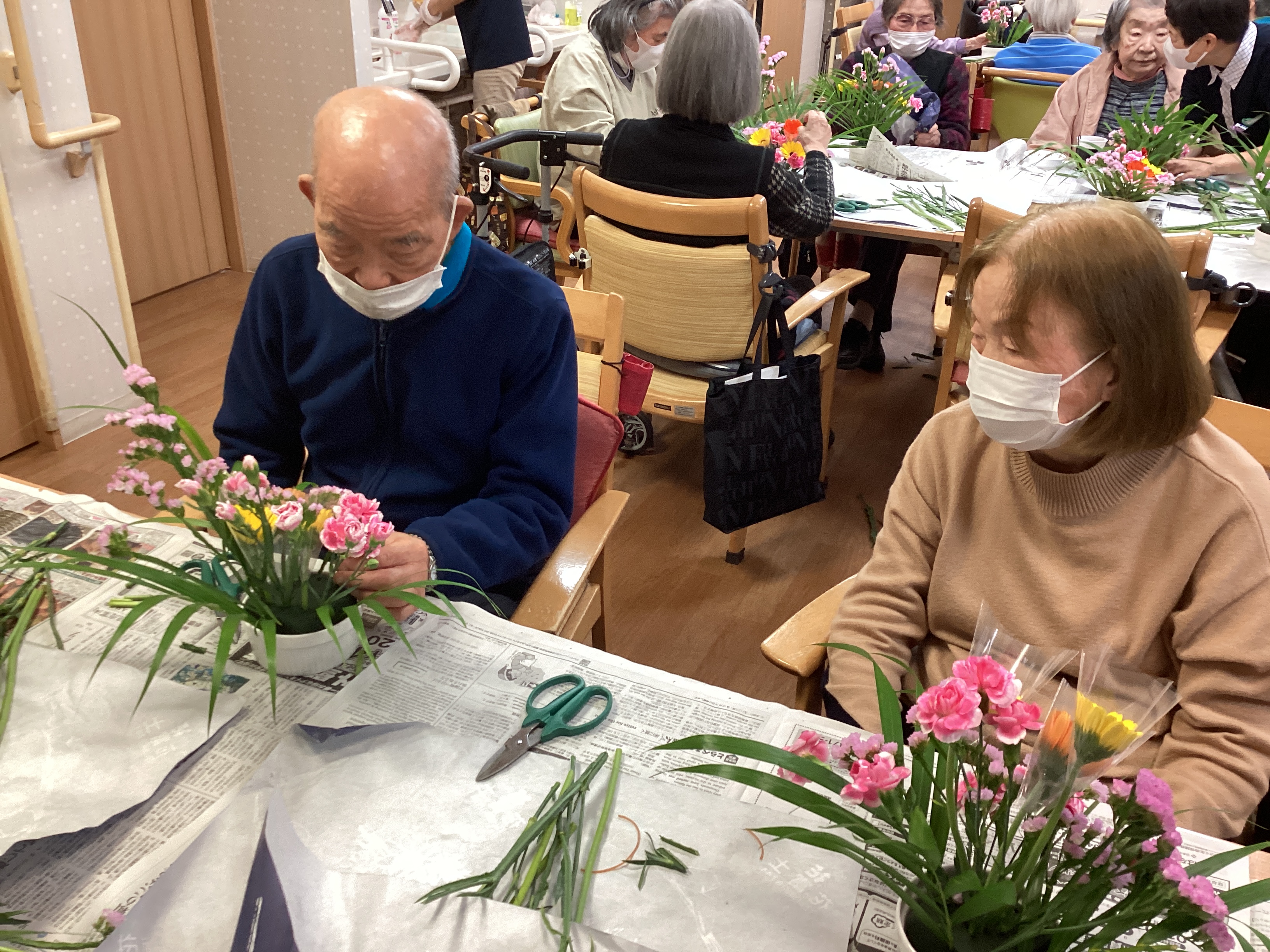 ミモザ町屋では12月9日に生花を使用して ご自宅に飾れる花飾り作成を行いました ご自身で自由に生けて頂き 完成するとにっこりとした表情を見せて頂けました☆