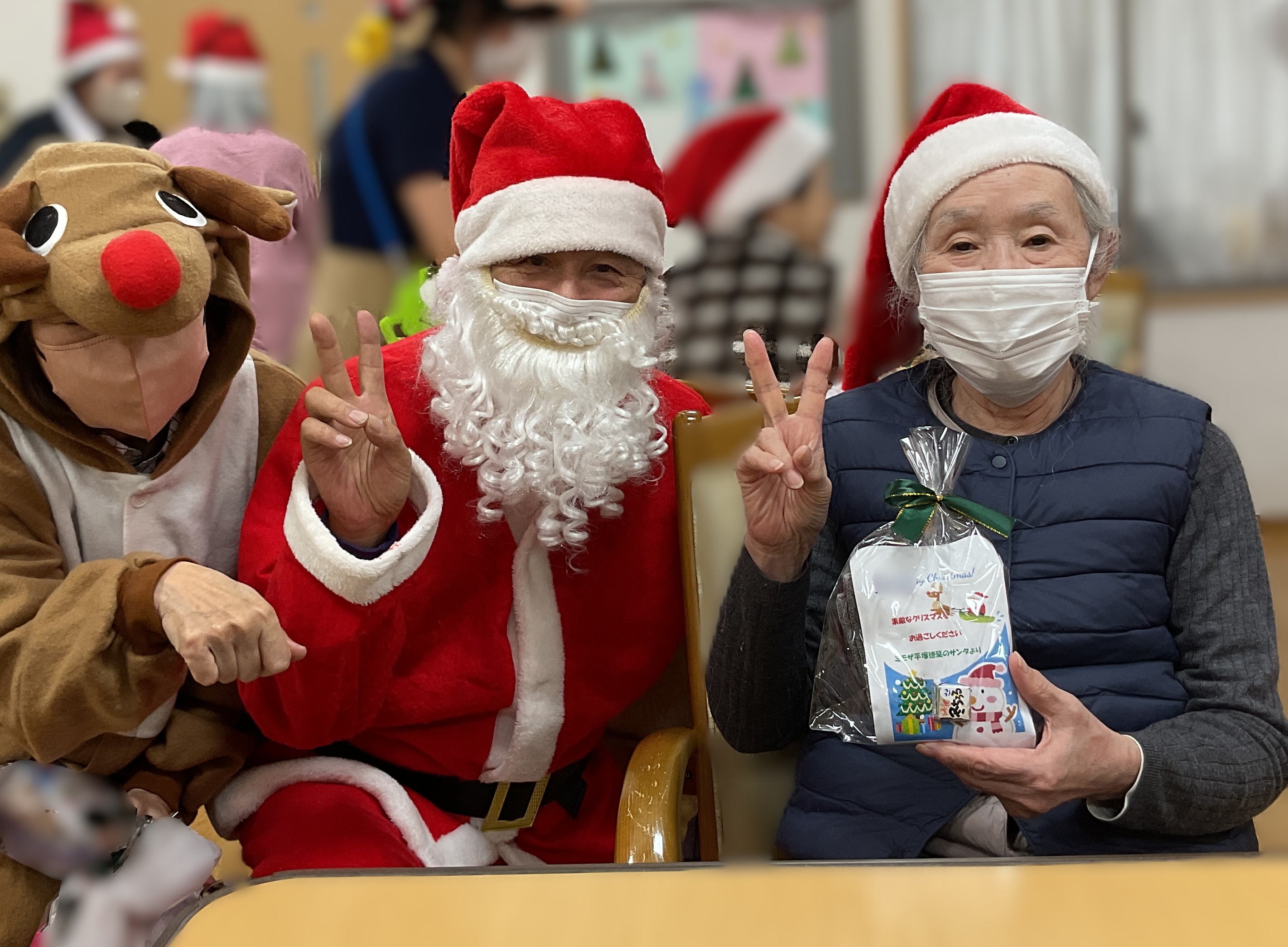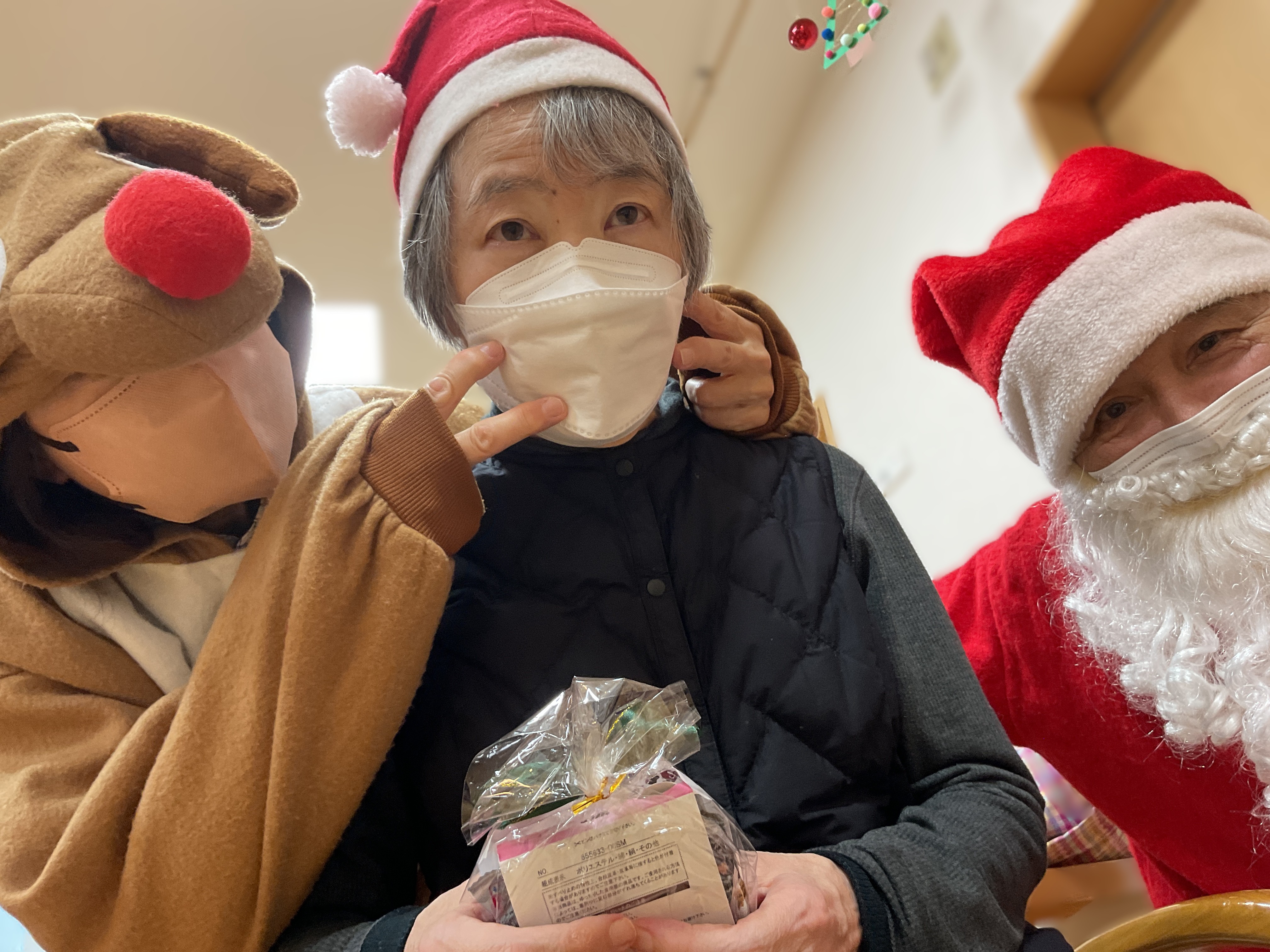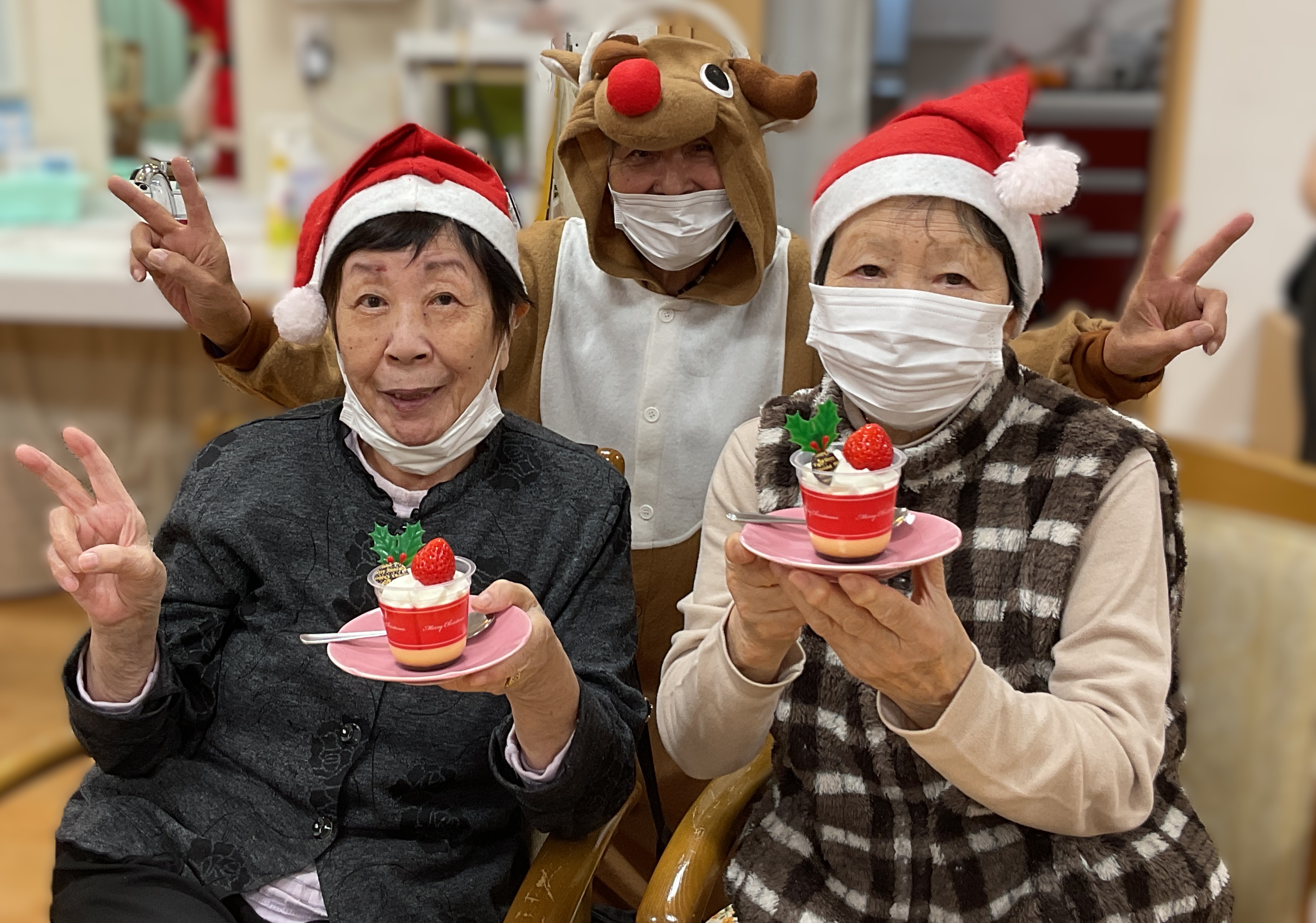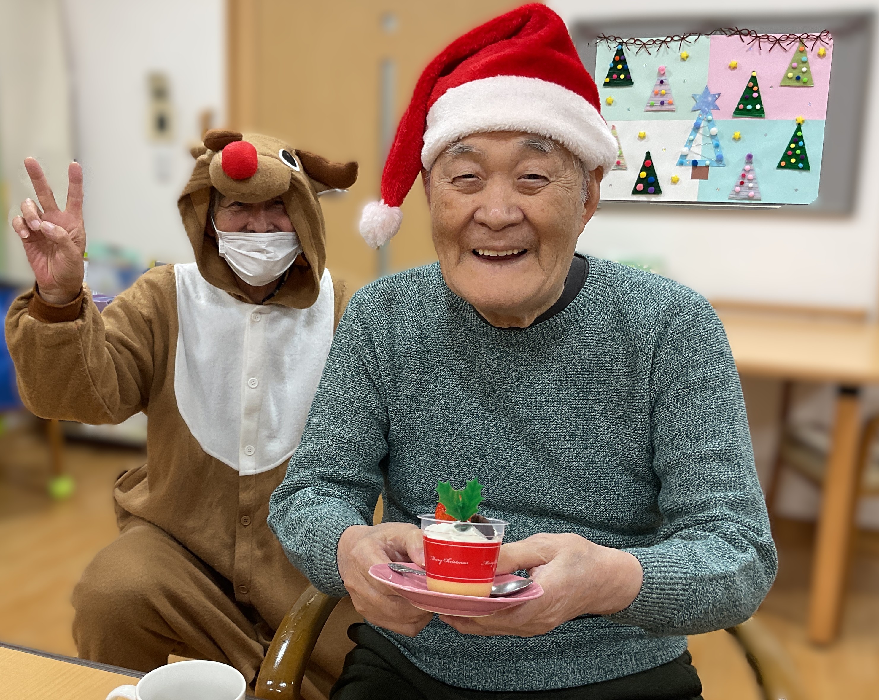サンタとトナカイがプレゼントを持って登場🎁クリスマス会を行いました♪ クリスマスケーキ(プリン)を食べ、楽しいひと時となりました🍰
