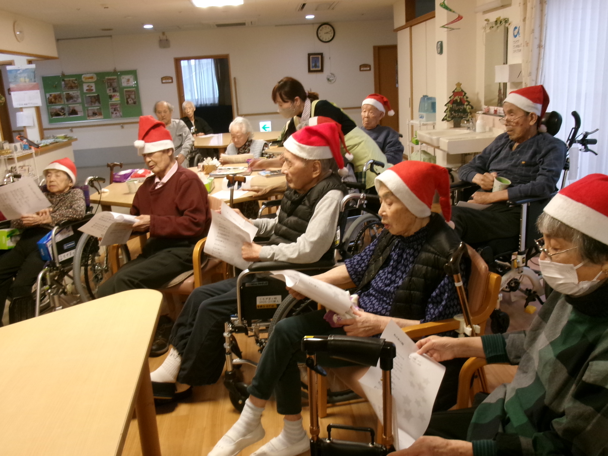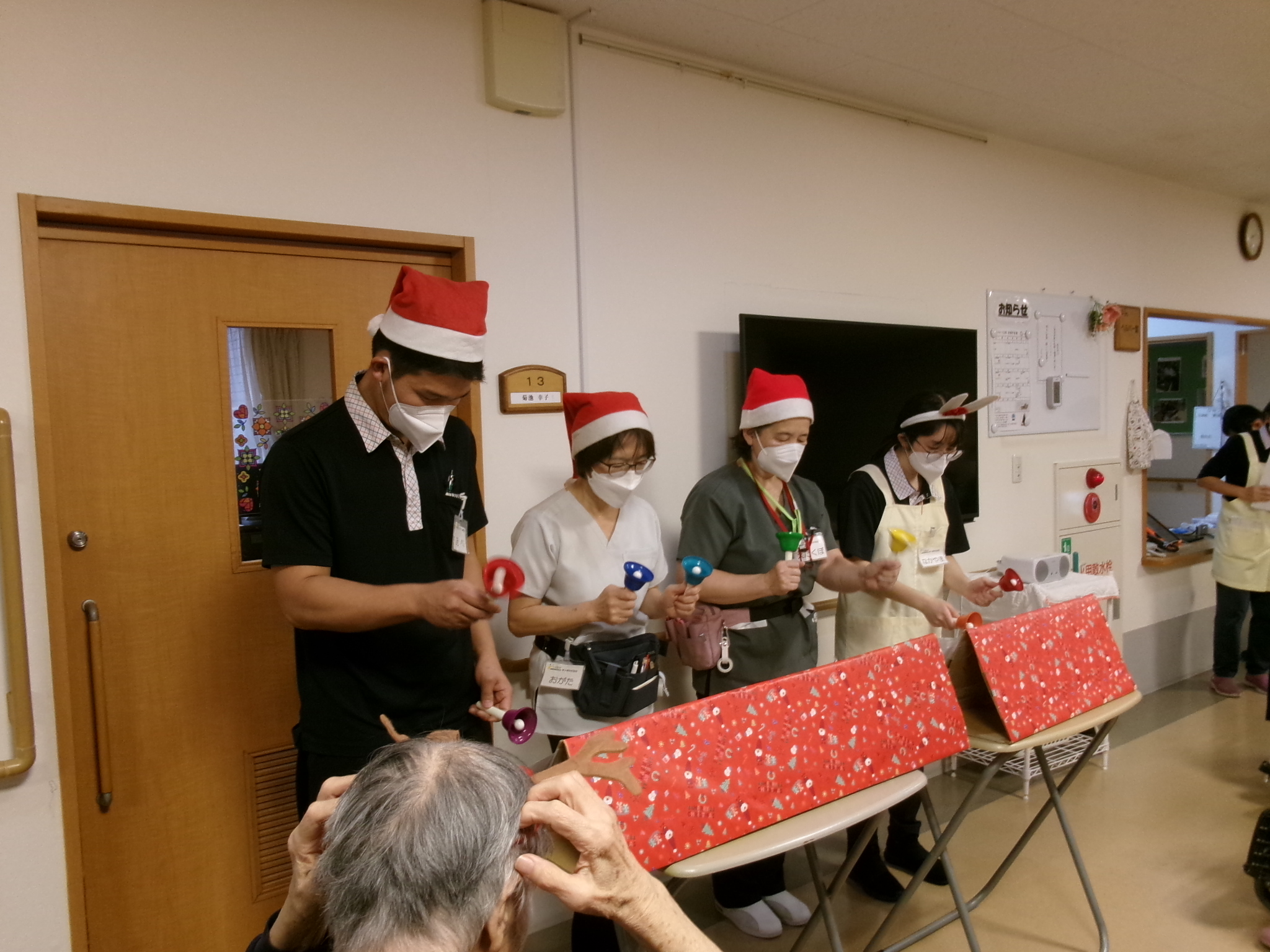 当時のお昼ご飯もクリスマスの雰囲気で。 もちろんおやつはケーキです。 職員有志のハンドベルの演奏もありました。 楽しいひと時をお過ごしいただけたかと思います。