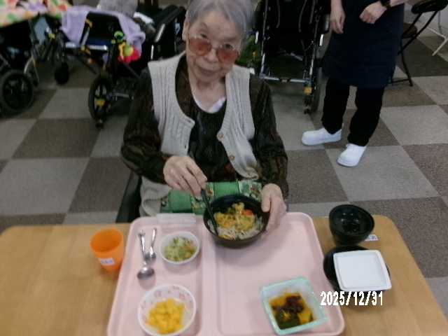 本日(12/31)の昼食 主食:かき揚げ蕎麦・副食:かぼちゃのいとこ煮・浅漬け・フルーツ かき揚げが大きくて、皆さん口々に『美味しい!』と言っていました。