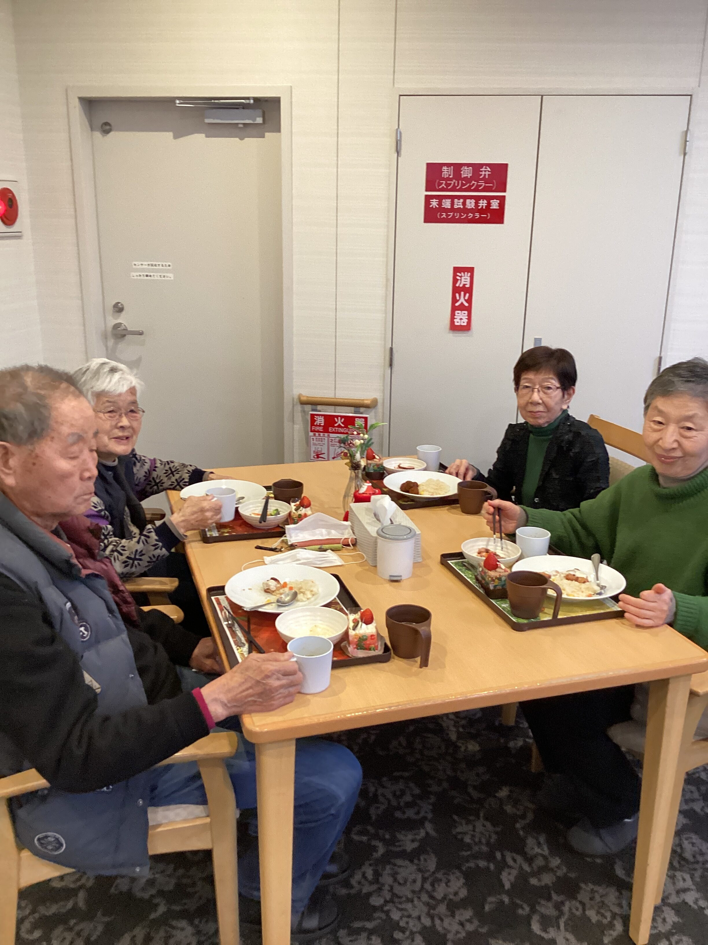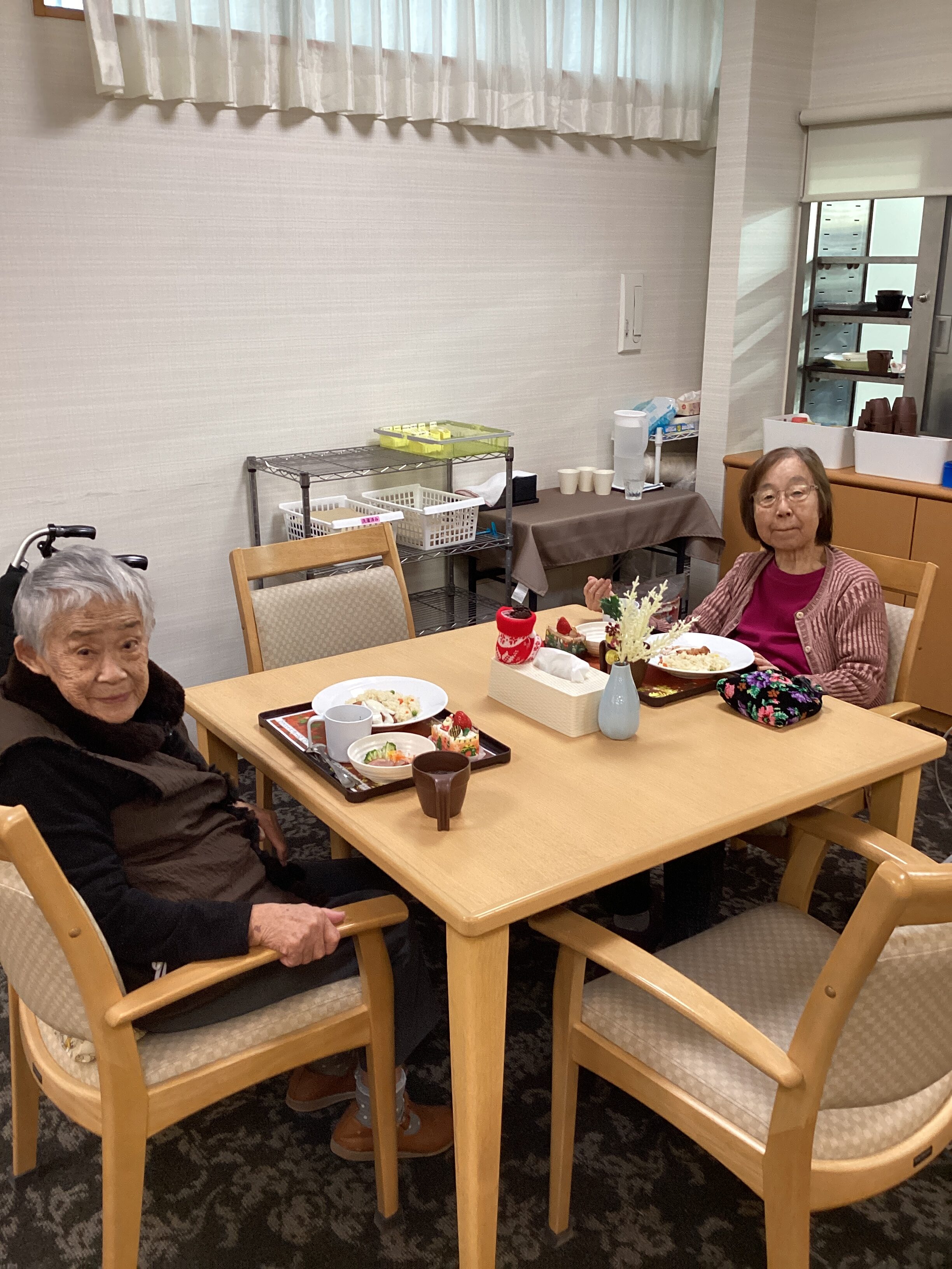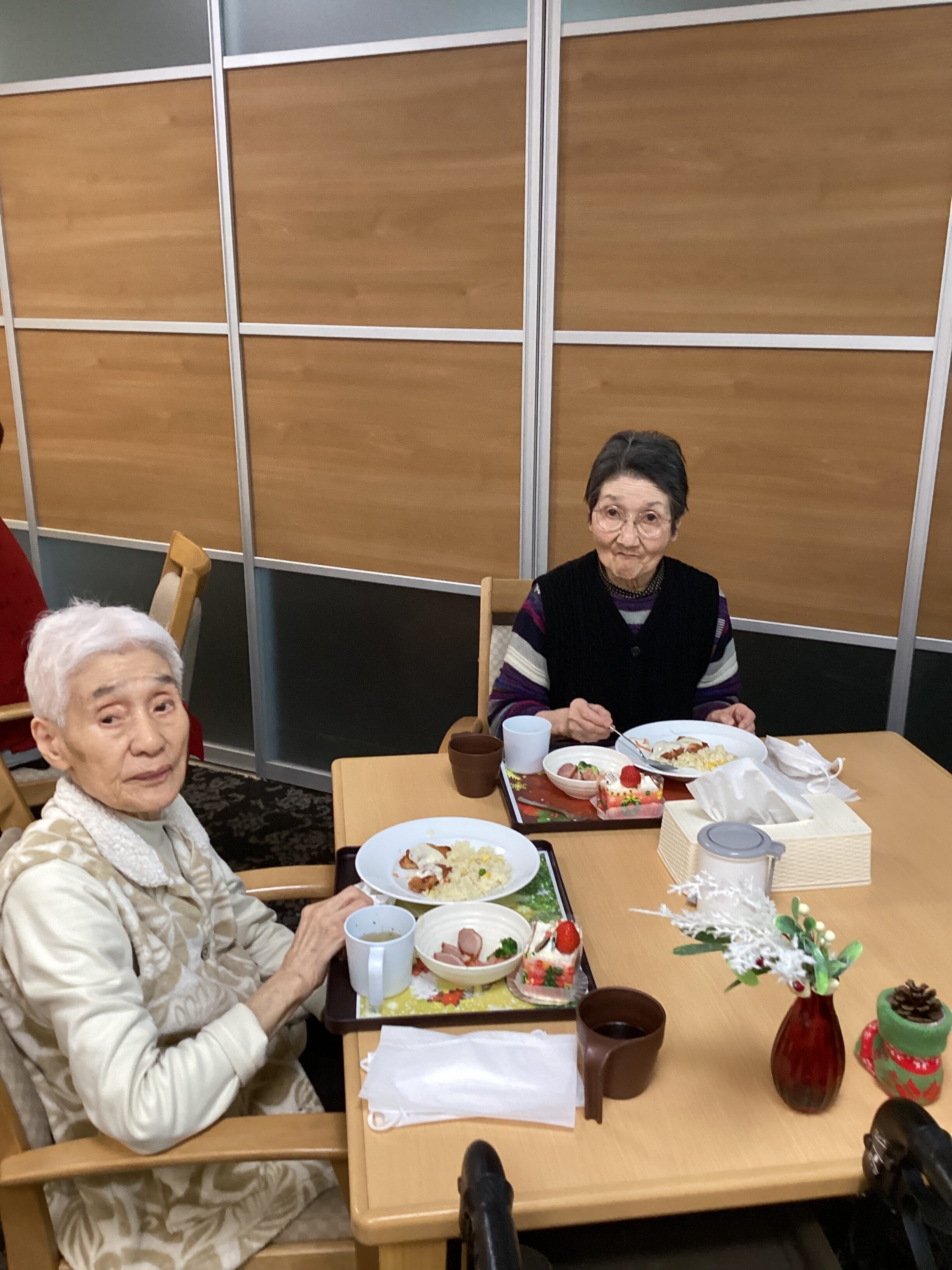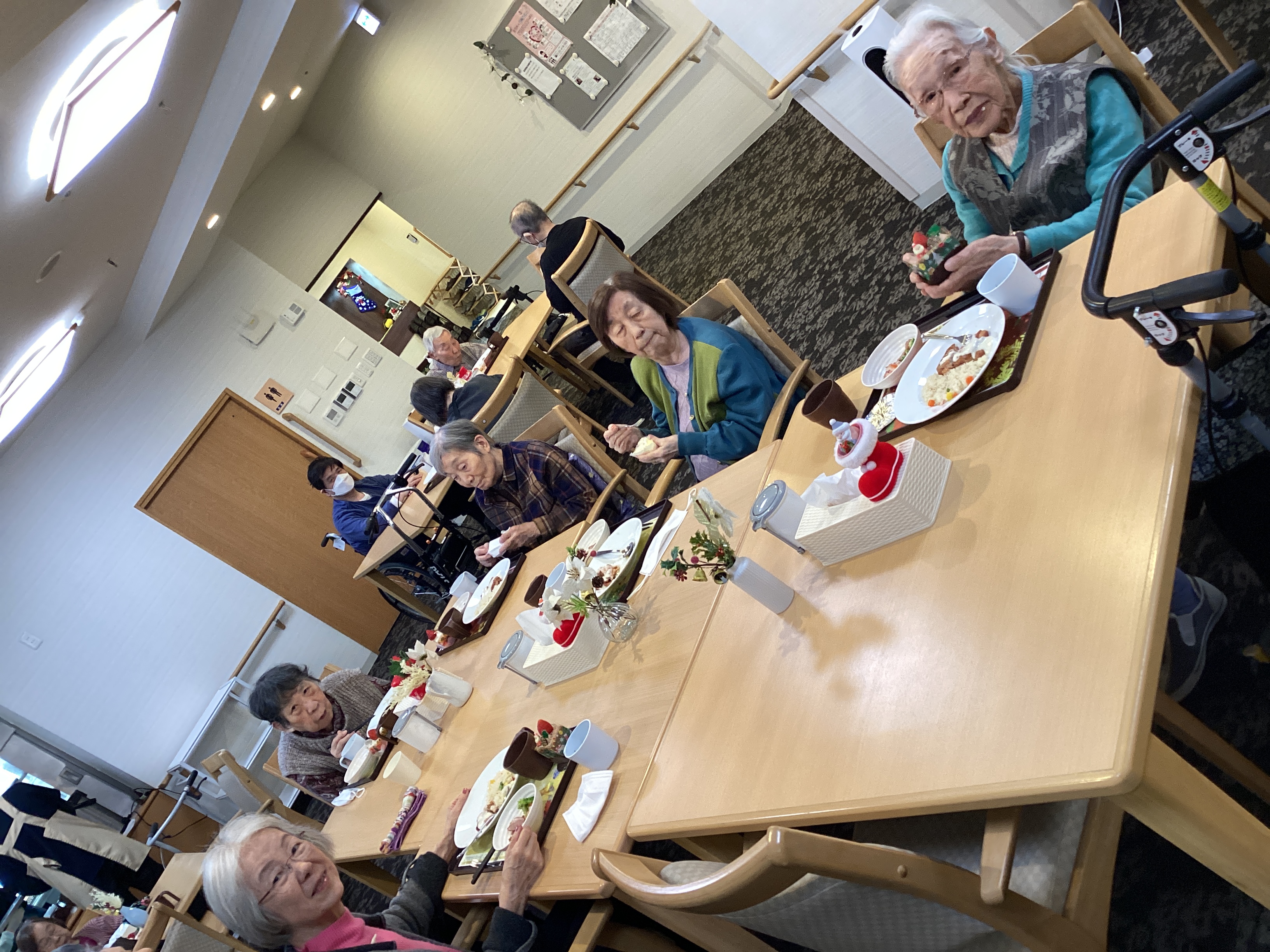 昼食メニューはクリスマスプレート👏豪華ですよね👍ケーキもクリスマス仕様になっており、皆様の表情が緩んでいました。量が多いので残す方もいらっしゃいましたが、ケーキだけは別腹のようでした💦楽しんで召し上がっていただけたので良かったです😆