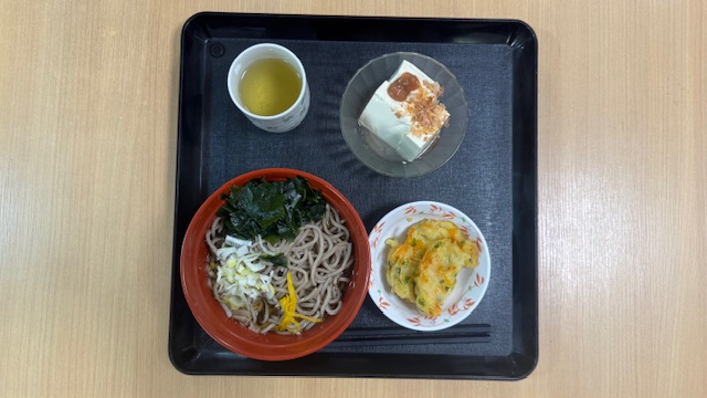 温かい蕎麦にねぎ・わかめ・柚子のトッピングです