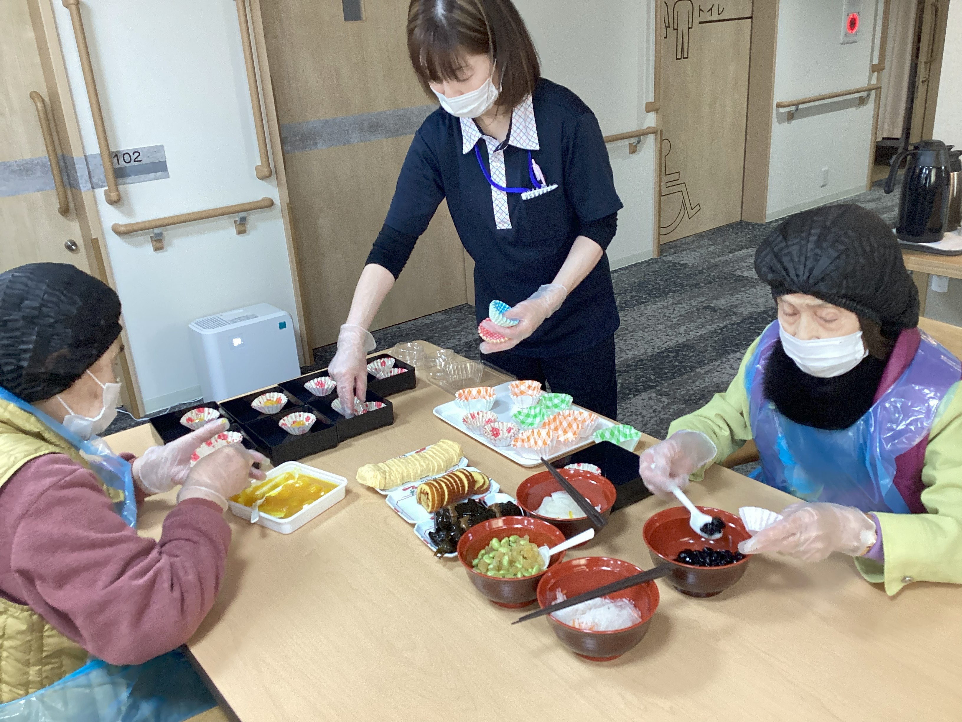 新年あけましておめでとうございます。今年も皆様が楽しく過ごして頂けるよう職員一同精進して参ります。 本日は元旦ということでご利用者とおせち料理を作り、食べて頂きお正月を感じました!