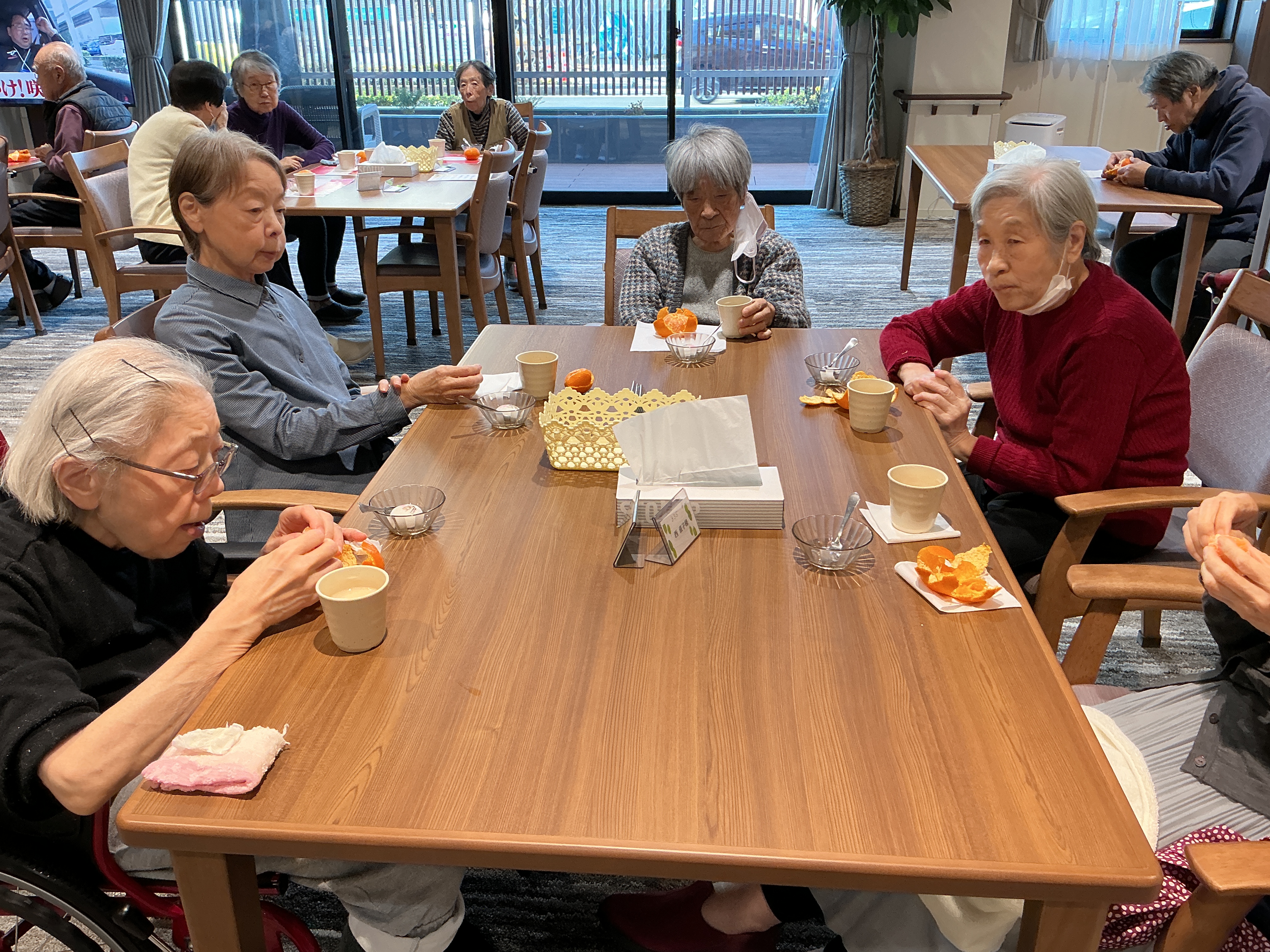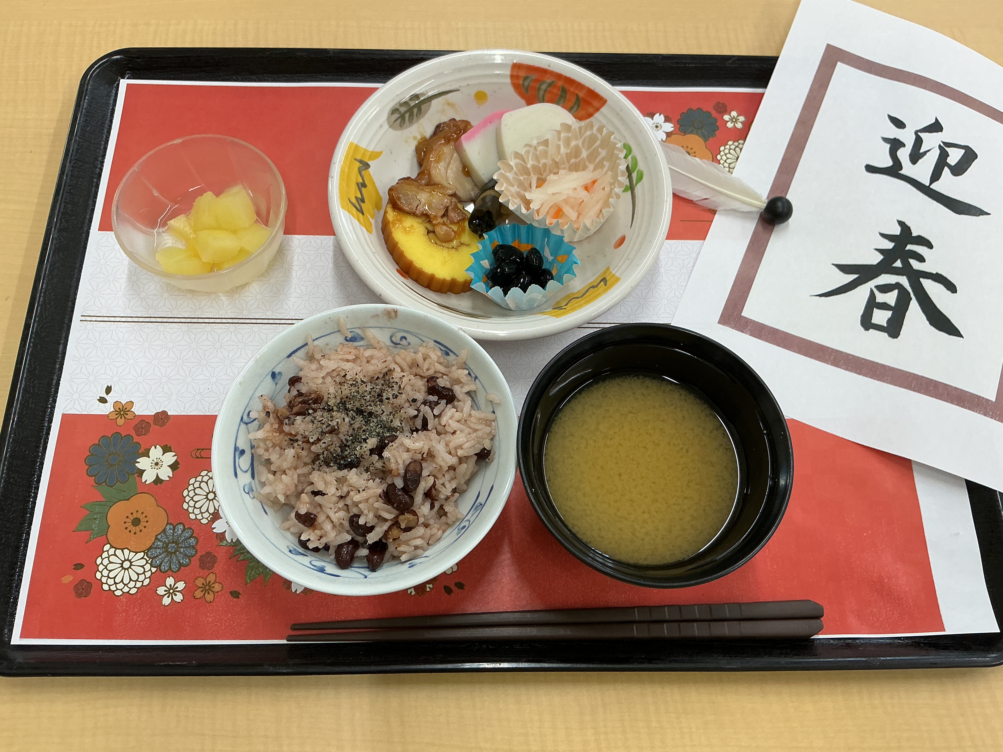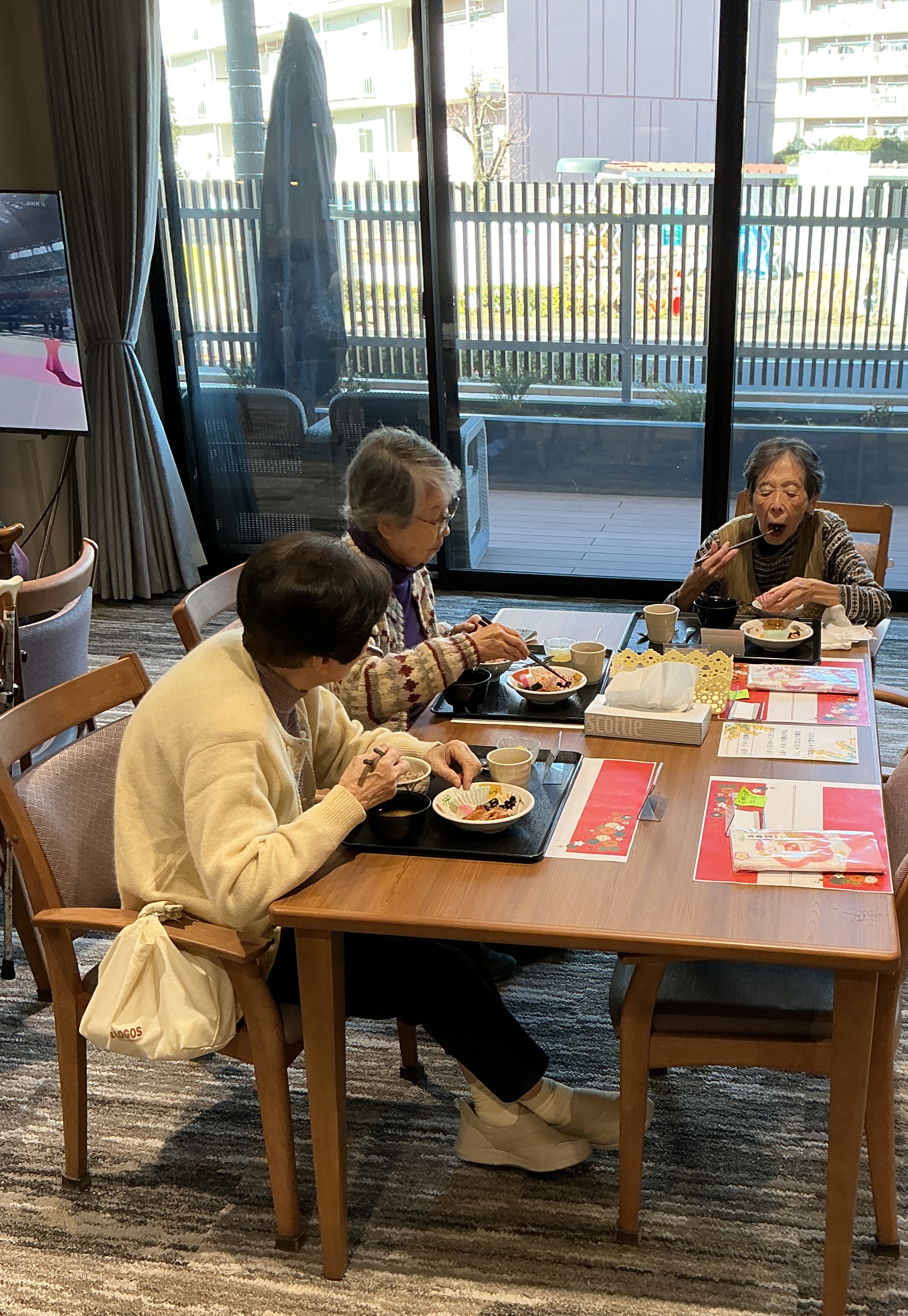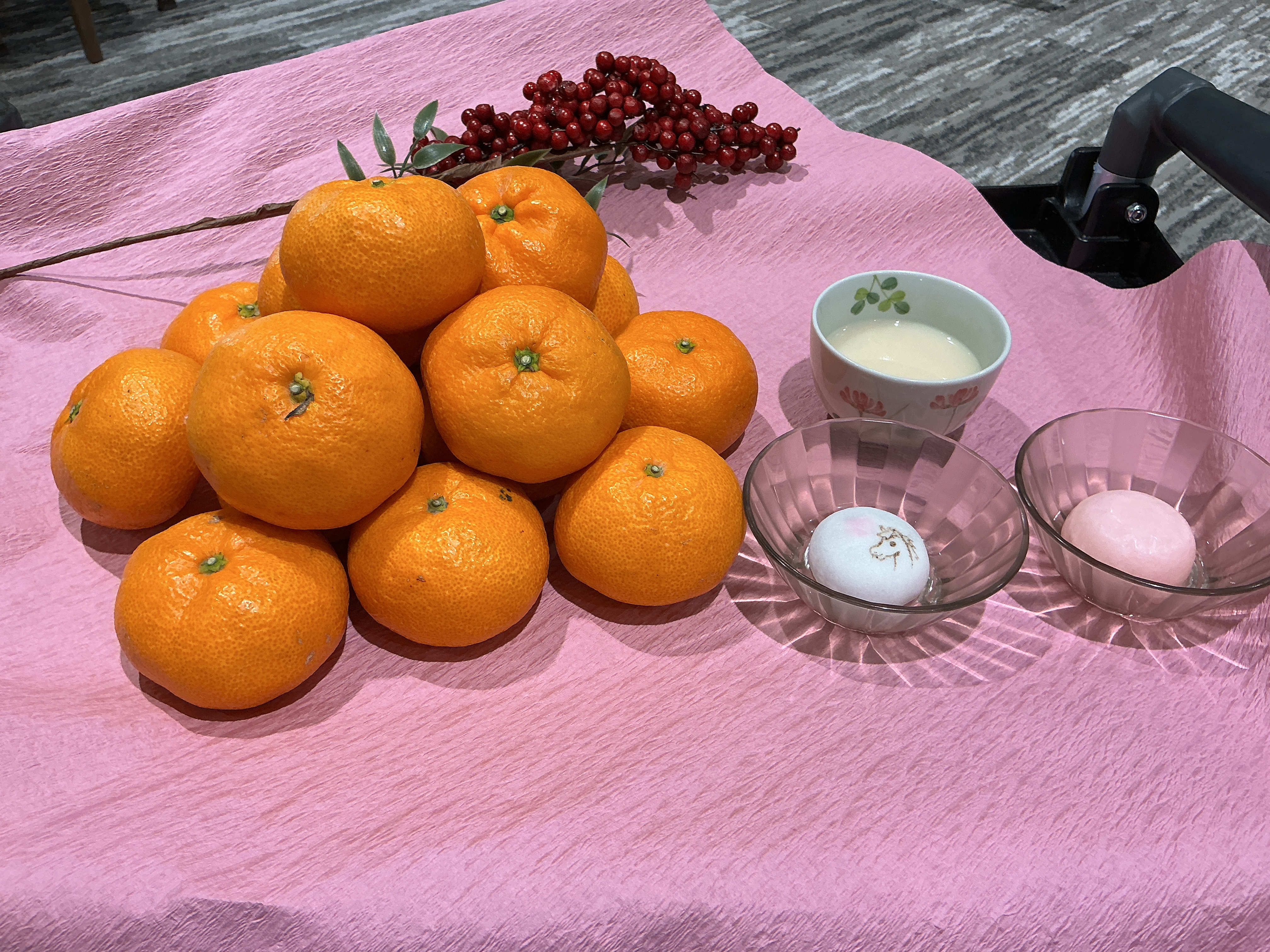 新年明けましておめでとうございます。上尾むくのき苑も初めてのお正月を迎えることが出来ました。 今年も日々の関わりを大切にしながら、穏やかな時間を過ごしていただけるよう努めて参ります。おせち料理や甘酒、みかんを囲みながら笑顔溢れるひとときの風景です。
