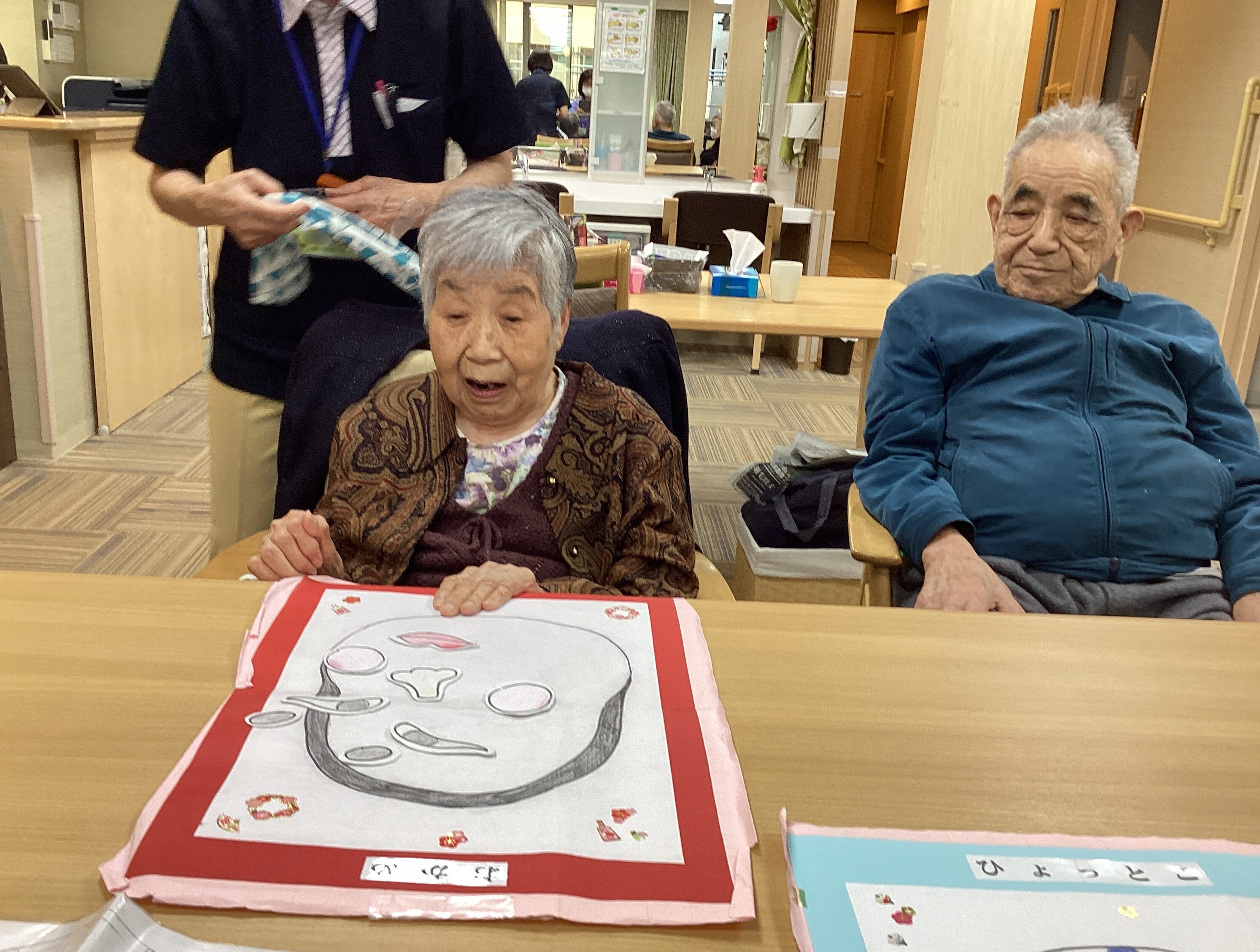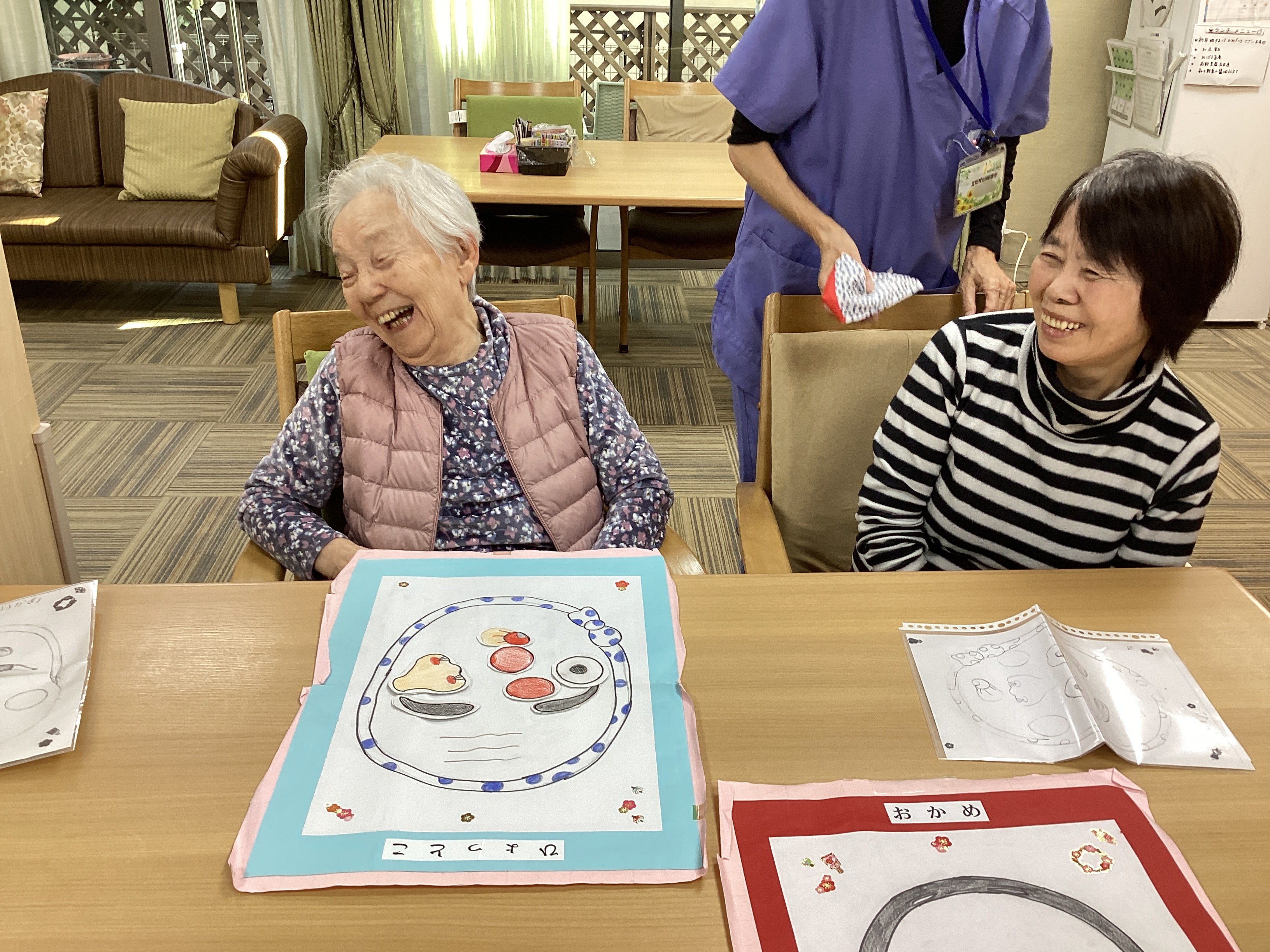 新年 明けましておめでとうございます🎍本年もどうぞ宜しくお願い致します。本日の昼食はおせち料理とお雑煮を召し上がっていただき、お正月気分を味わいました!レクでは福笑いをし笑い声あふれる楽しい時間に😊笑顔いっぱいで新しい1年を迎える事ができました✨