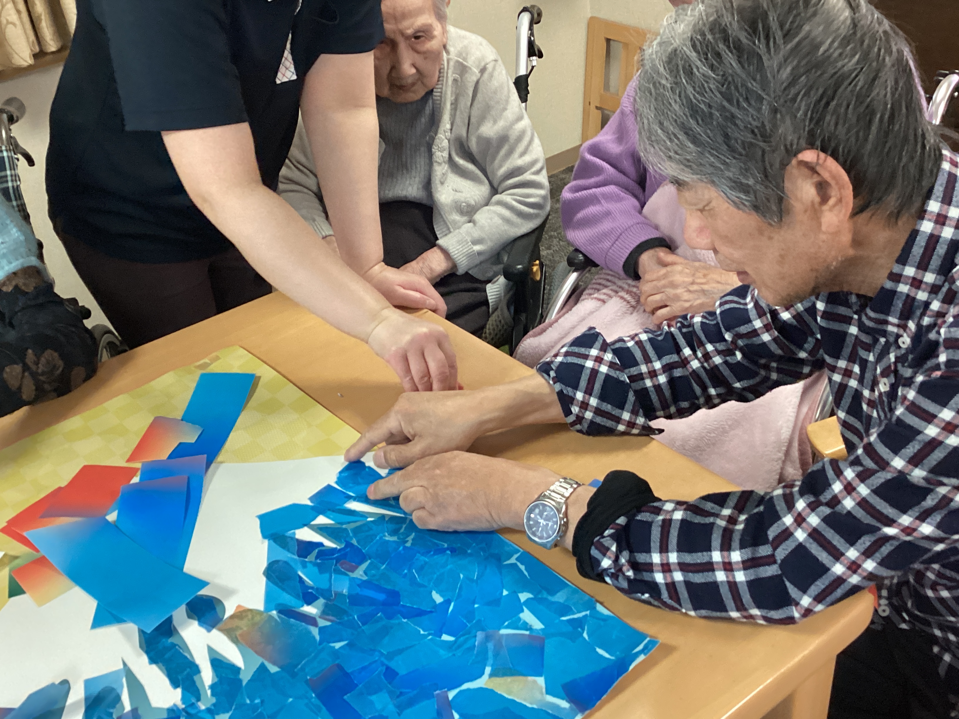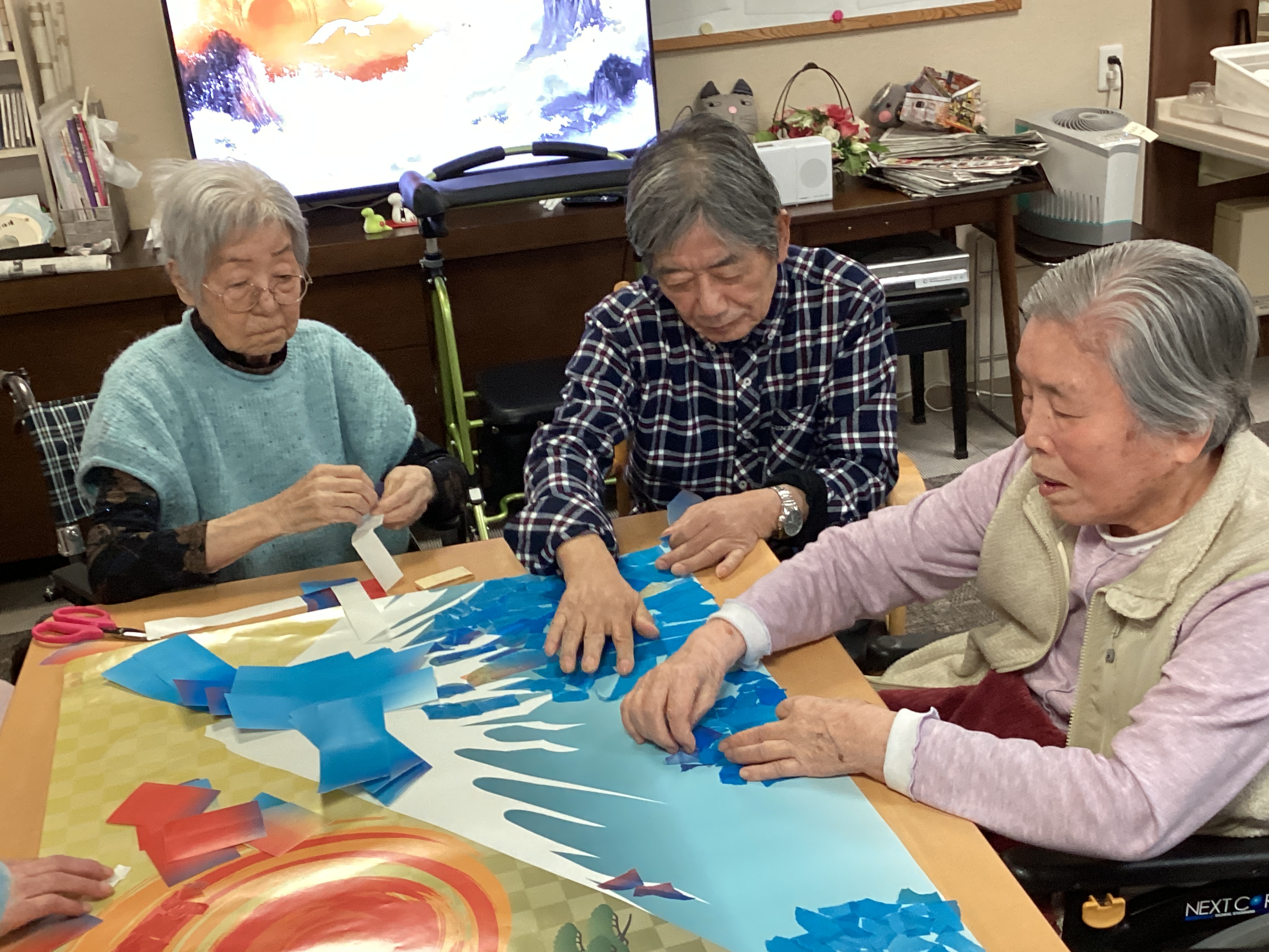 新春の日の出、富士の山の壁紙を皆で作成しました。 紙を切って張って、立派な景色を完成させることができました(*^^*)
