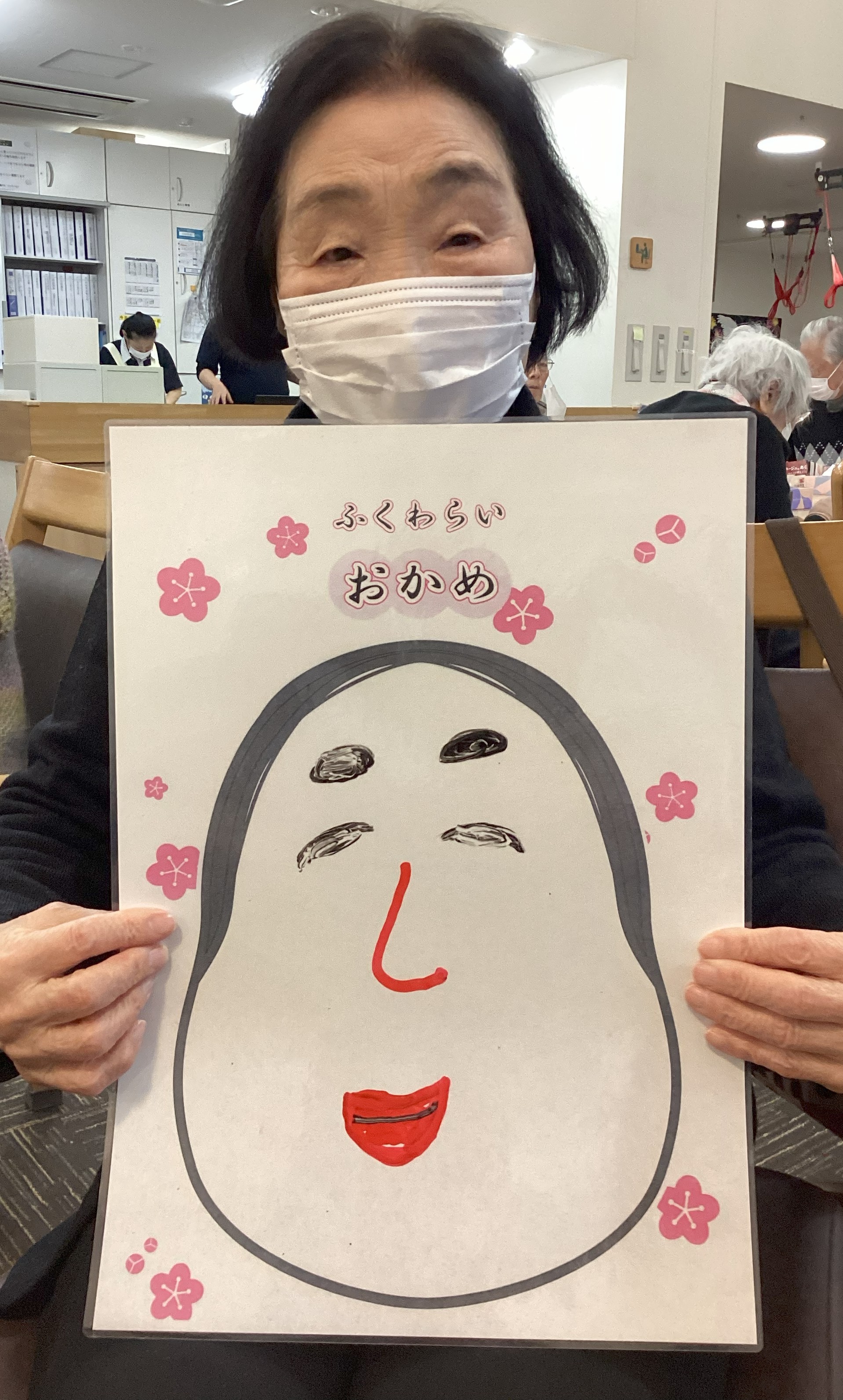 年始のレクリエーション活動で、【ひょっとこ】と【おかめ】を作成しました。 お祭りのBGMを流しながら、楽しく作成ができました♪ オリジナリティが溢れていますね。