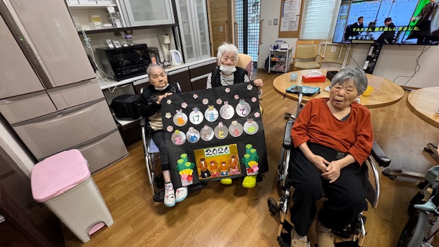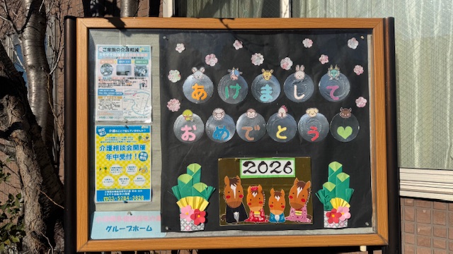 1月になり外看板を張り替えました。 2026年は午年なので、今月は午がメインで、 午以外の十二支がいる作品となりました。
