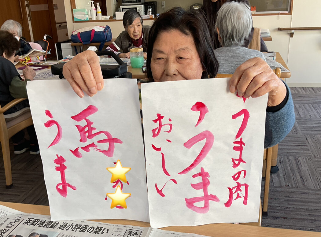 年を越し早くも一週間が過ぎようとしています。皆さん変わらない笑顔で来所されました😊おせちを食べたりそうめんで団子を作ってみたり、顔彩を使って今年の干支の漢字を書いたりいいスタートを切れました🐎職員もご利用者もみんなで「健康」を大事に頑張ります!✨