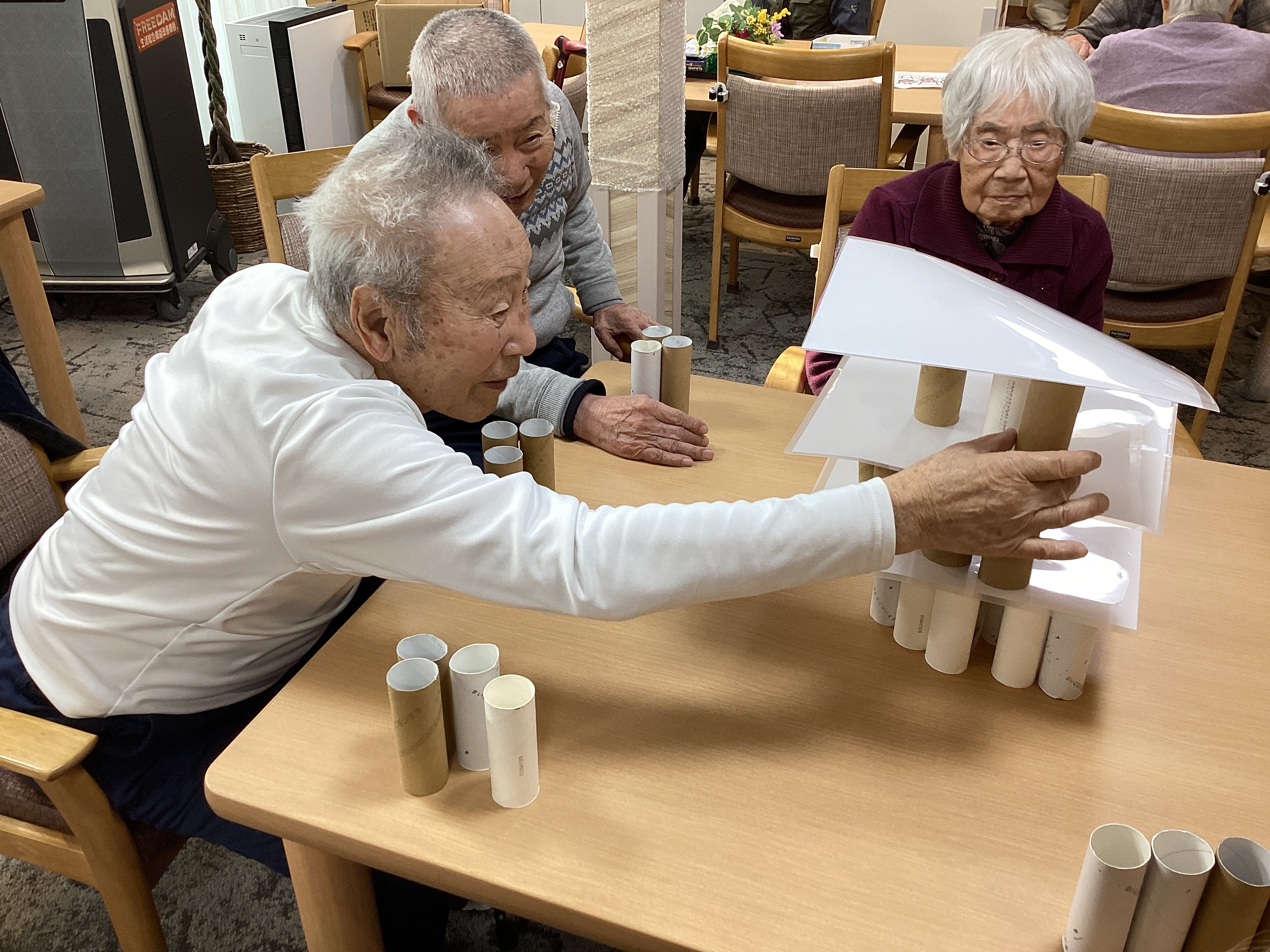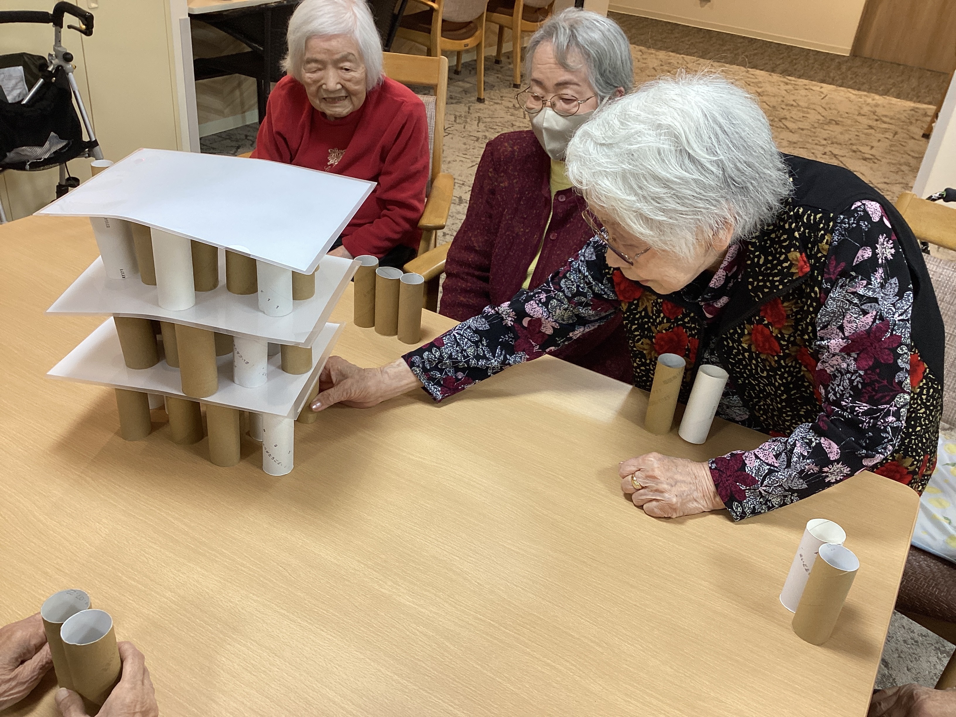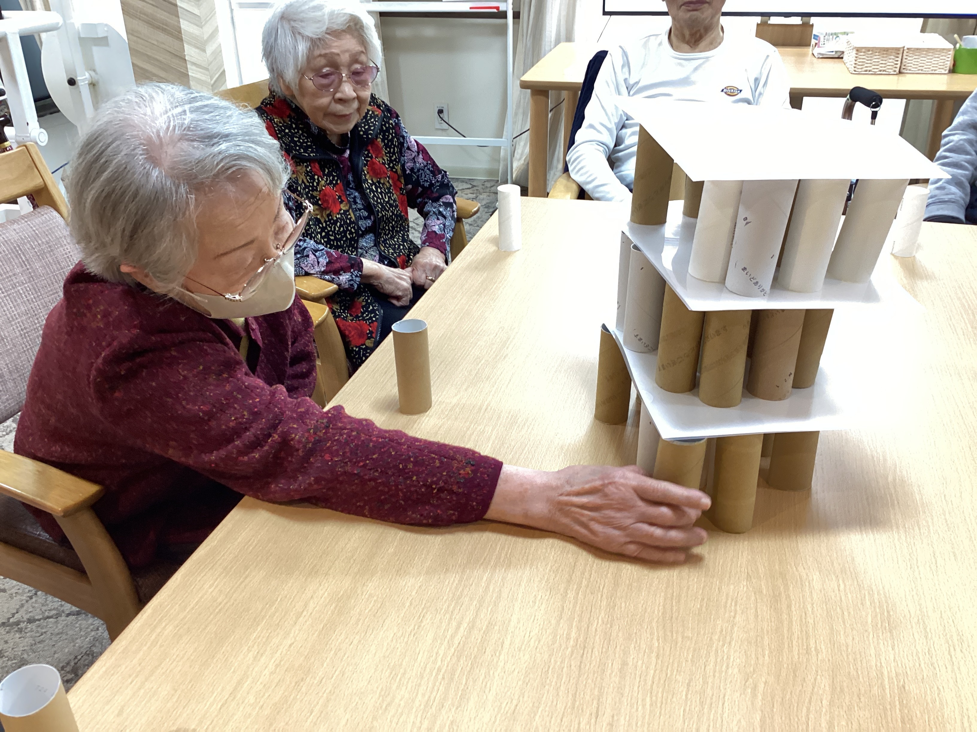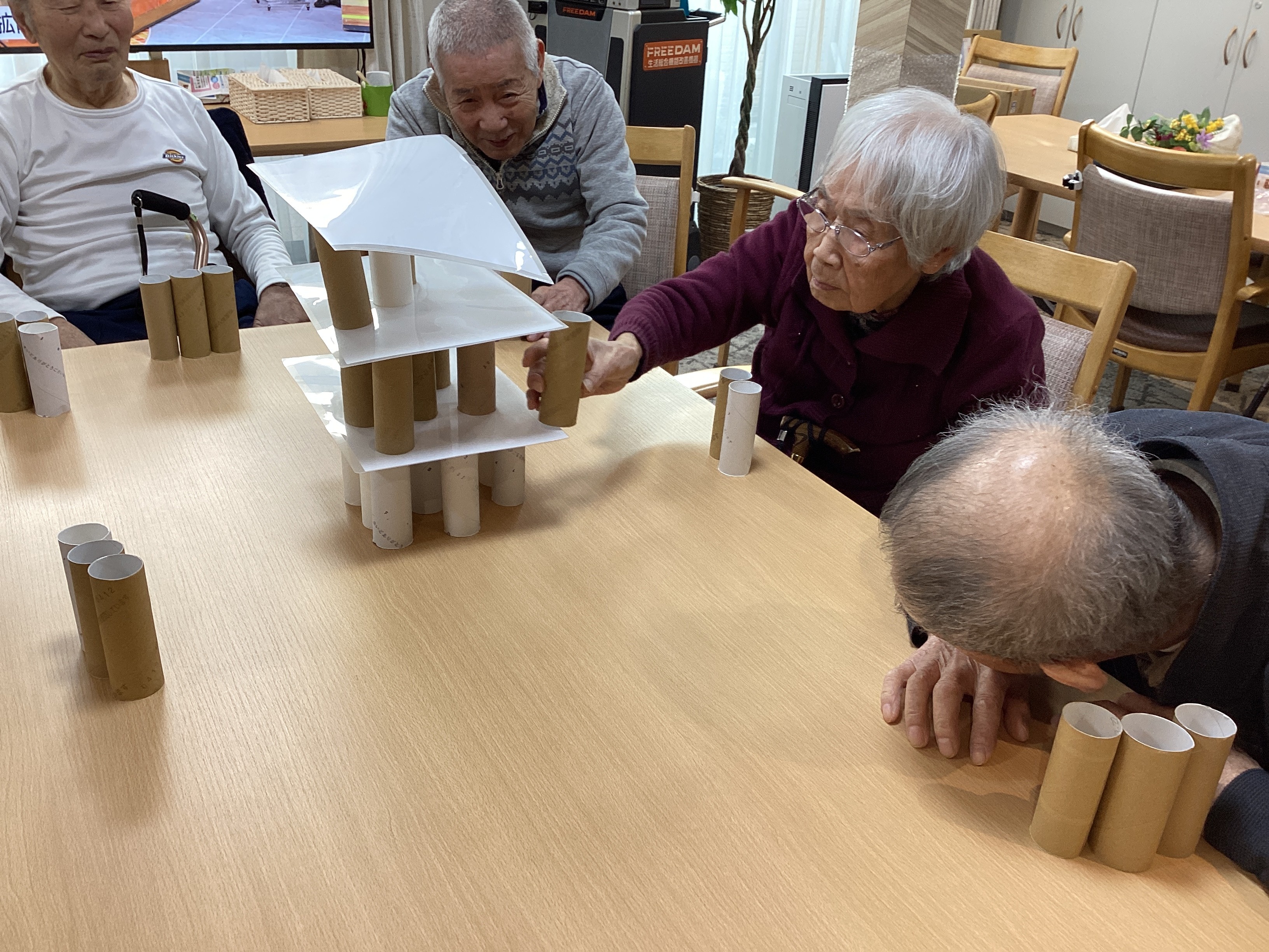 トイレットペーパーの芯とクリアファイルを使ってタワーを作り、芯をお一人ずつ抜いていくゲームを行いました。 芯を抜くたびに「おぉ~~!」と歓声があがり、崩れる瞬間は笑いと拍手で大盛り上がりでした!! シンプルなゲームですが皆さま楽しんでいました✨
