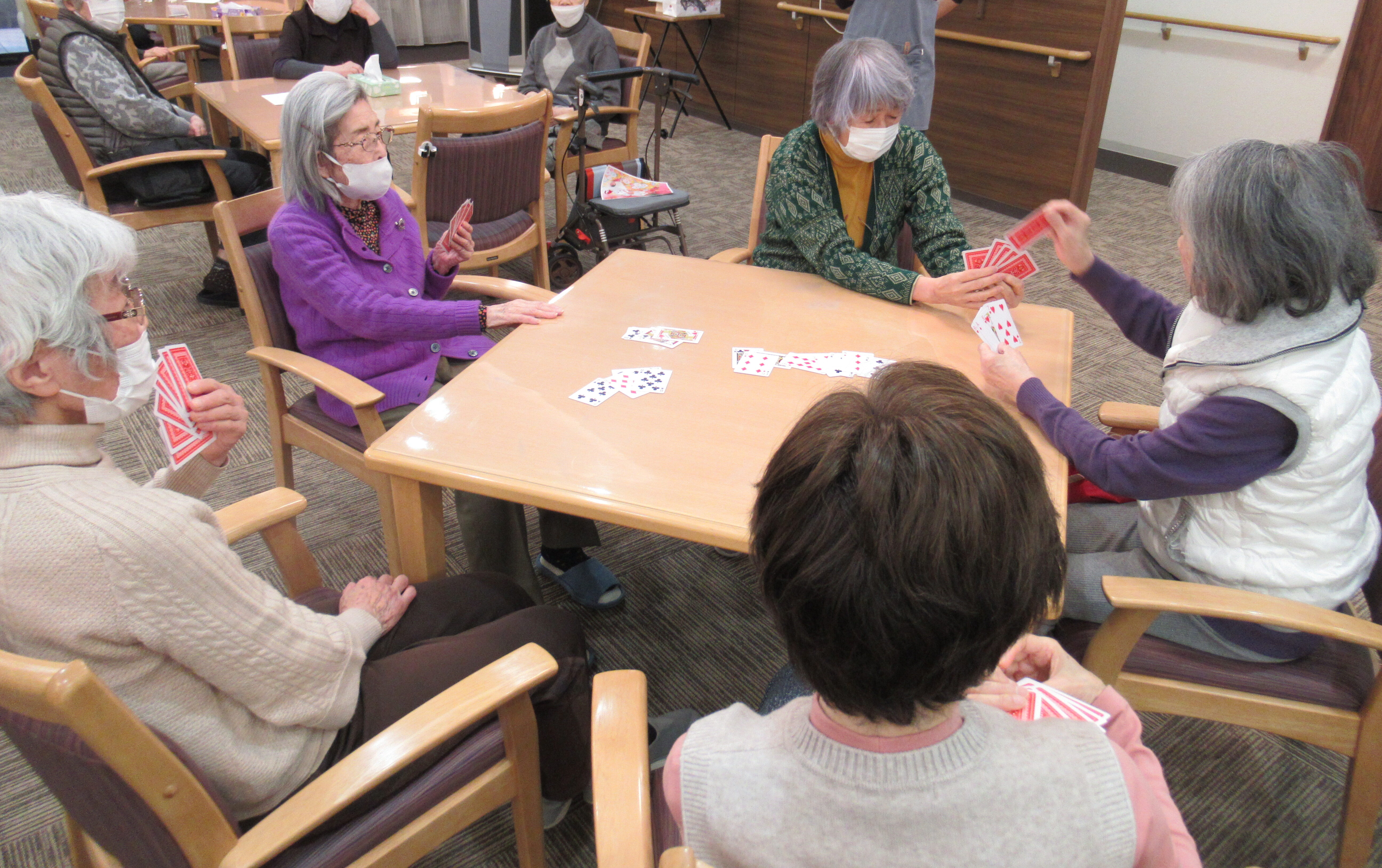 本日は新年会でした。おみくじを引いたり、手作りの温かい甘酒を飲みながらババ抜き大会を行いました。1位から5位までの方は景品をゲットされました。