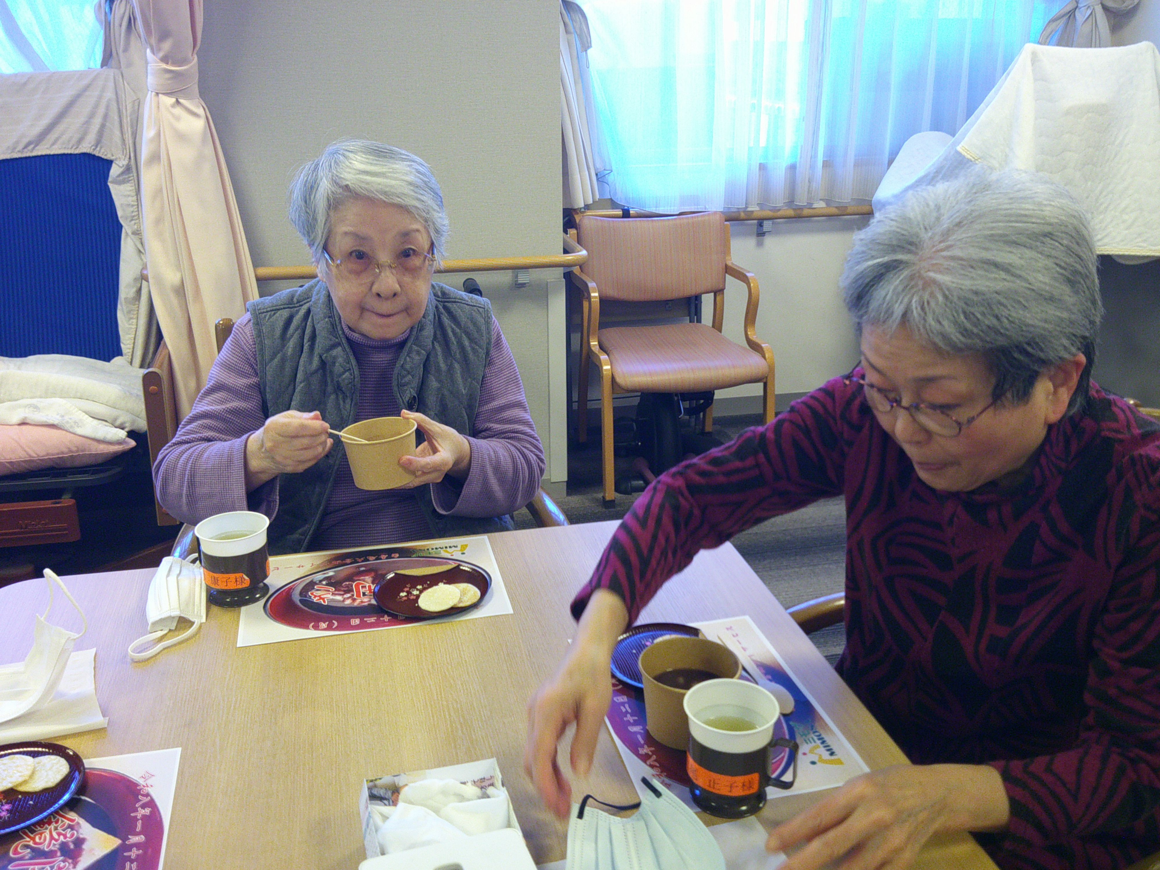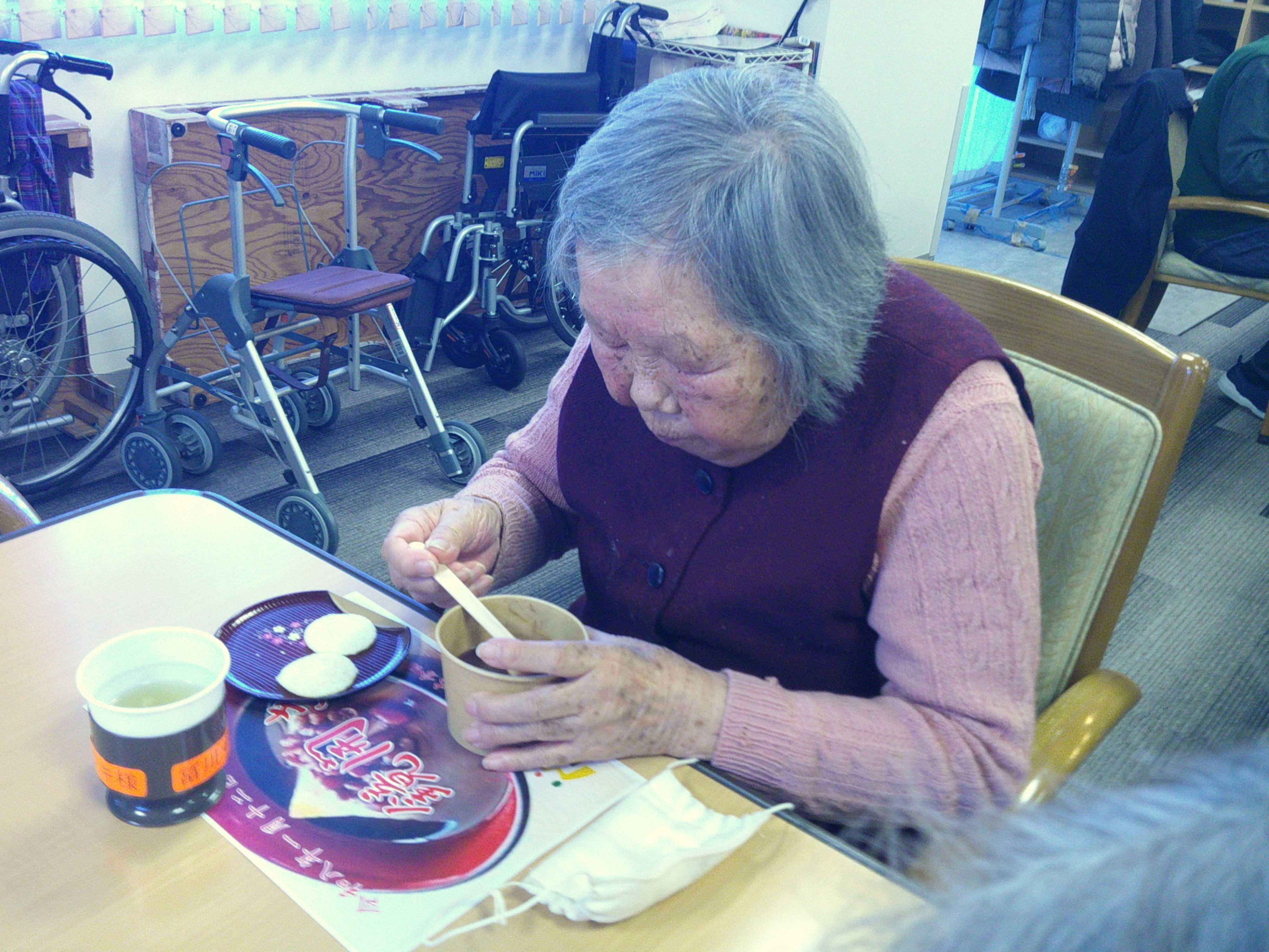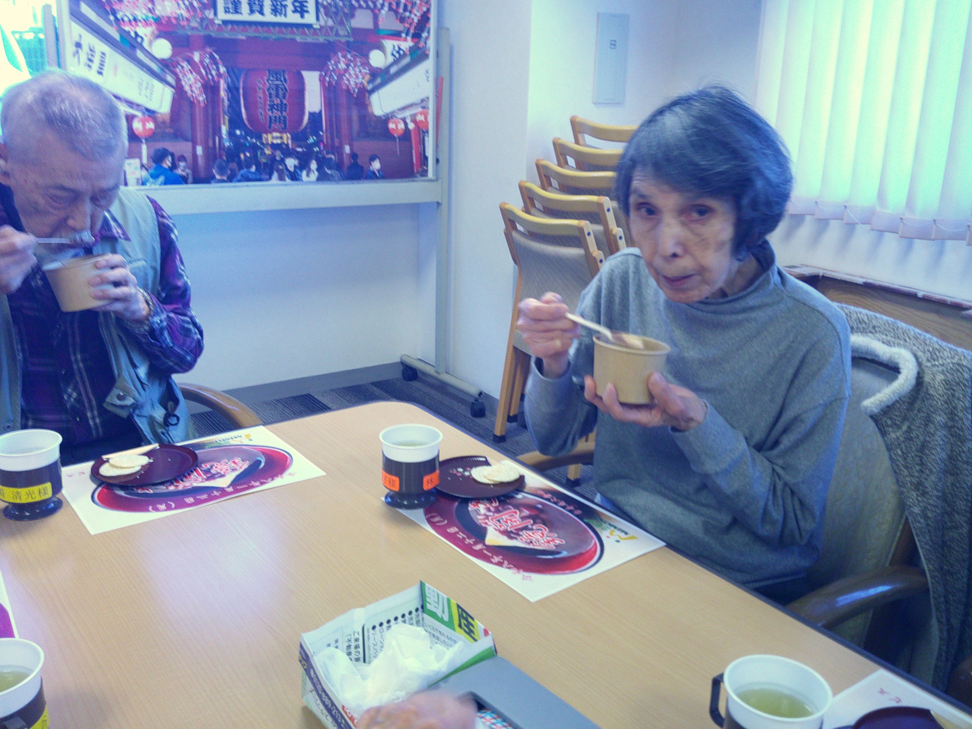 しっかり体操でお腹を空かせた後で、お楽しみのお汁粉の時間。