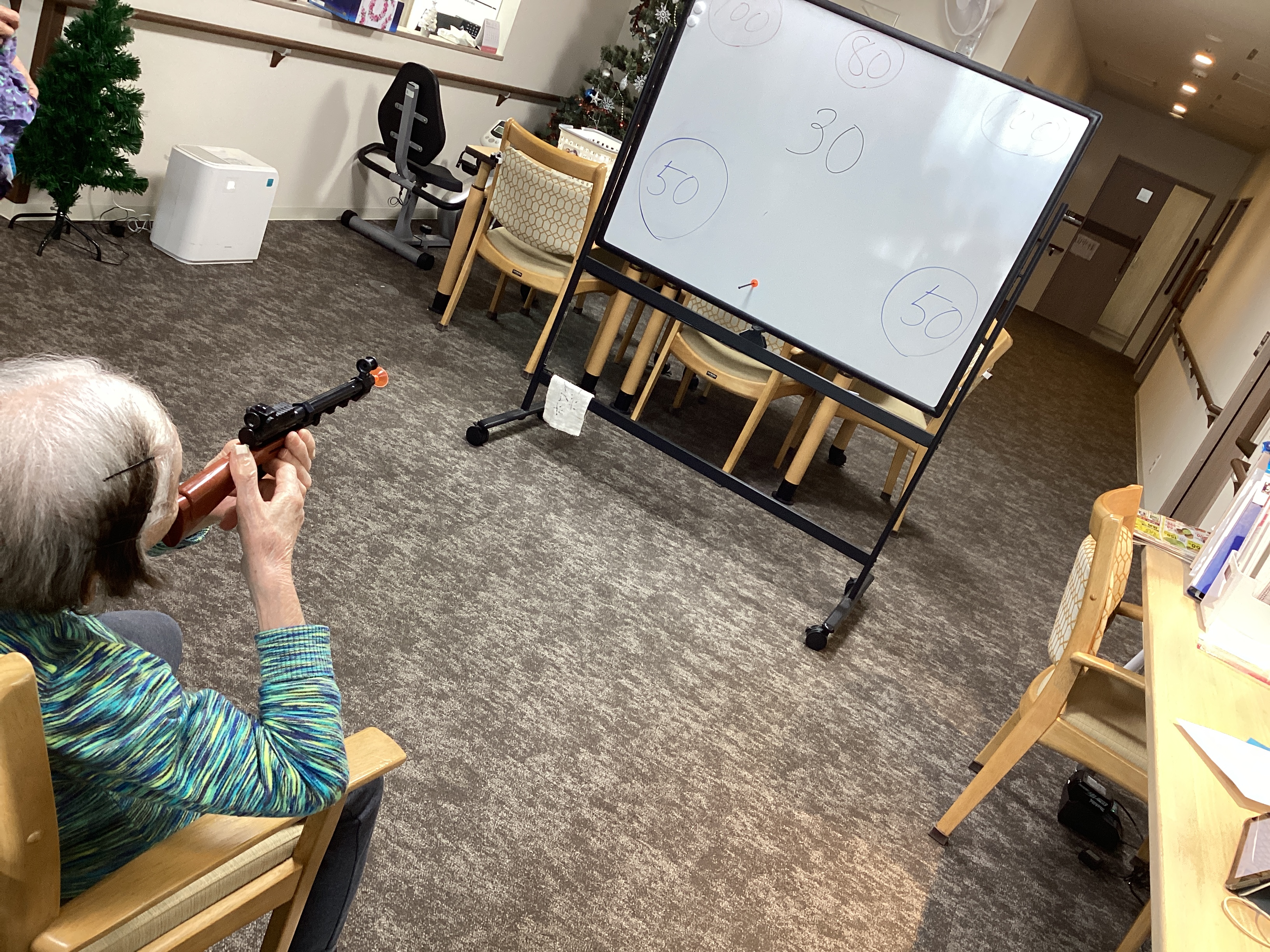 本日のレクリエーションは、”射的”を行いました!ホワイトボードを的に皆さん上手に打ち抜いていました🔫