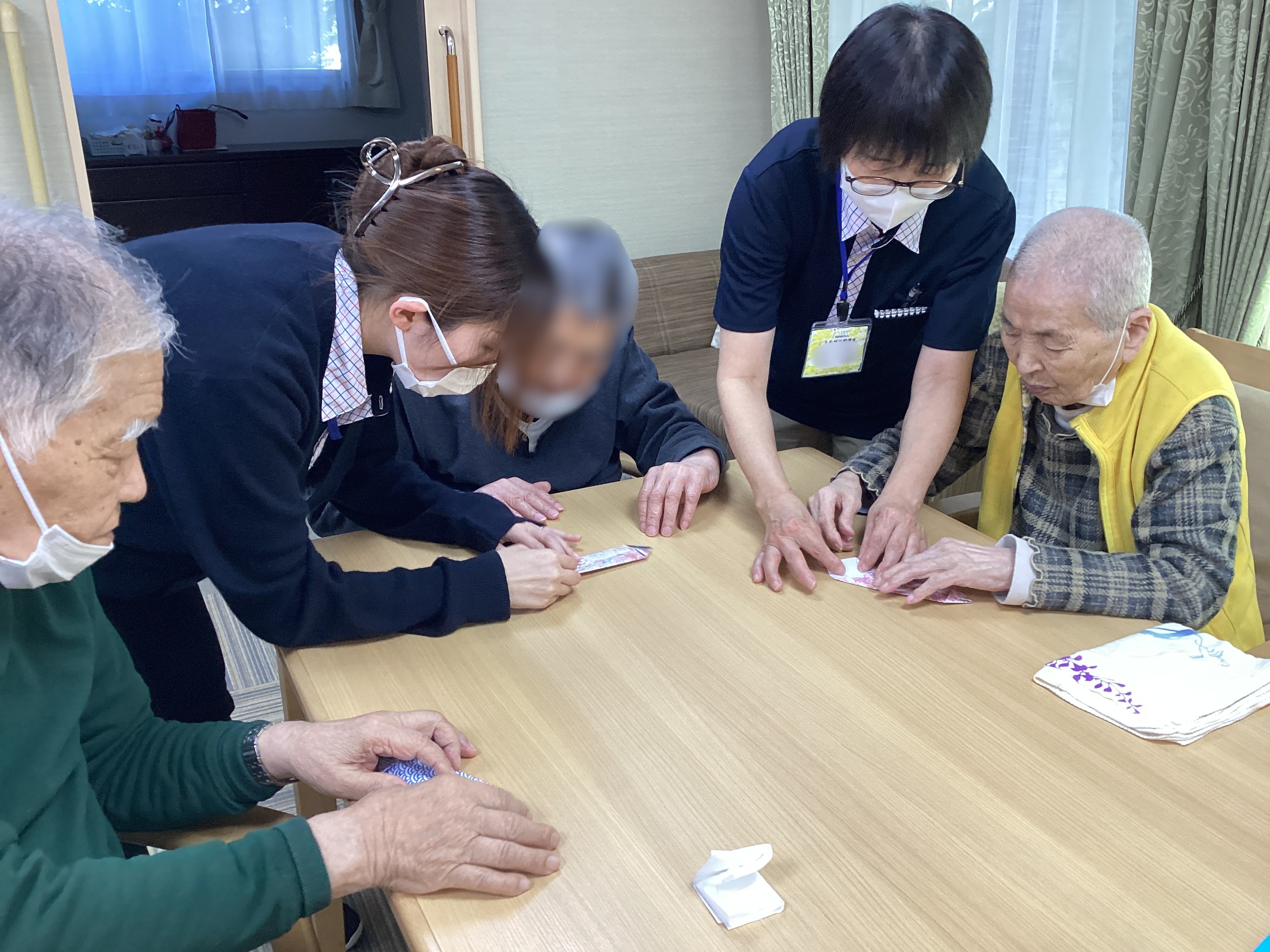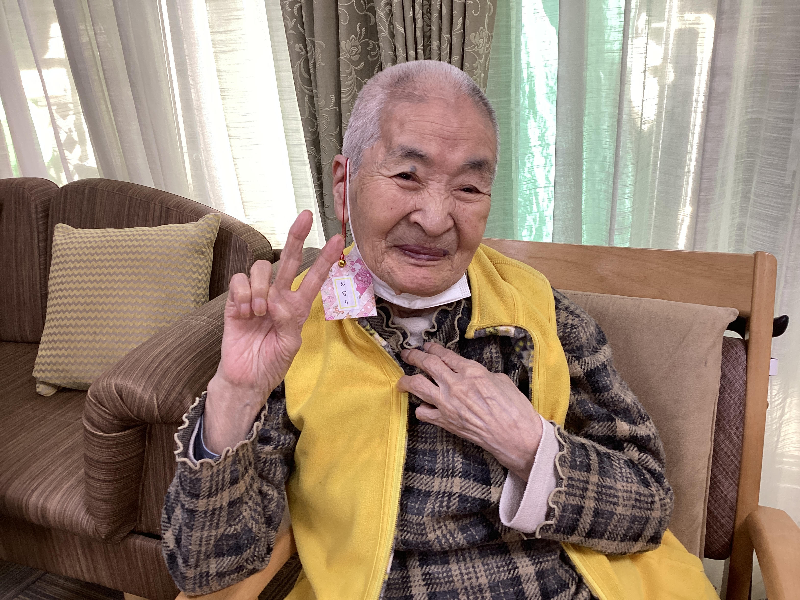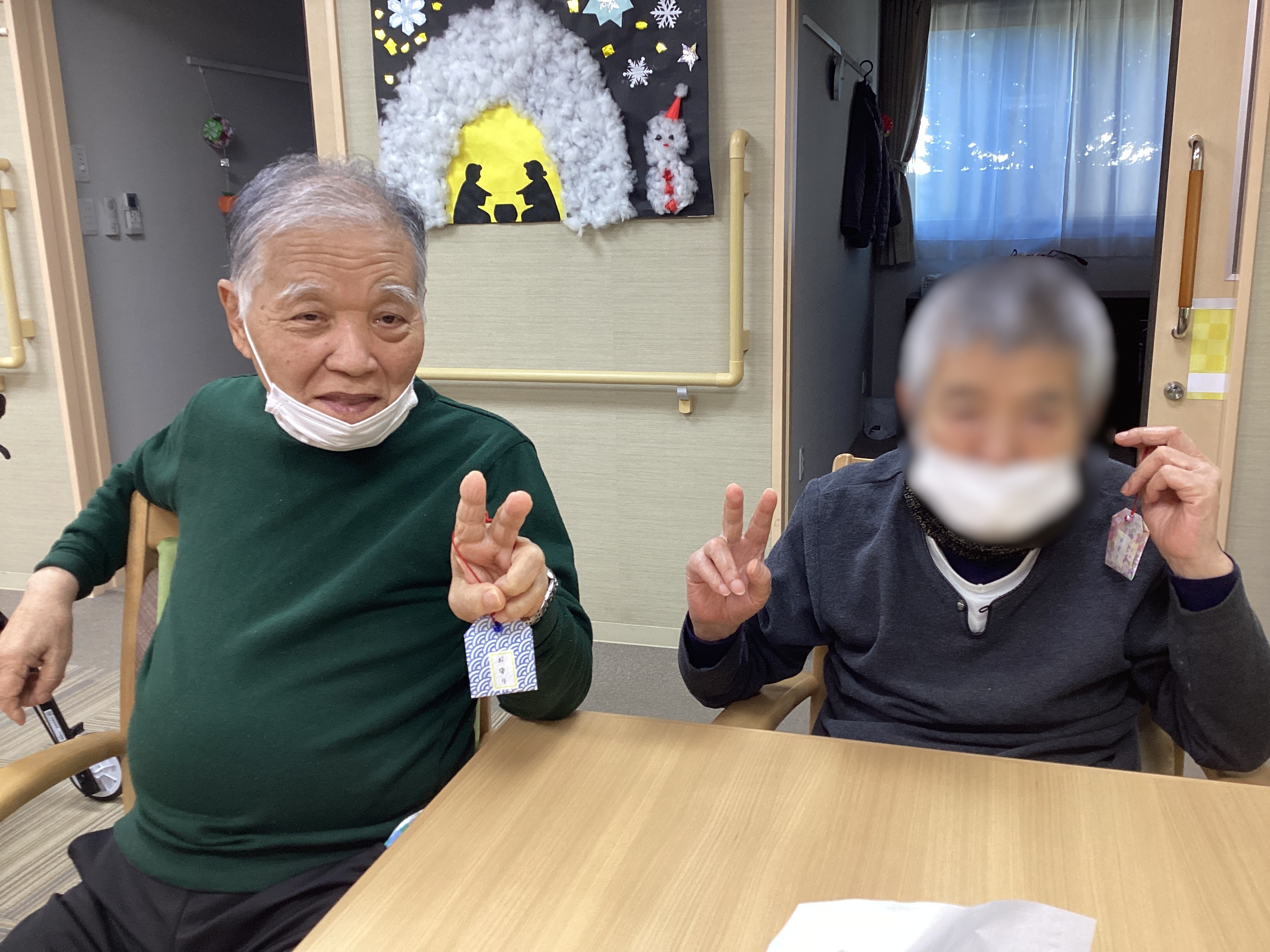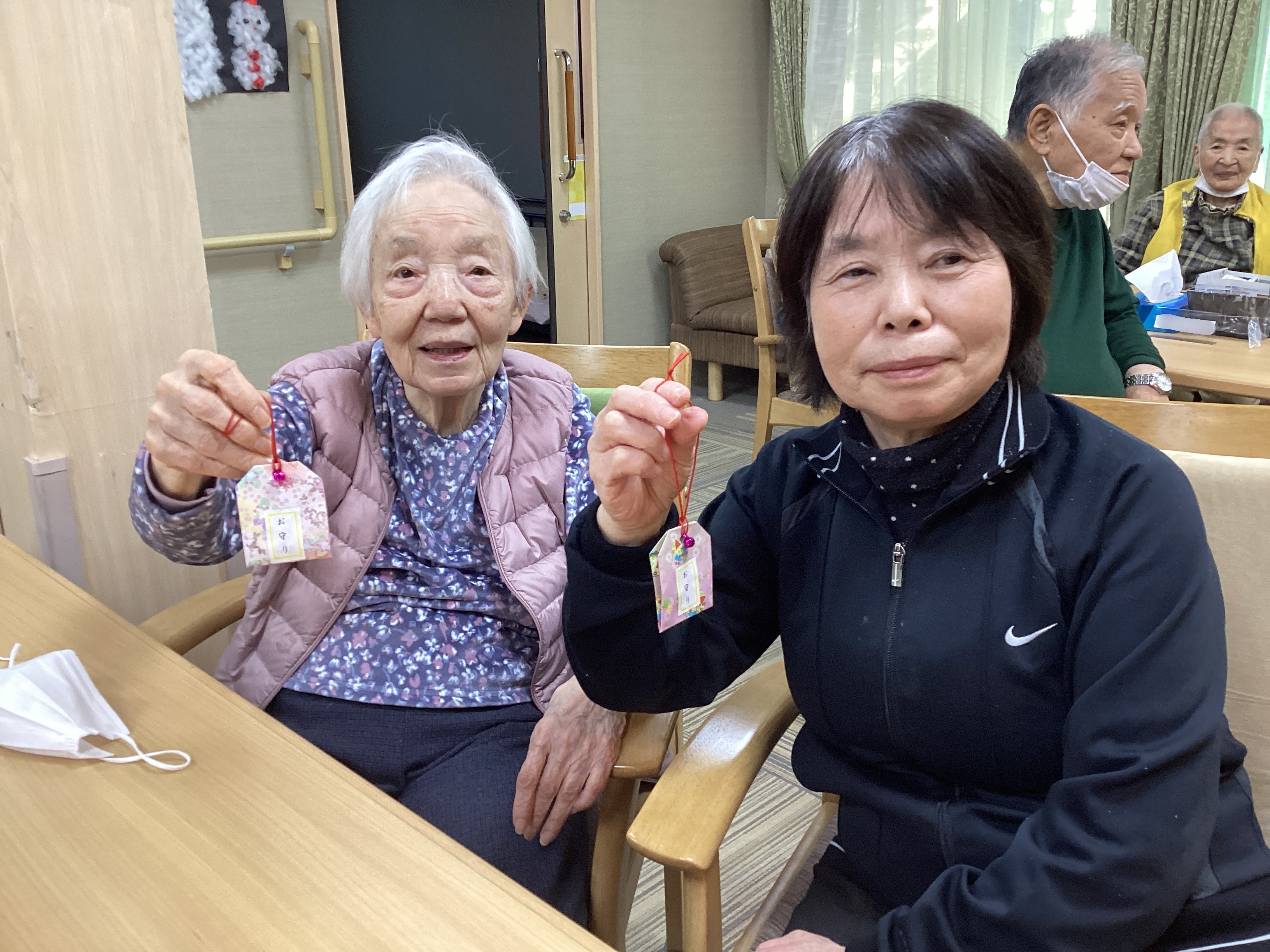 折り紙を使ってお守り作りを行いました!好きな柄の折り紙を選んでいただき、職員と一緒に一所懸命にお守りを折っていきます🤔さらに好きな鈴を選び、紐と鈴を付けて完成✨出来上がったお守りを手に皆さん自然と笑顔に🤗最後は完成したお守りと記念写真を撮りました