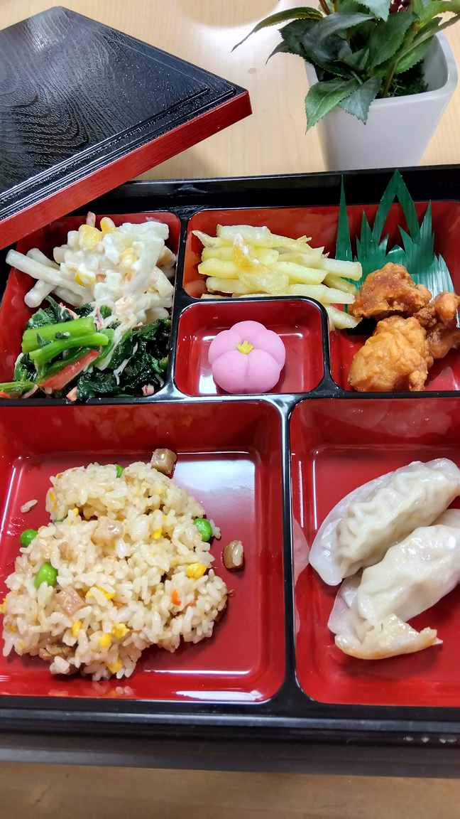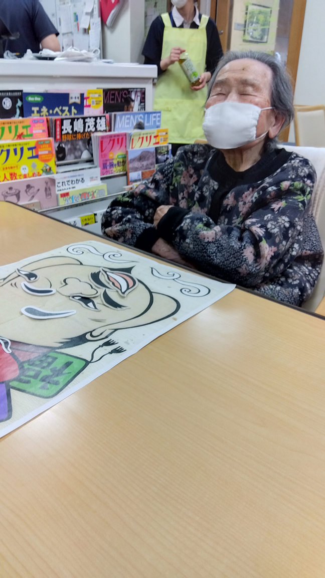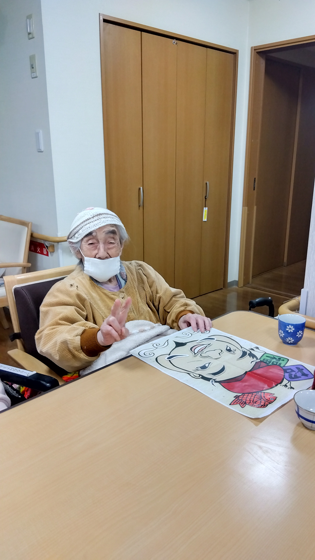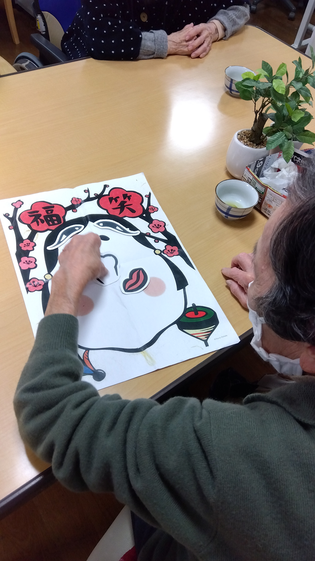 お正月恒例の福笑いをやってみました。 あぁ~でもない。。。こぉ~でもない。。。あれやこれや。っと できましたぁ~。 その後は美味しい松花堂弁当を一緒に食べました。(職員手作りです!)