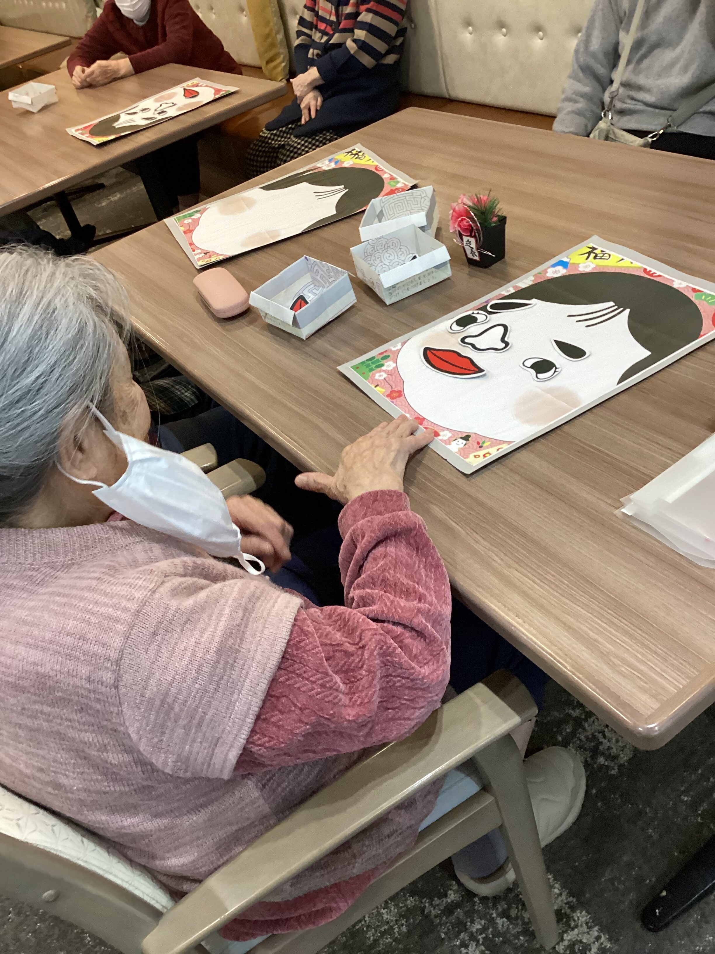 お正月にレクリエーションで福笑いを行いました。 それぞれ面白い顔が完成していました(^_^)