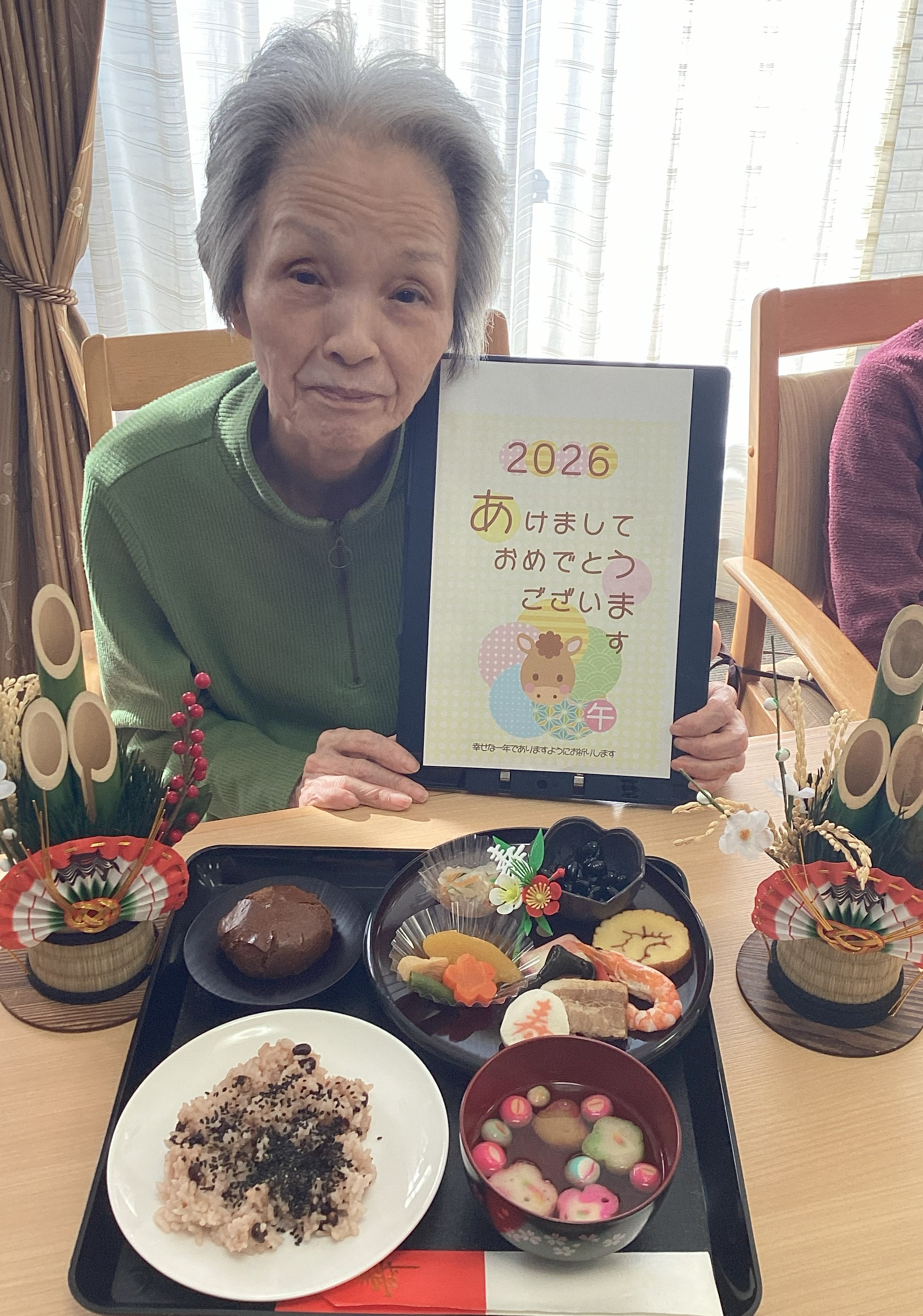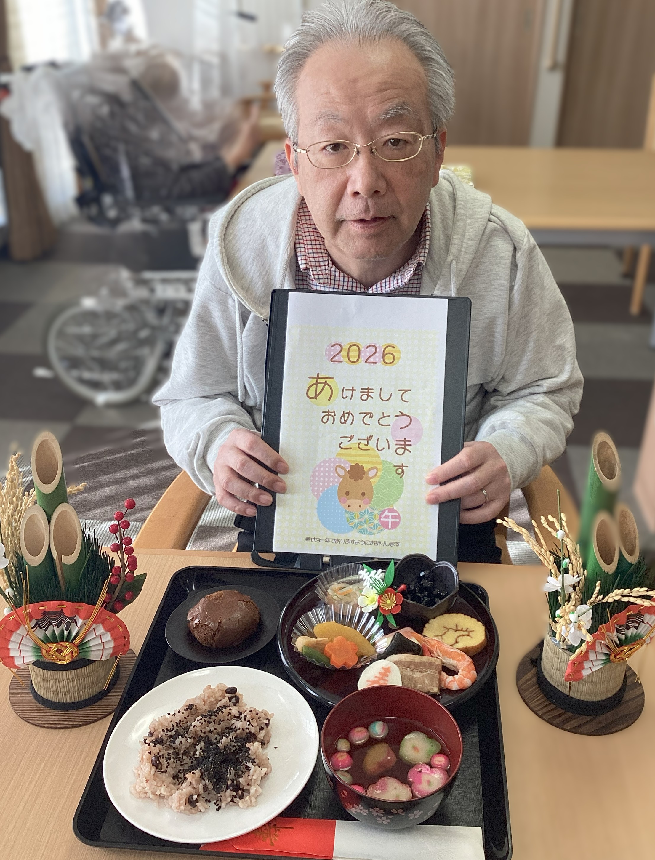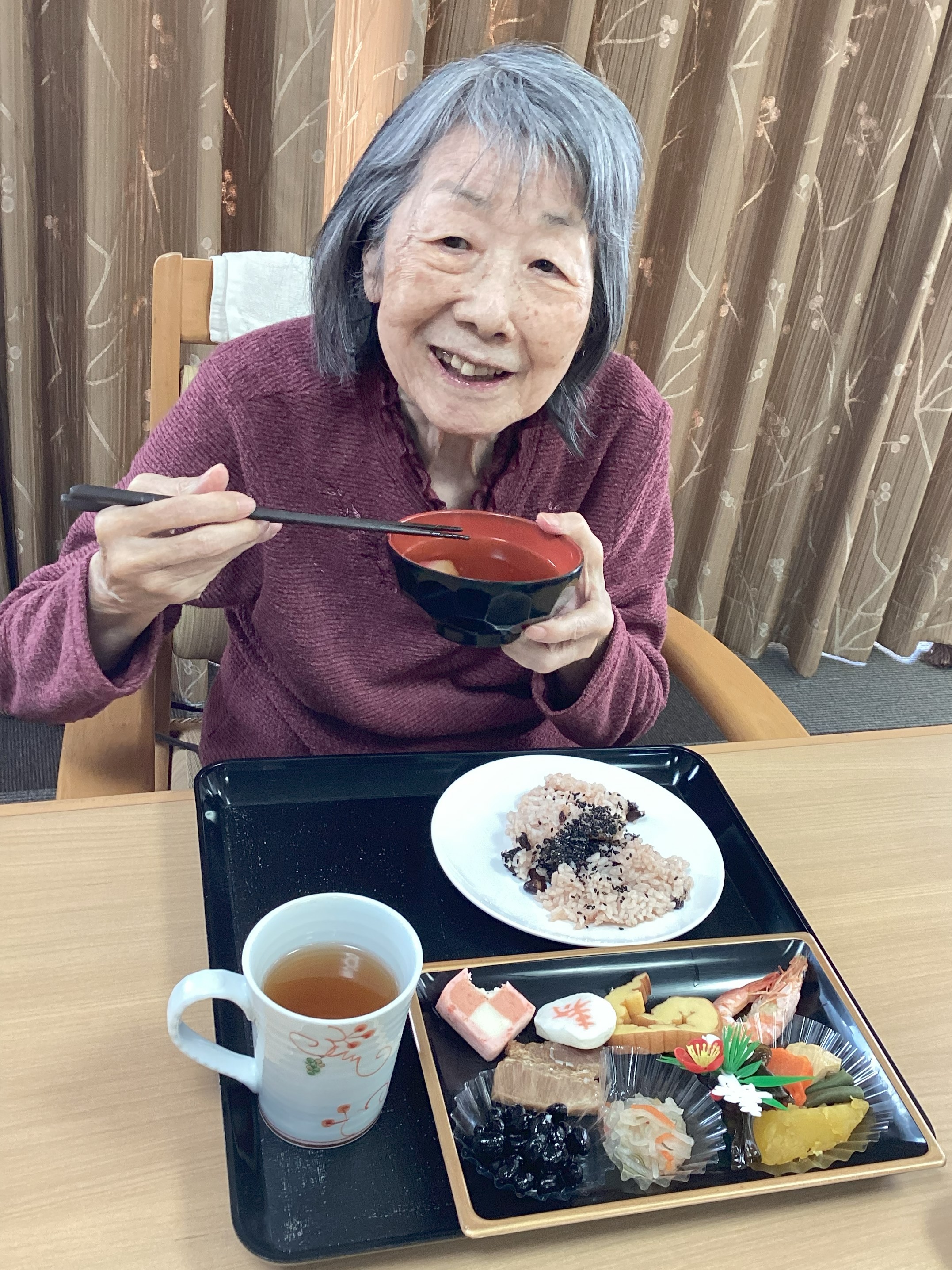 元旦の昼食は”おせち”!焼え海老、伊達巻、海鮮市松、紅あずま甘露煮、彩りなます、黒豆、豚の角煮、寿かまぼこ、お煮しめを頂きました!皆さん美味しいおせちを食べてにっこり(*^_^*)!今年も美味しい物たくさん食べて健康でいきましょうね(*^_^*)