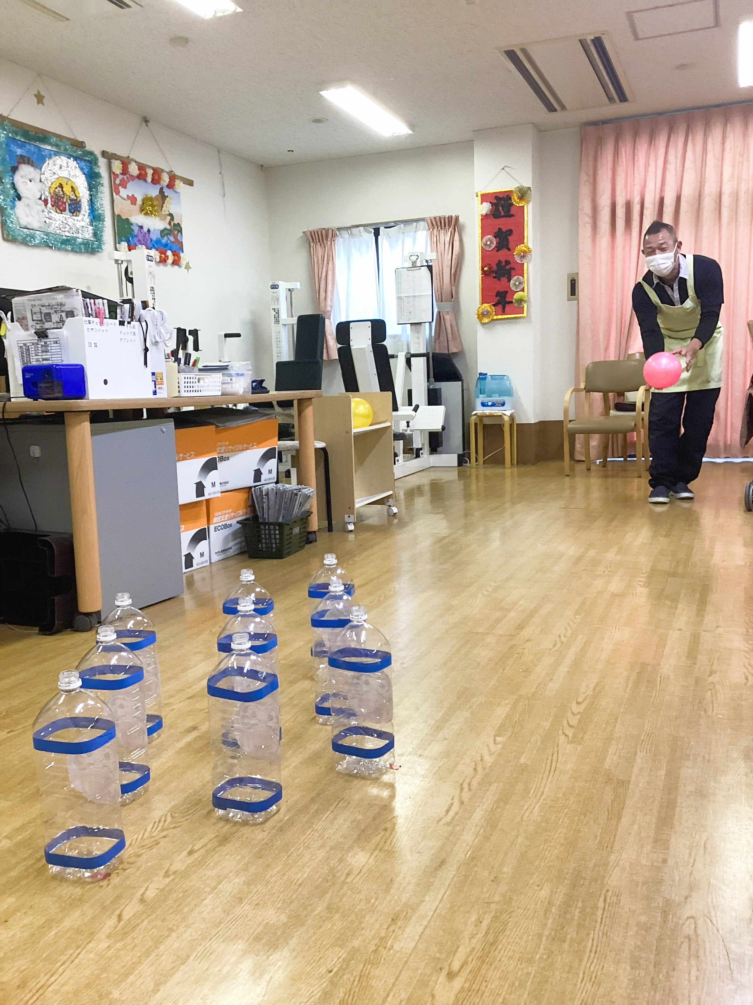 新春ボーリング大会3日目🎳 何度か経験されている方もいらっしゃり、コツをつかんだ方はボールの速度が上がりペットボトルが勢い良く倒れます😉👌時間が少し余り、スタッフも参加させていただきました~😁力が入れば入るほど、ボールの行方が違う方向へ🤣