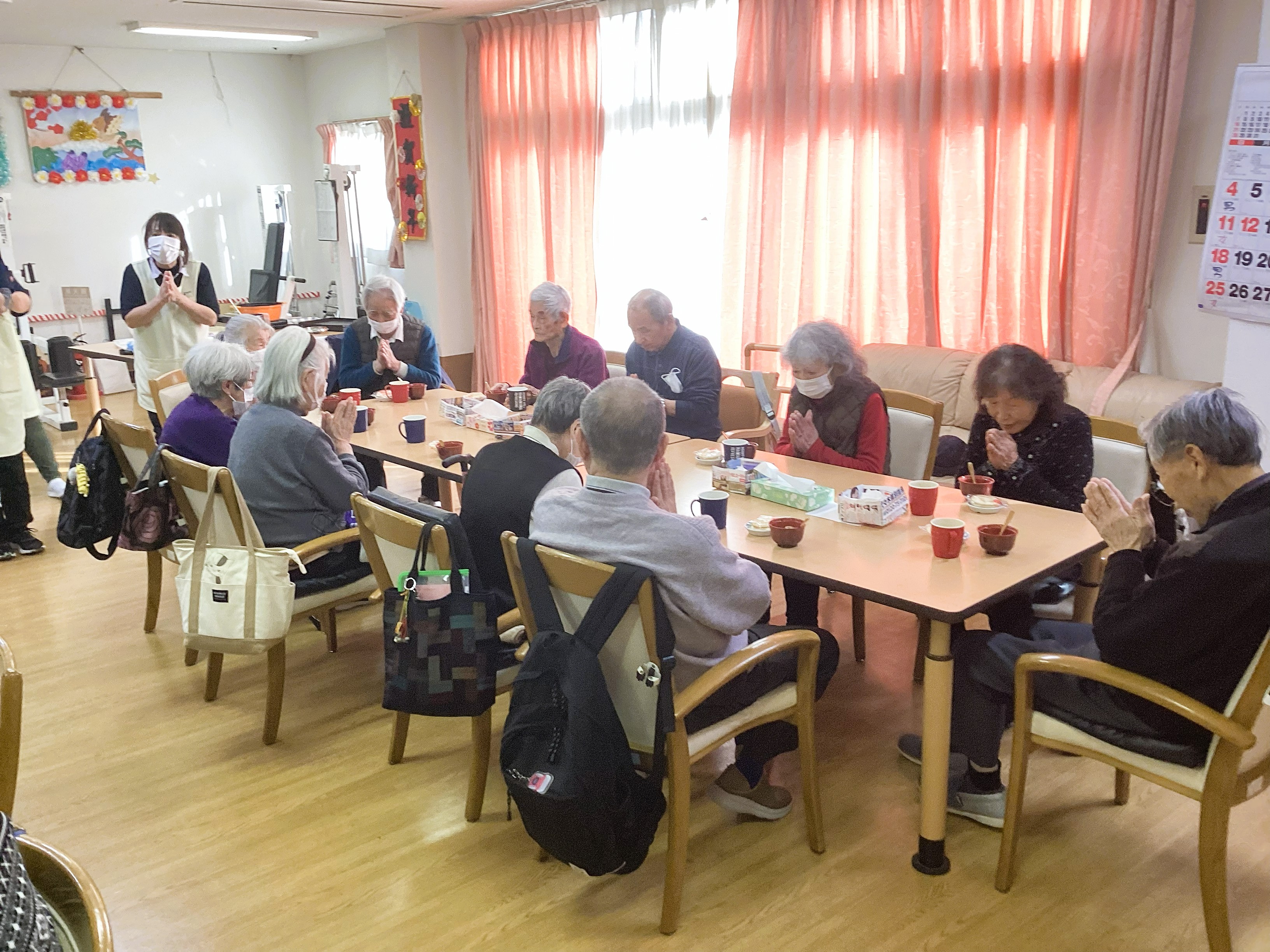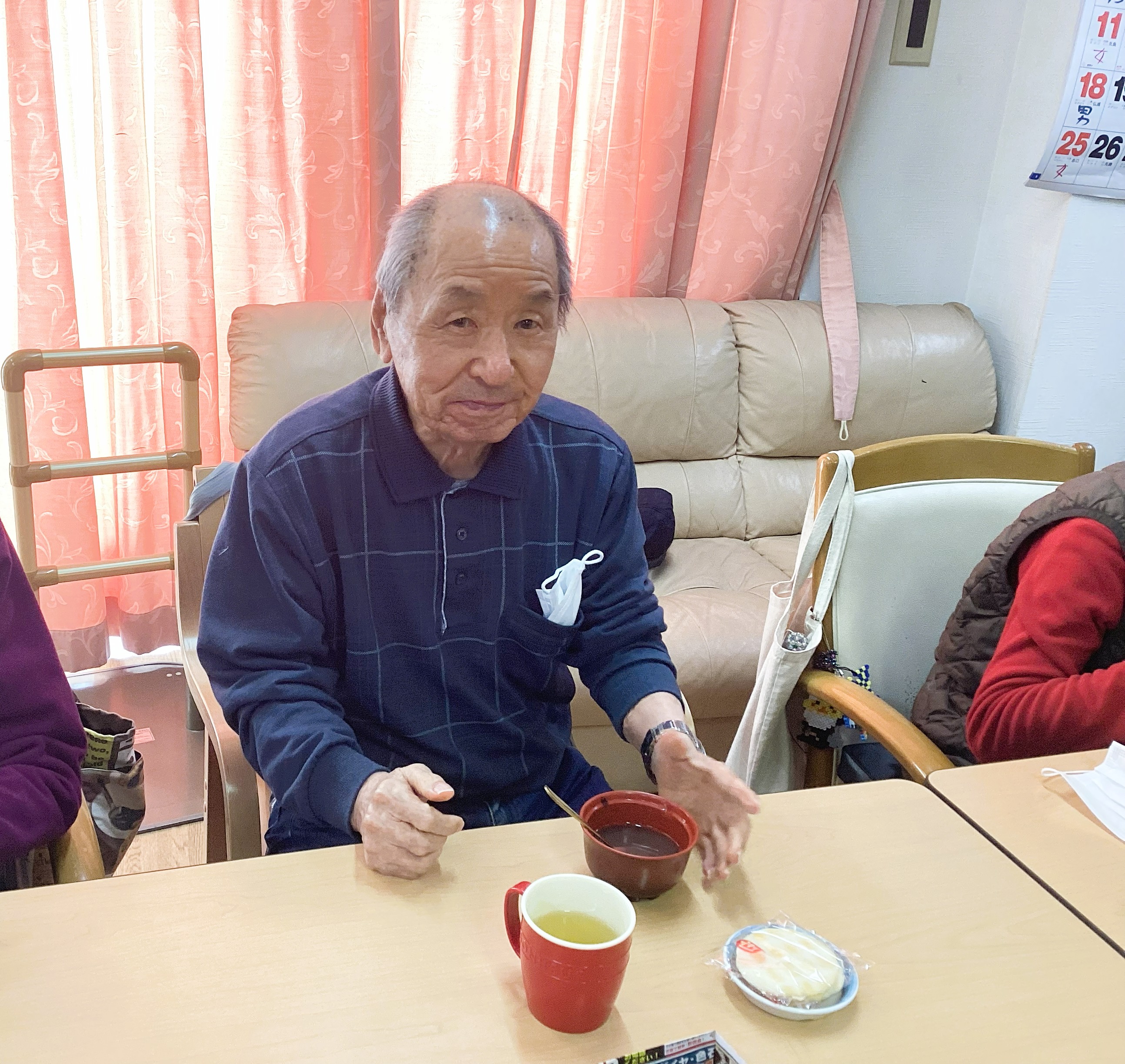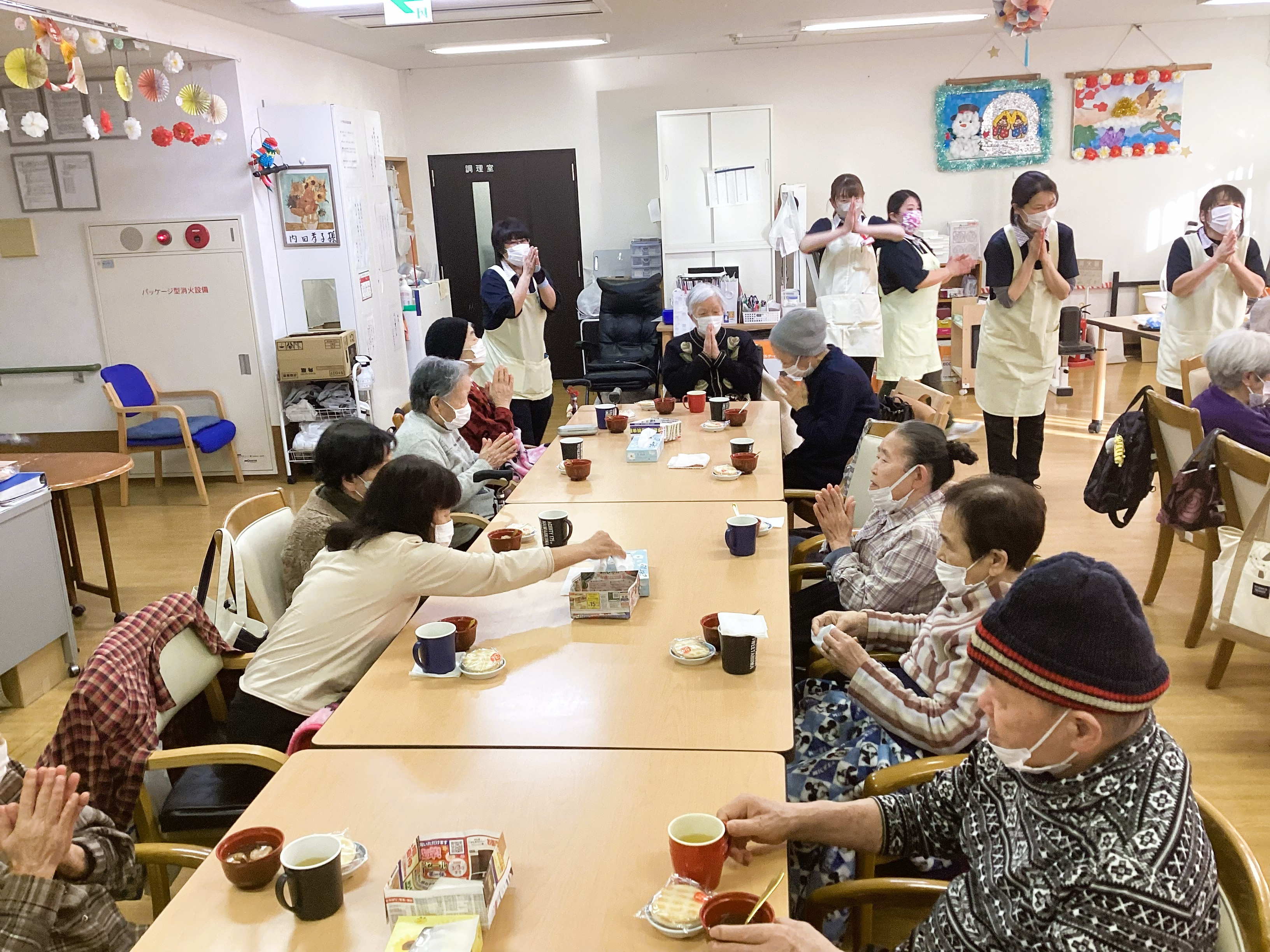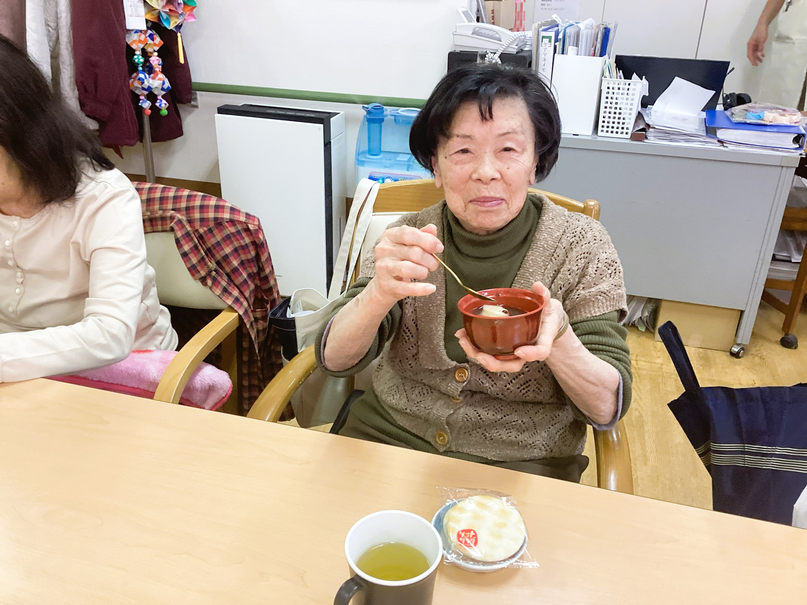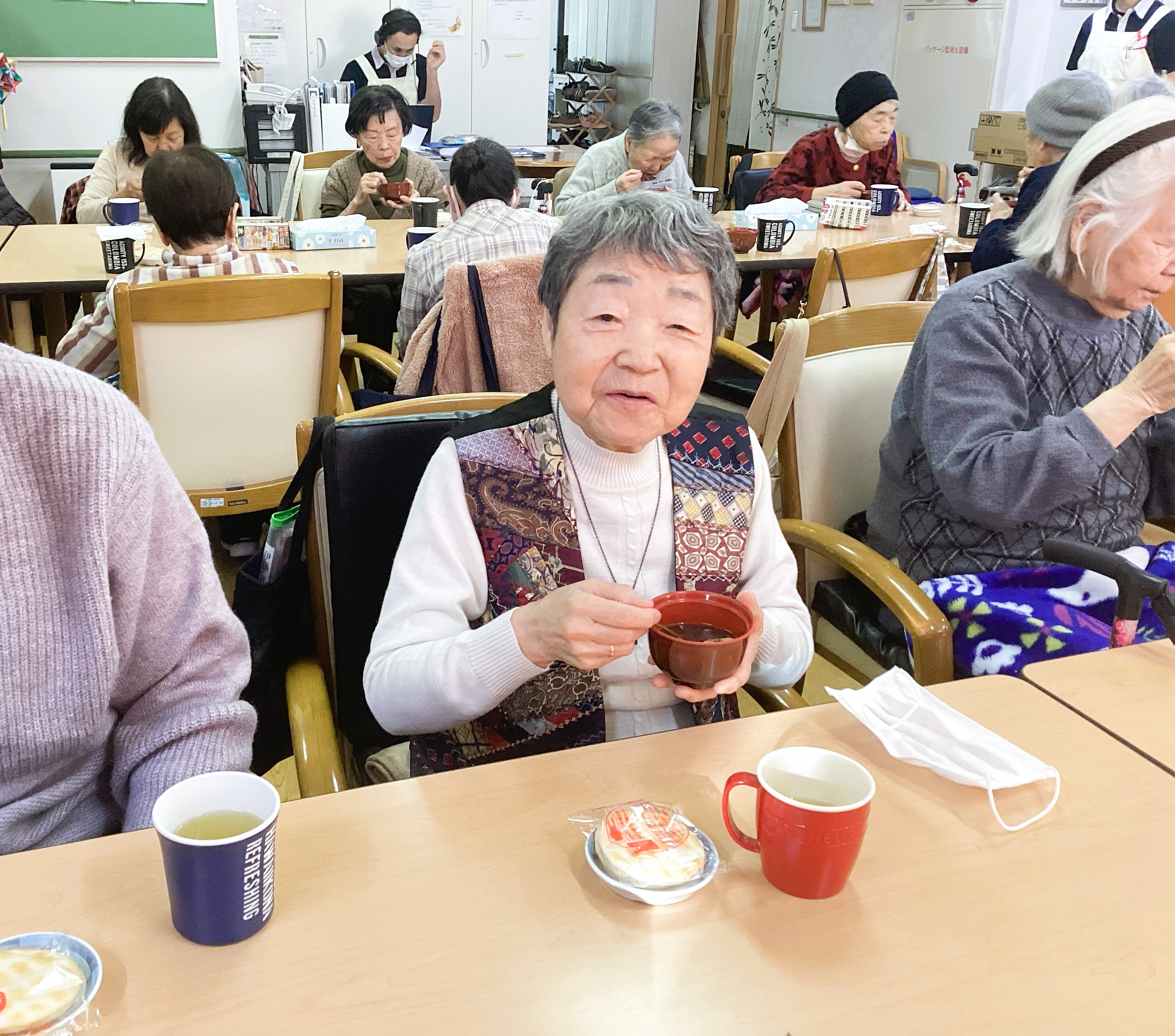 「いただきます~」でおやつの時間がスタート!!やっぱり温かくて甘いものは、皆さんを笑顔にします😁「美味しかった、お変わりないの~」たくさんのうれしい声が聞かれました👌