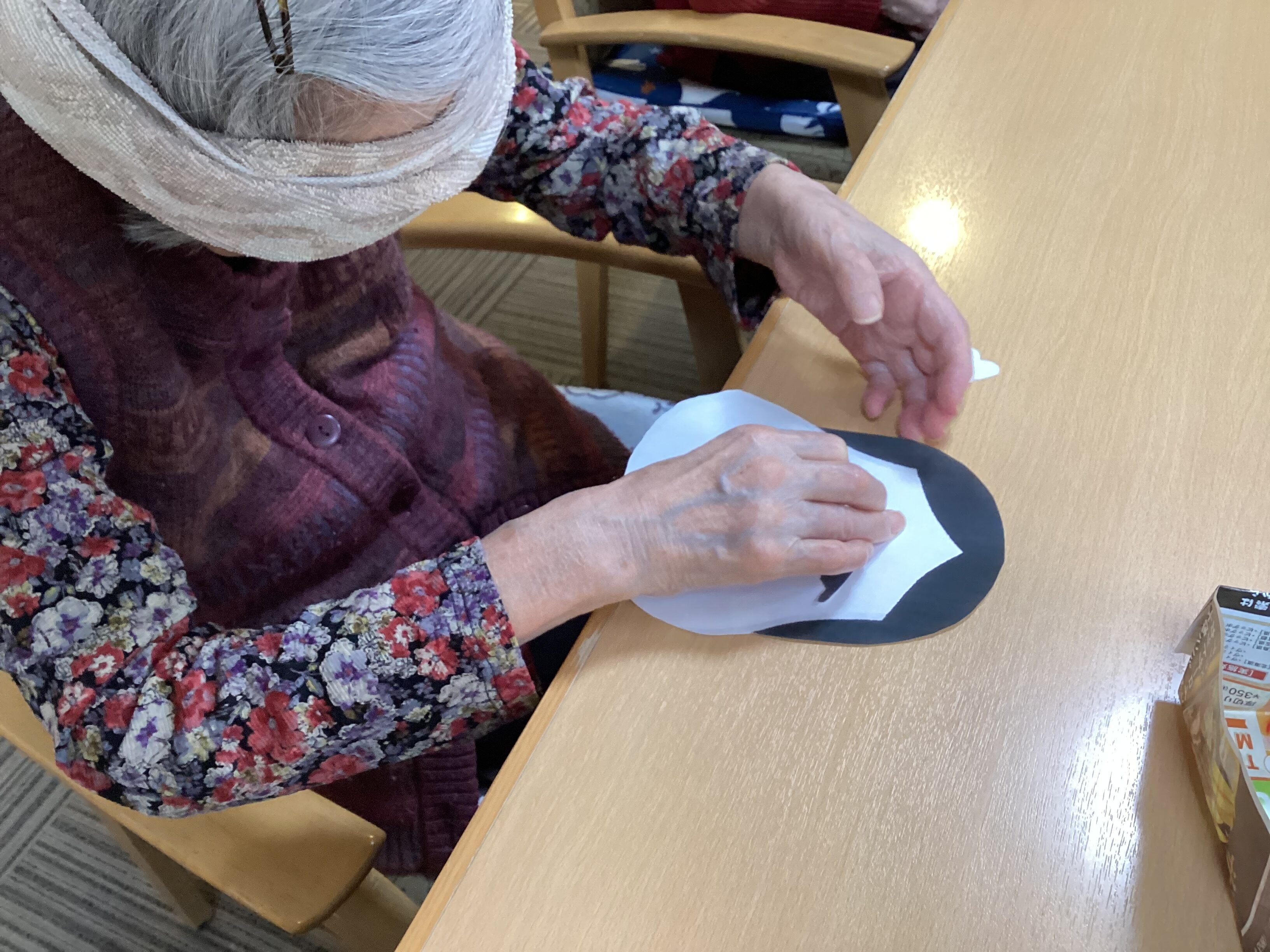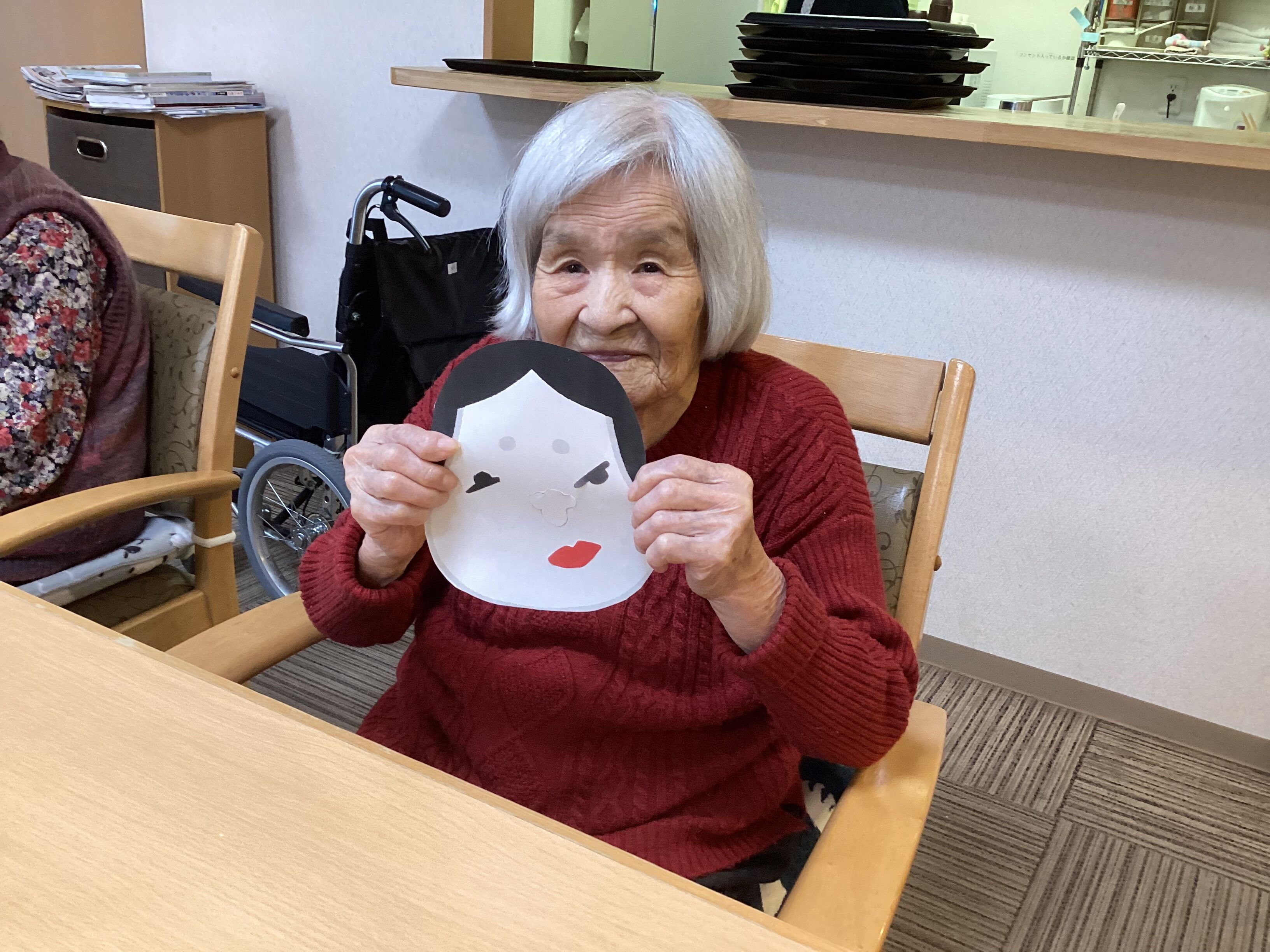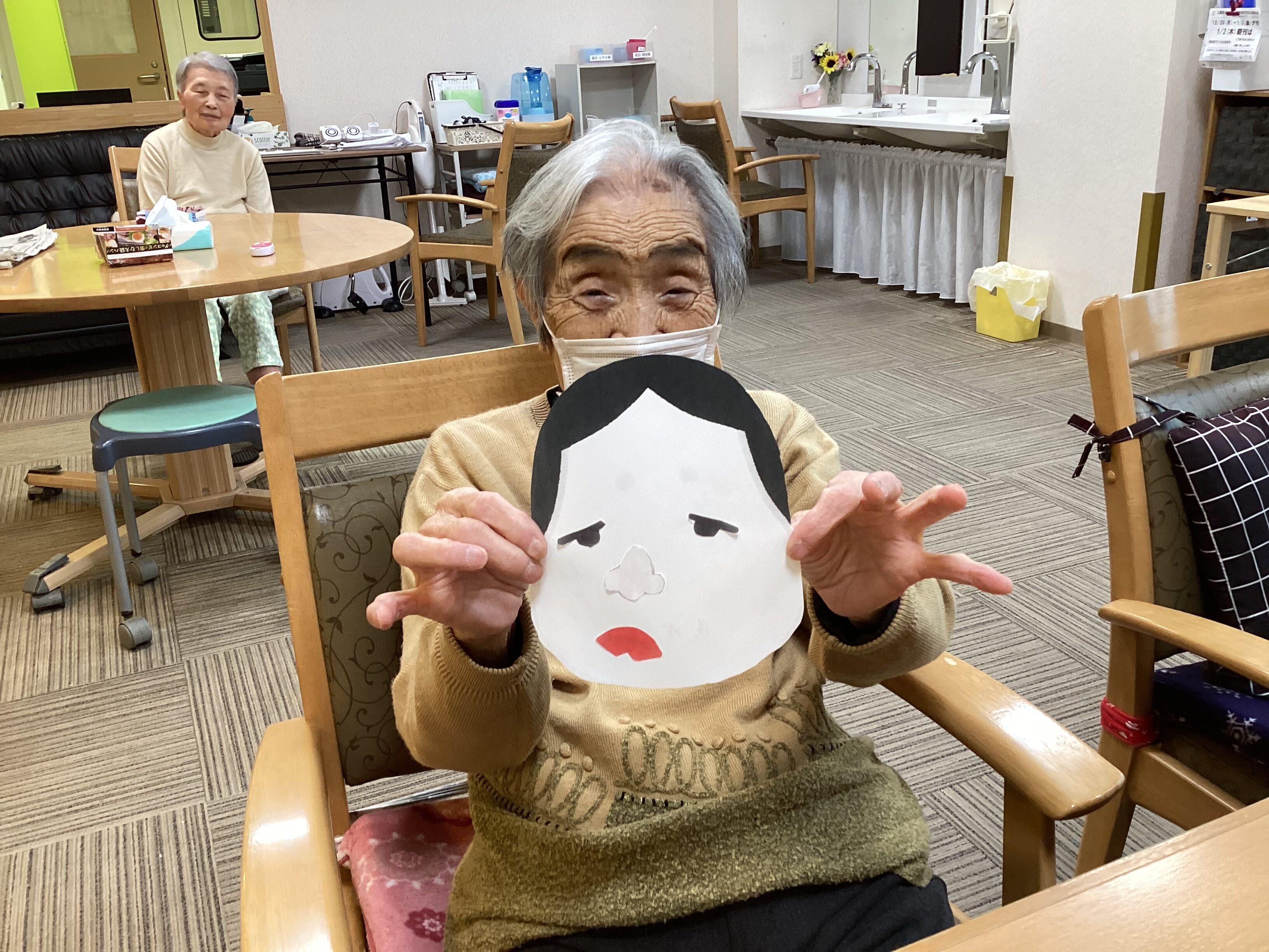 あけましておめでとうございます 元旦はおせちを食べて福笑い! しっかりと目隠しをして並べました。思ったよりもきれいな出来!とみなさん喜んで福笑いをしました 本年もよろしくお願いいたします。