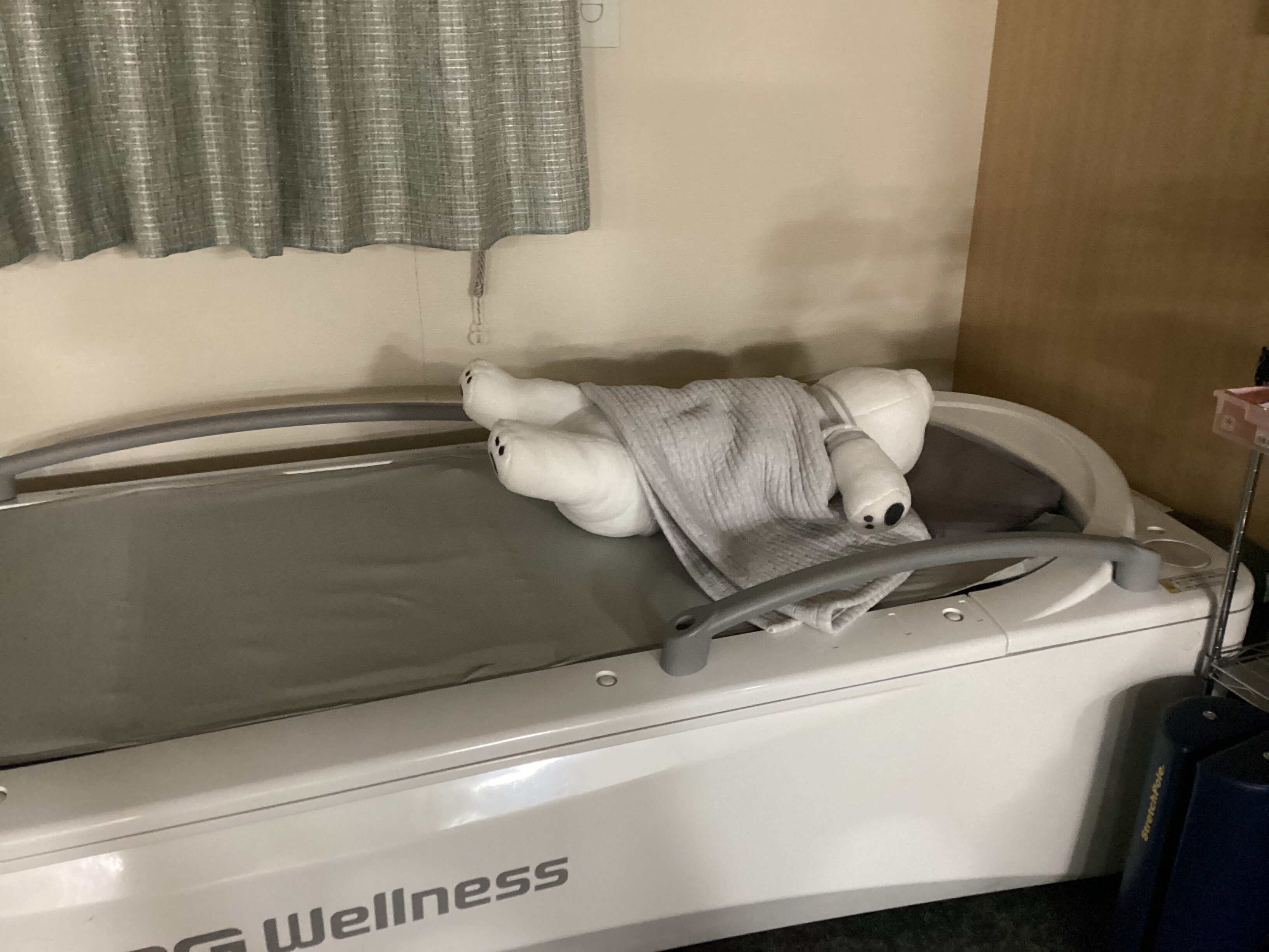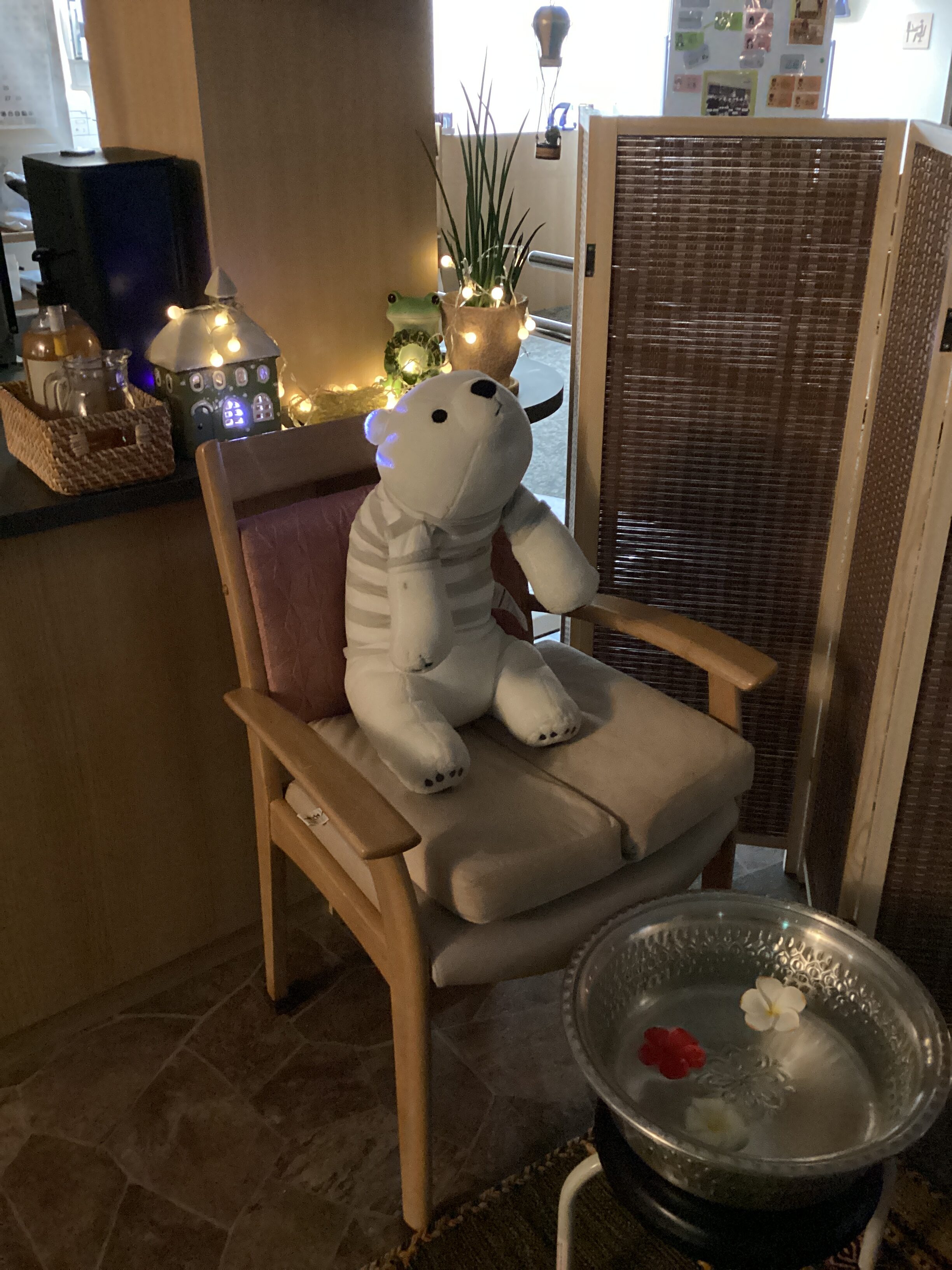 忘れ物を取りに戻ったら、あらあら、ミモザのペットのミモちゃんがこんなことしてる😲!ご利用者に評判のレッドコードにウォーターベッド、「夜によく眠れる」足湯とリンパドレナージュ、それからドリップコーヒーにおやつまで笑。ミモちゃん、憧れていたんだね🥰