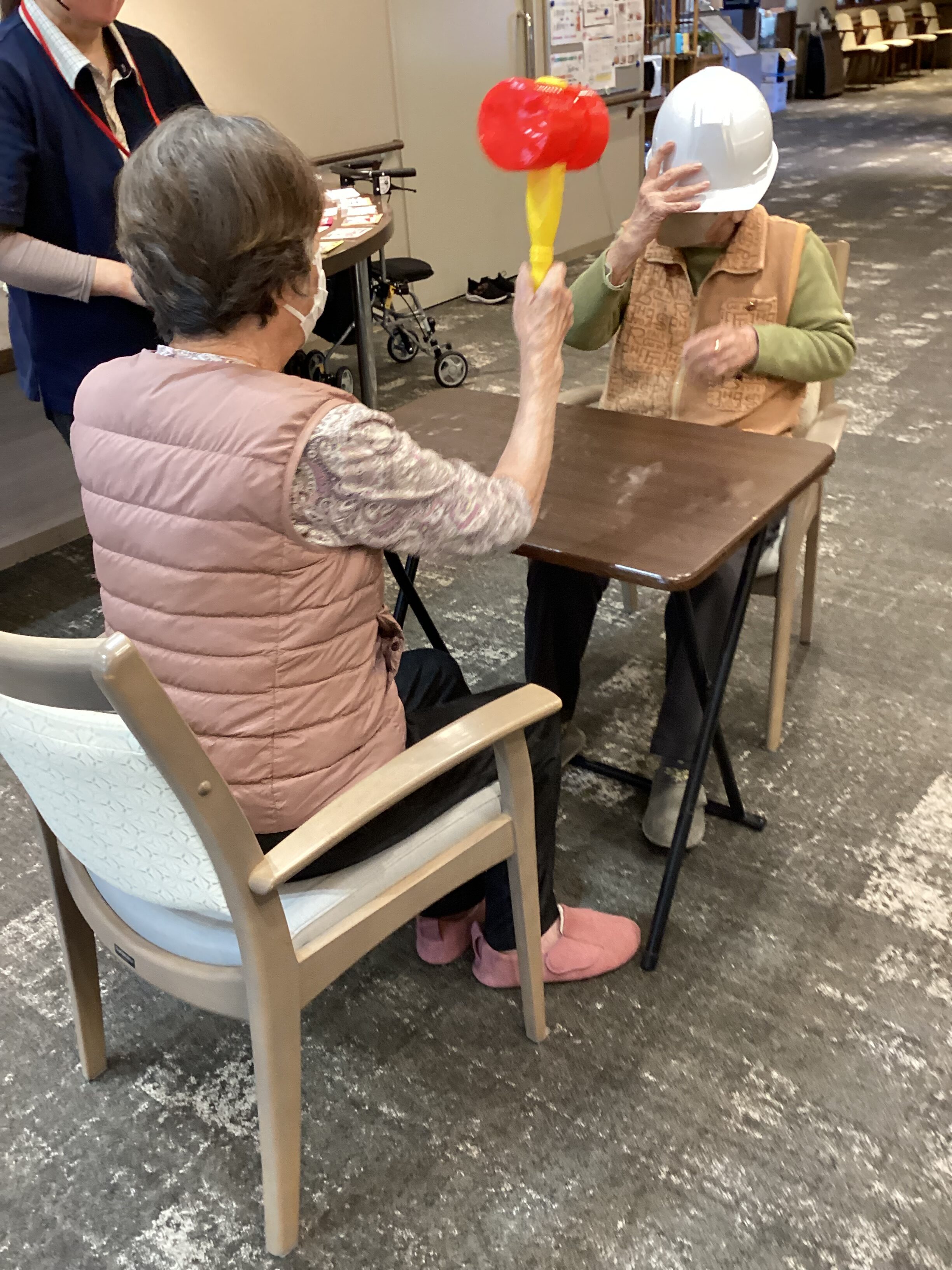 レクリエーションの時間に 柔らかいピコピコハンマーを使って、叩いて被ってじゃんけんぽんを行いました。 皆様、判断に少し手こずりながらも楽しまれていました(^_^)