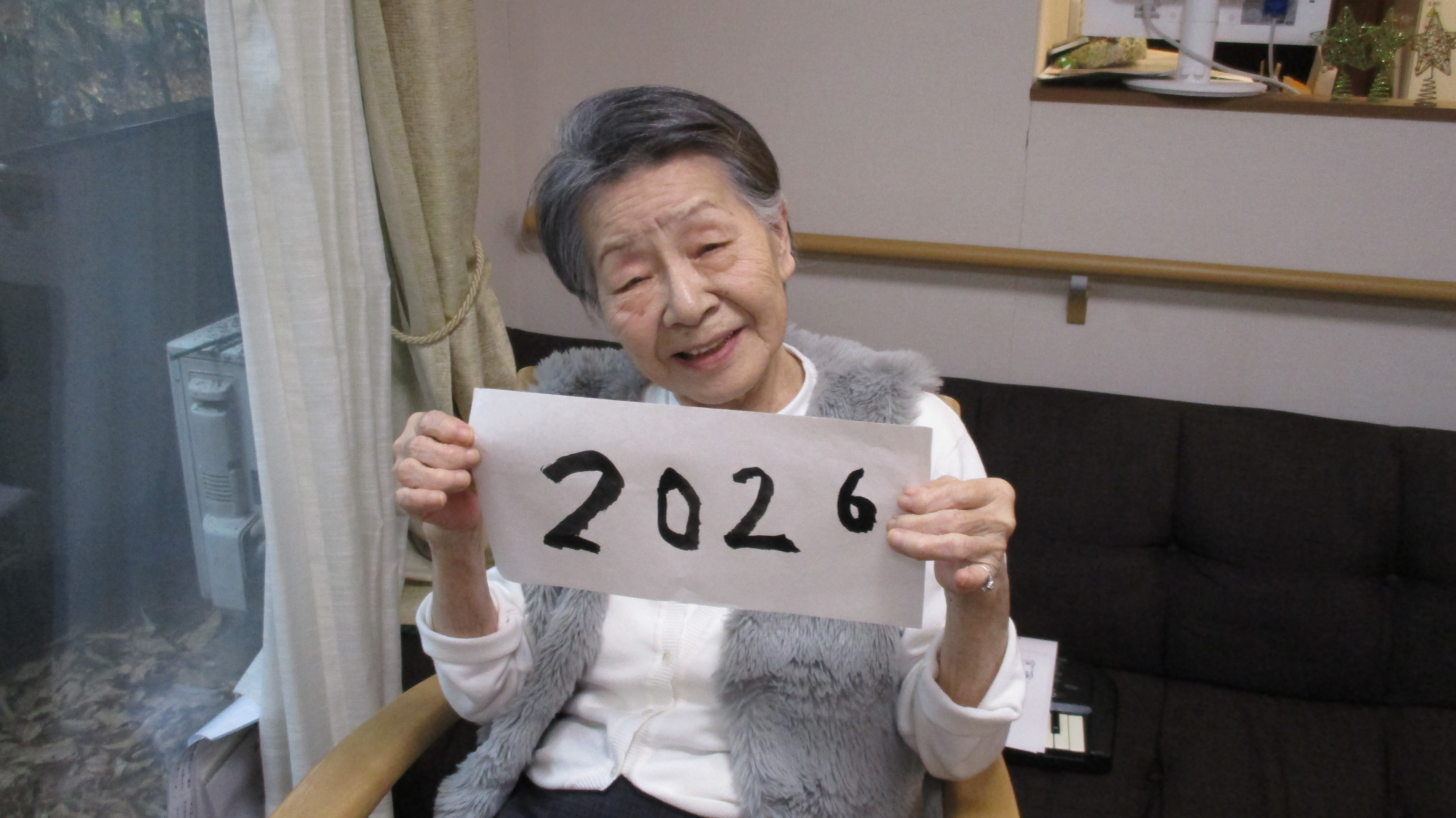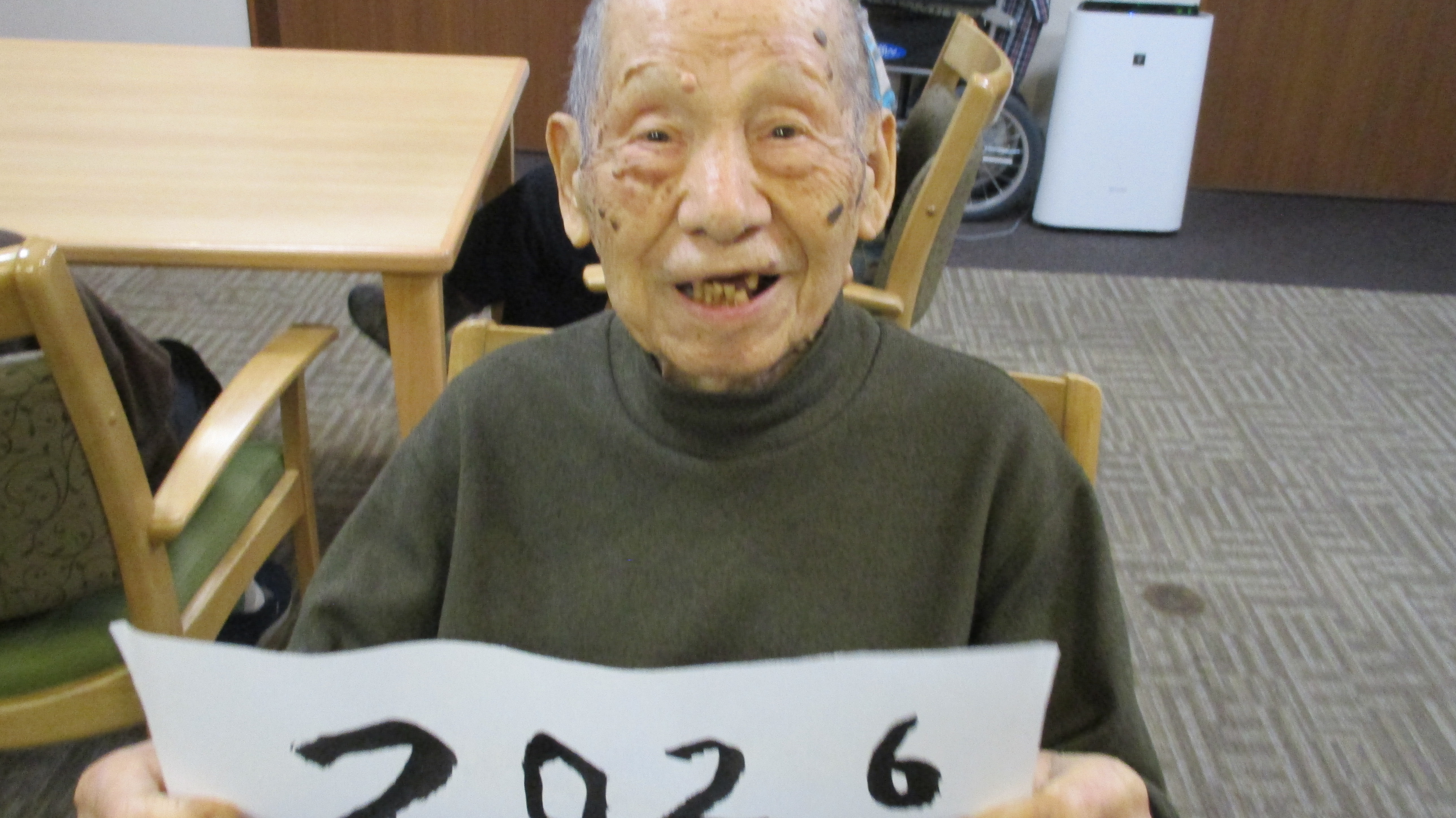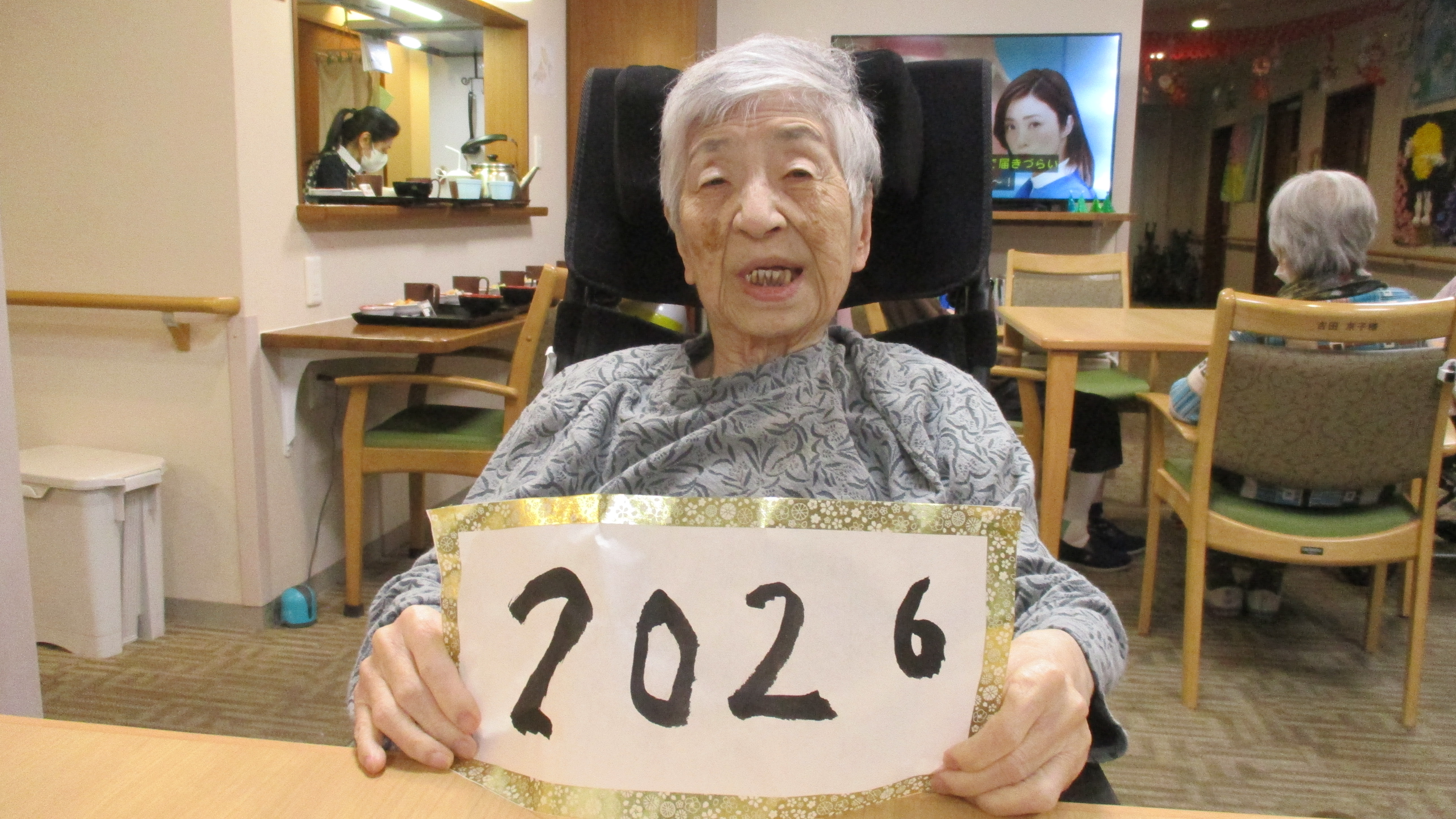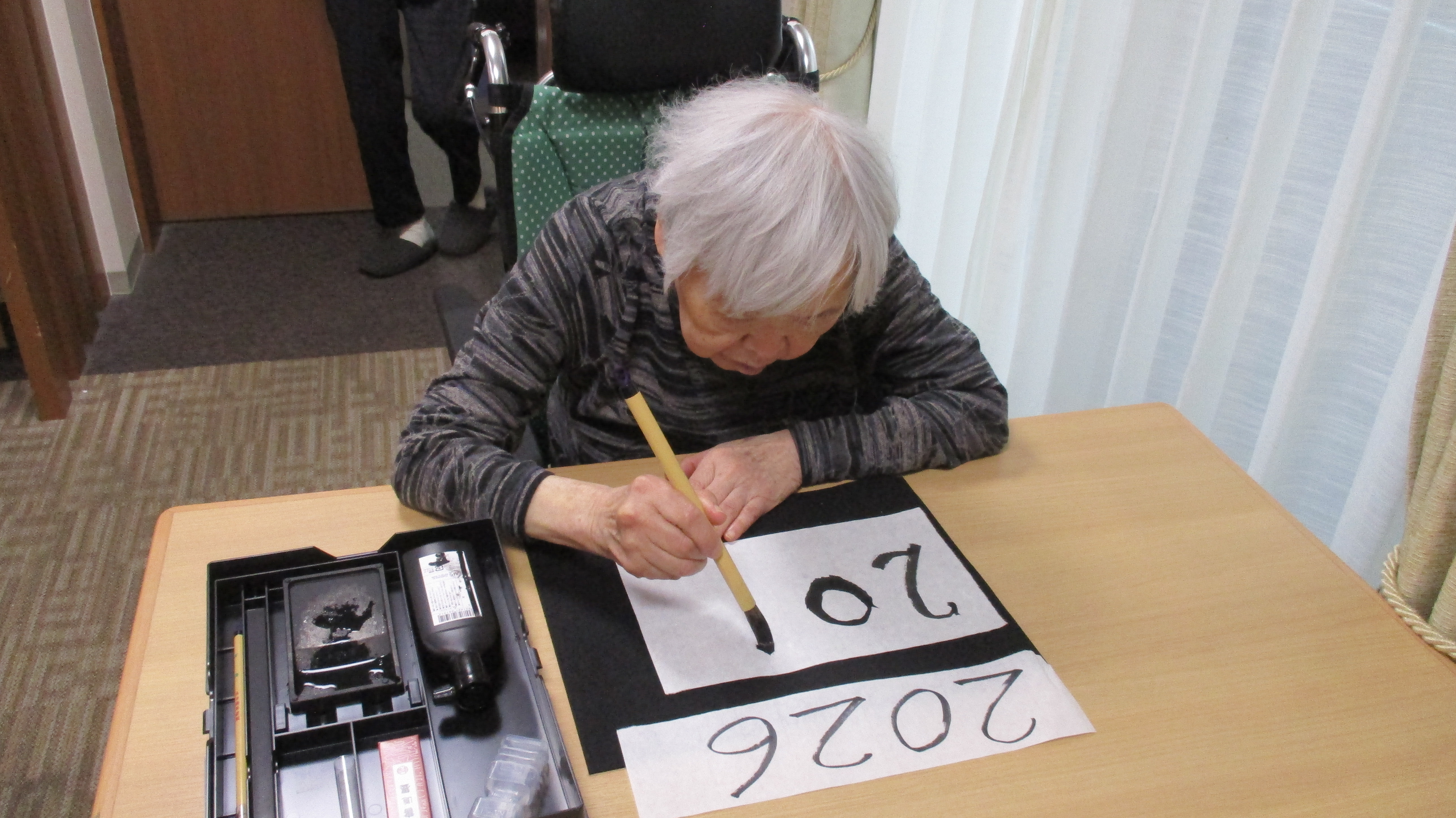 1階の皆様はお習字でかきぞめです。かけなかった方も手に取ってハイポーズ❣