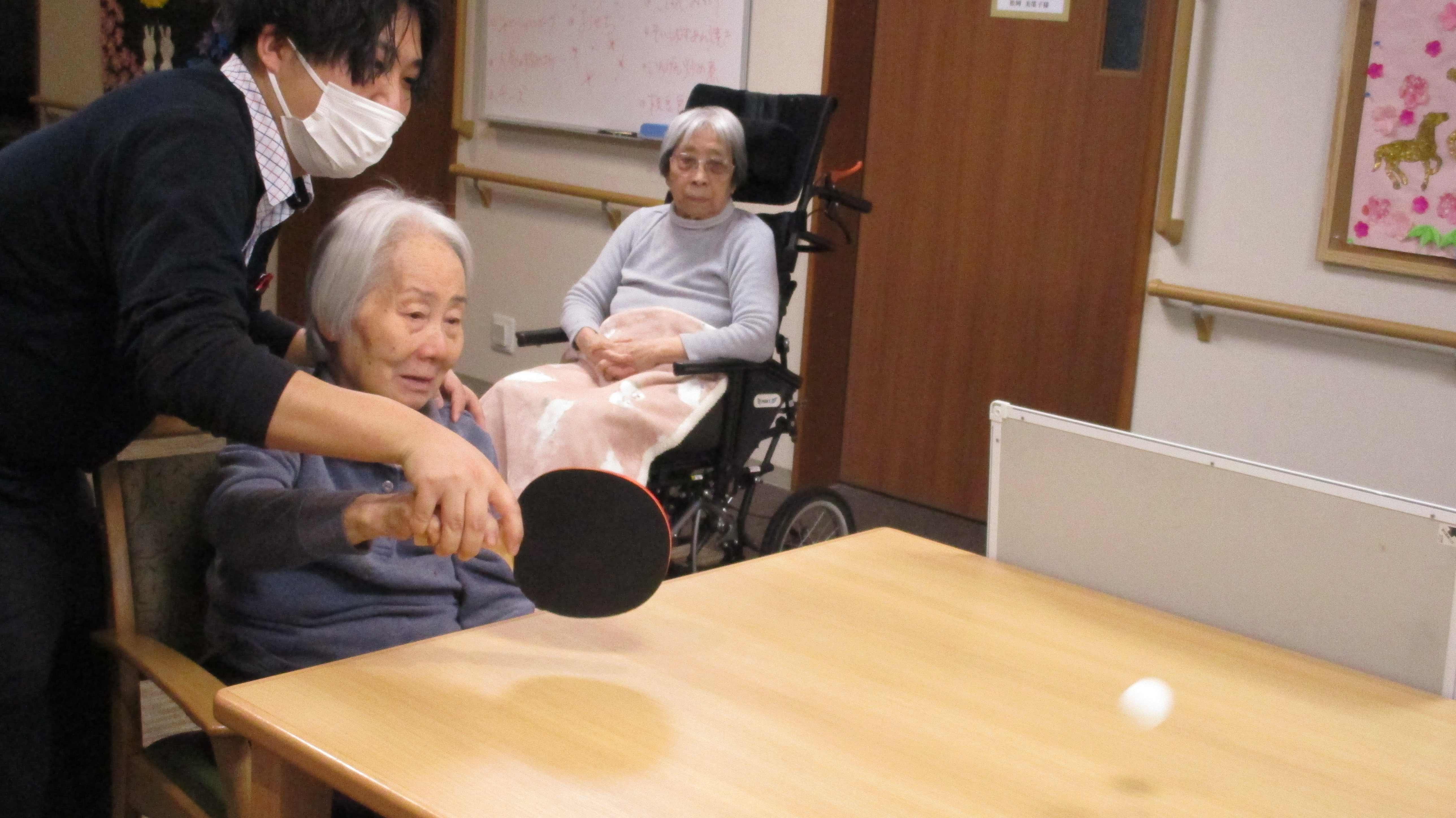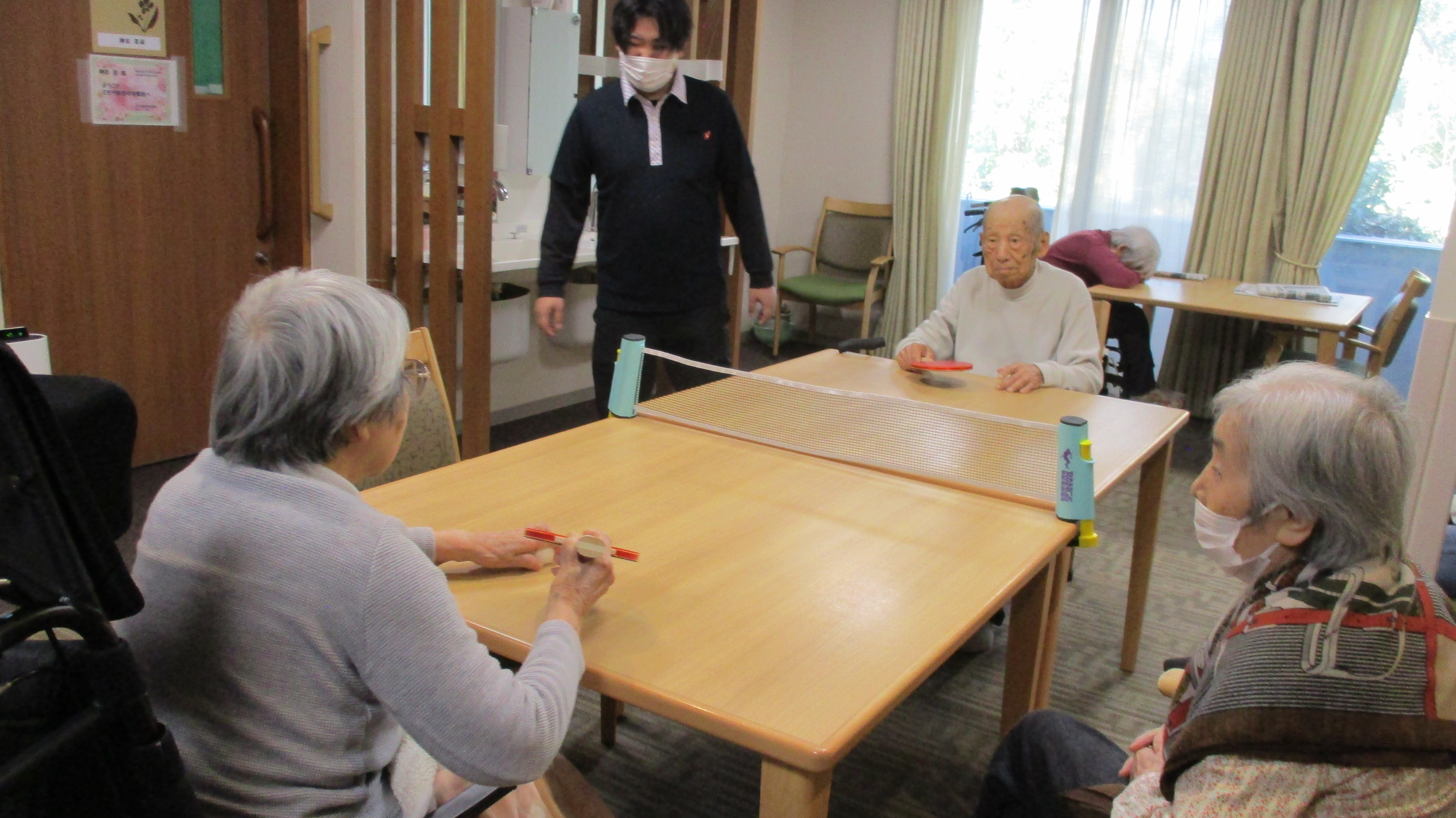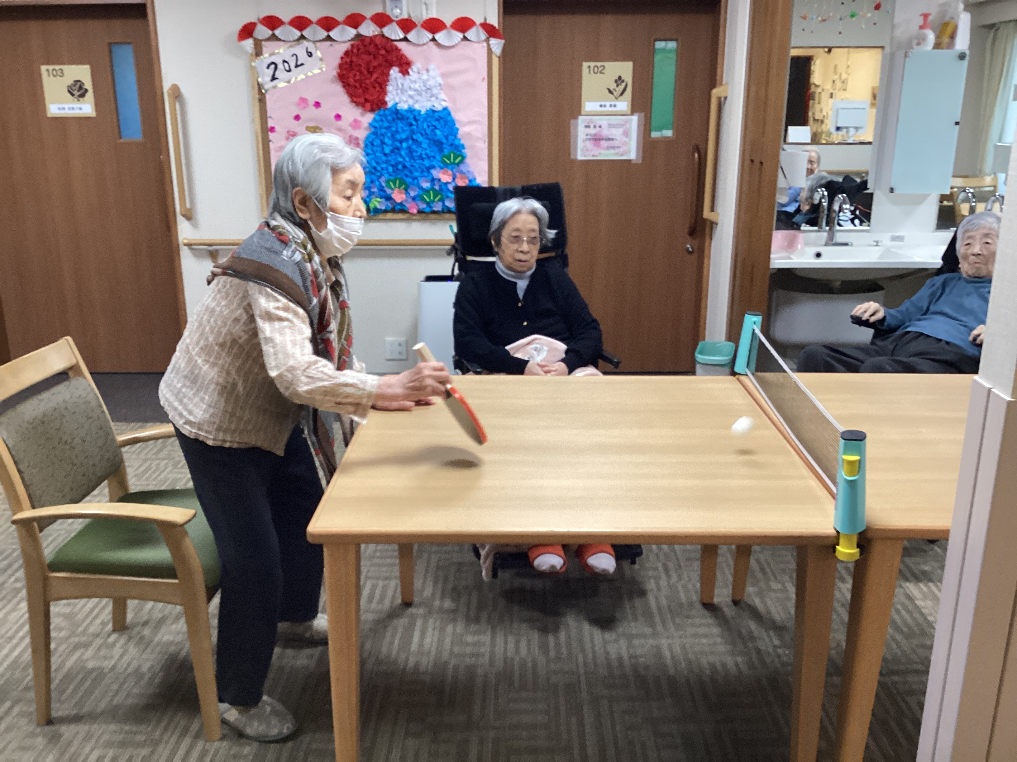 お正月遊びに今年は卓球大会をやりました。達者なご入居者もいて職員対決は職員が惨敗でした。100歳対決もありました。