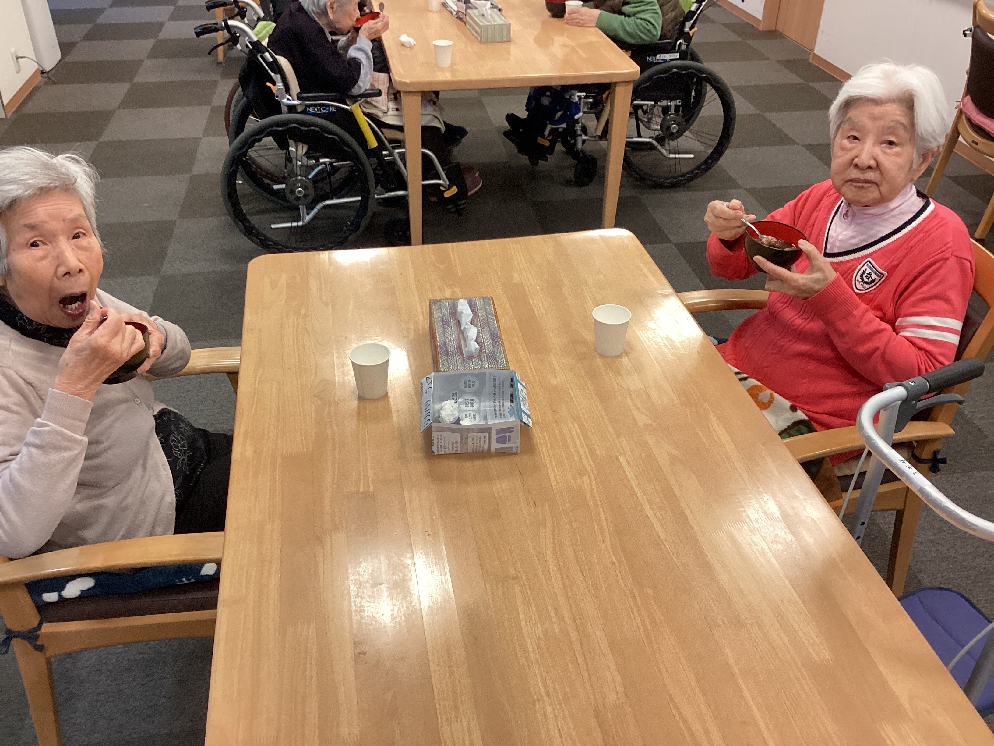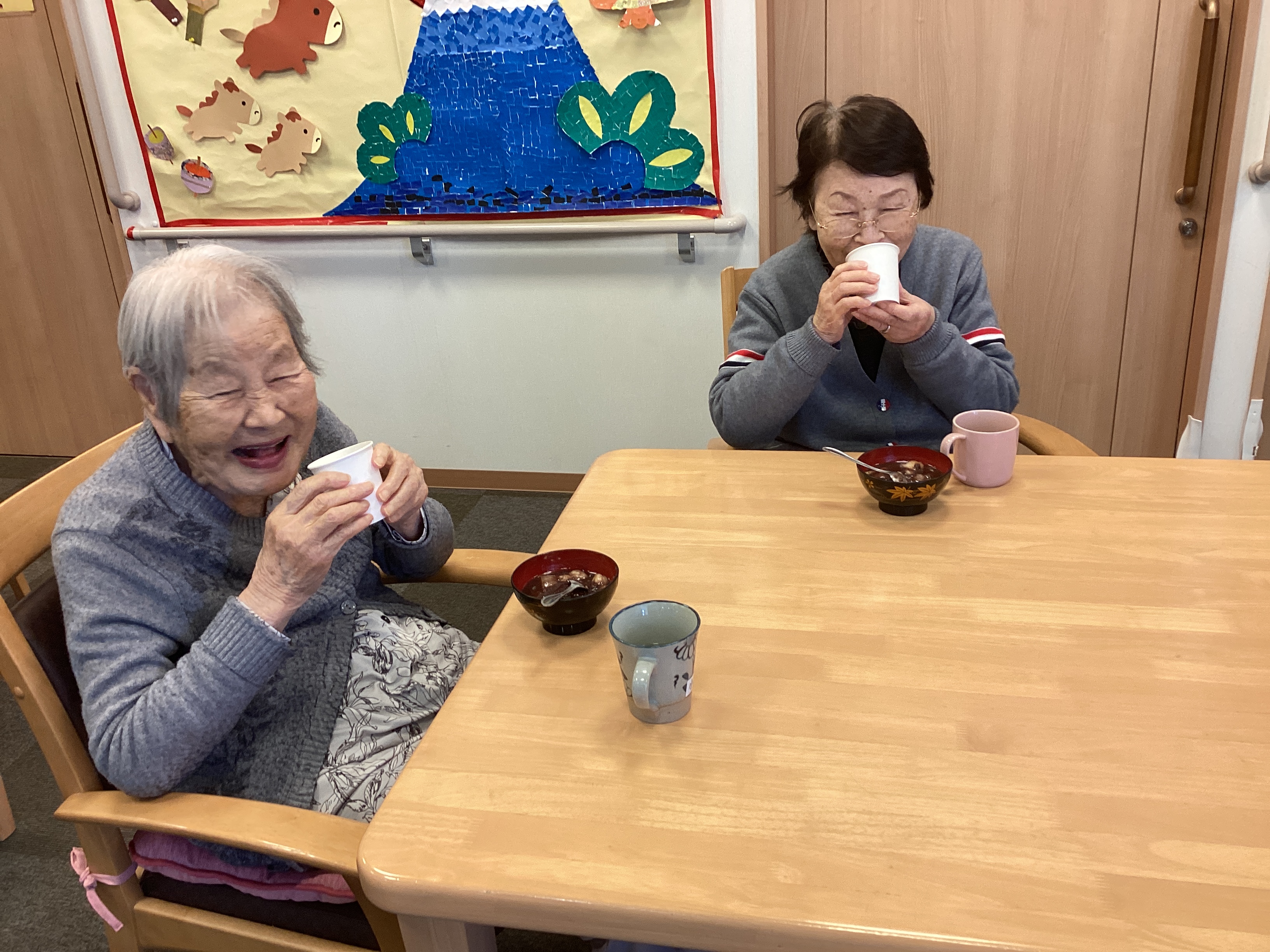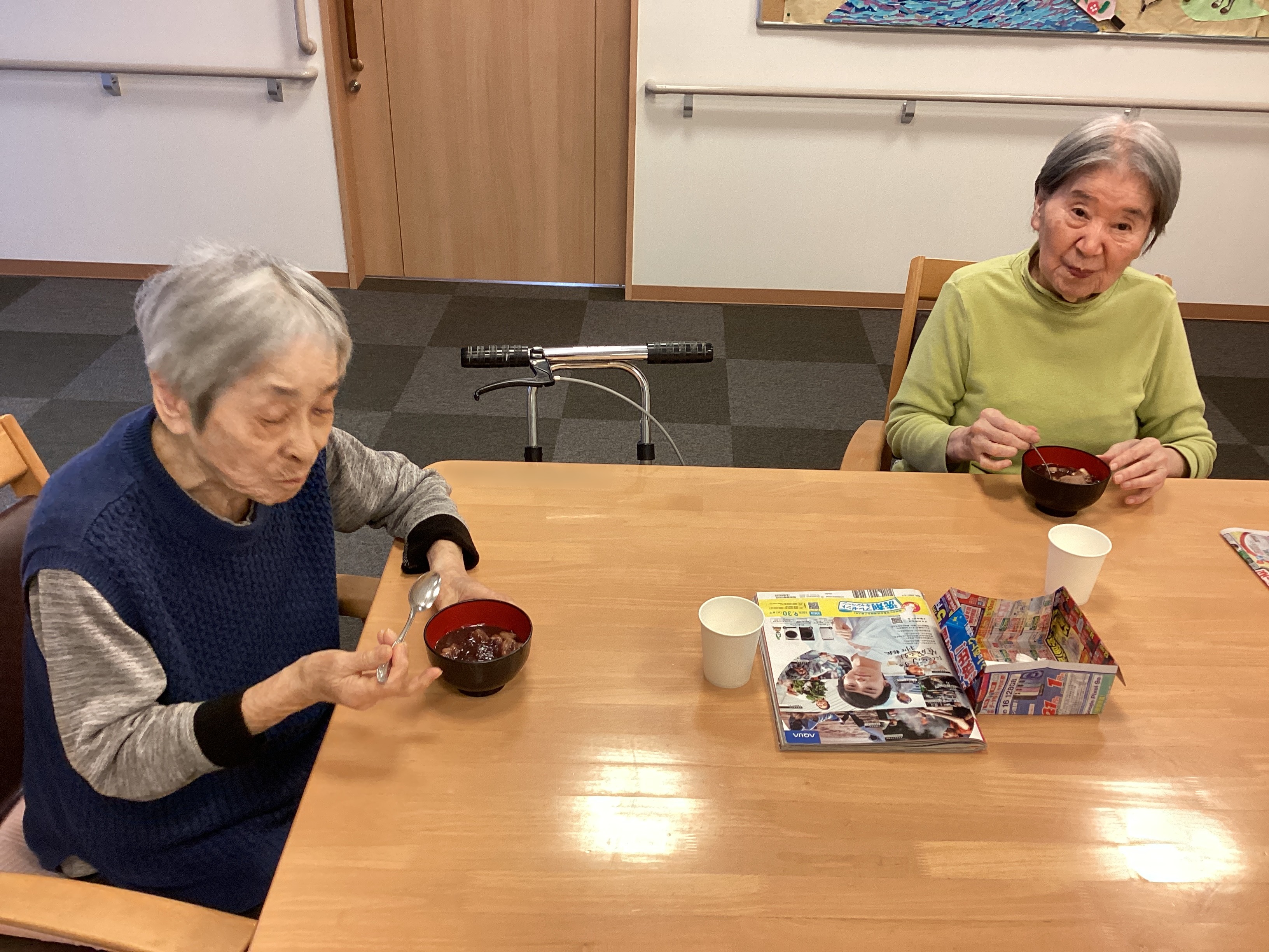 11日鏡開きに合わせておしること甘酒を召し上がりました。 おしるこはお餅の代わりにお麩を使用しました。 皆さんお餅だと思われ、大好評でした!