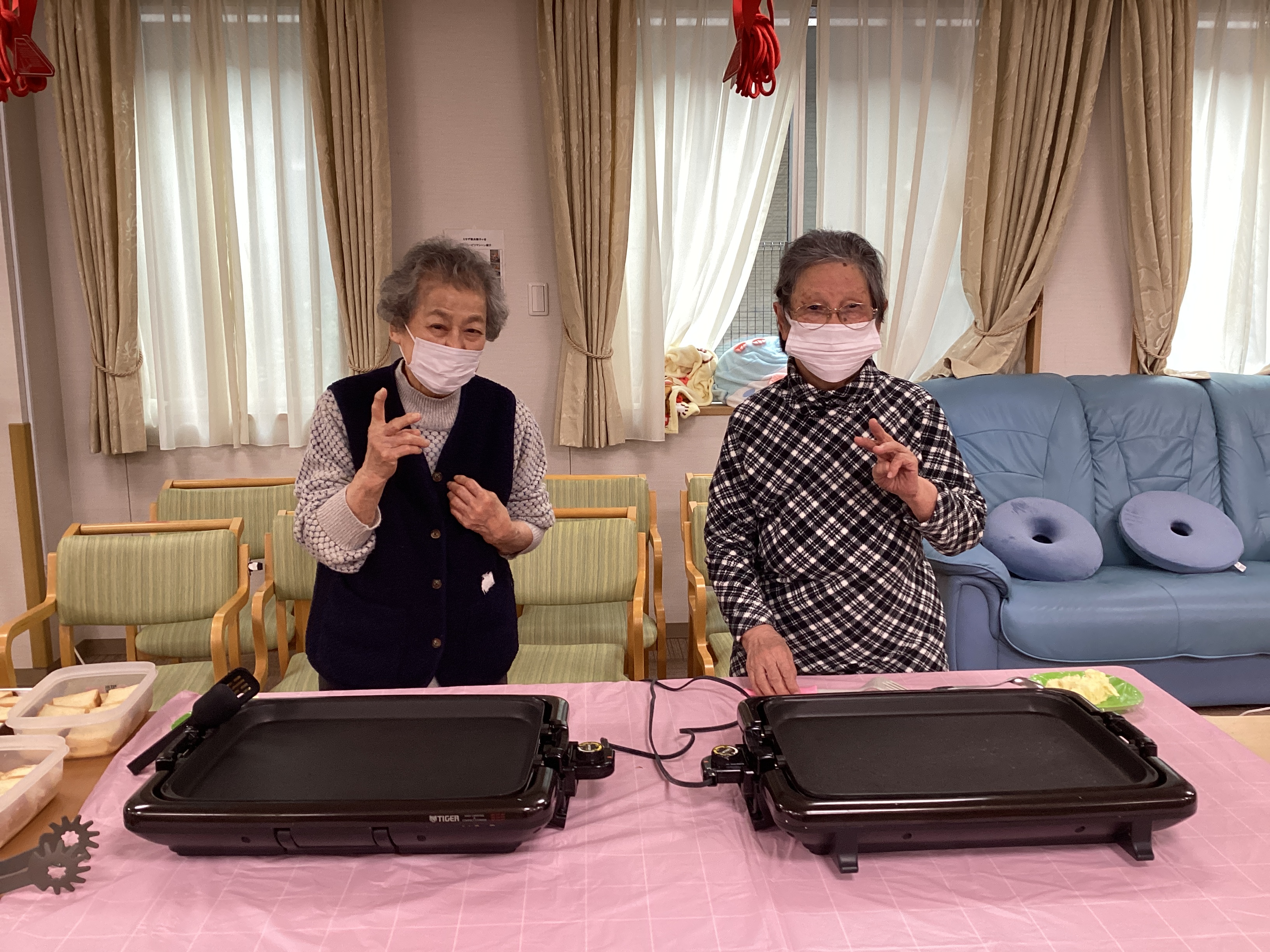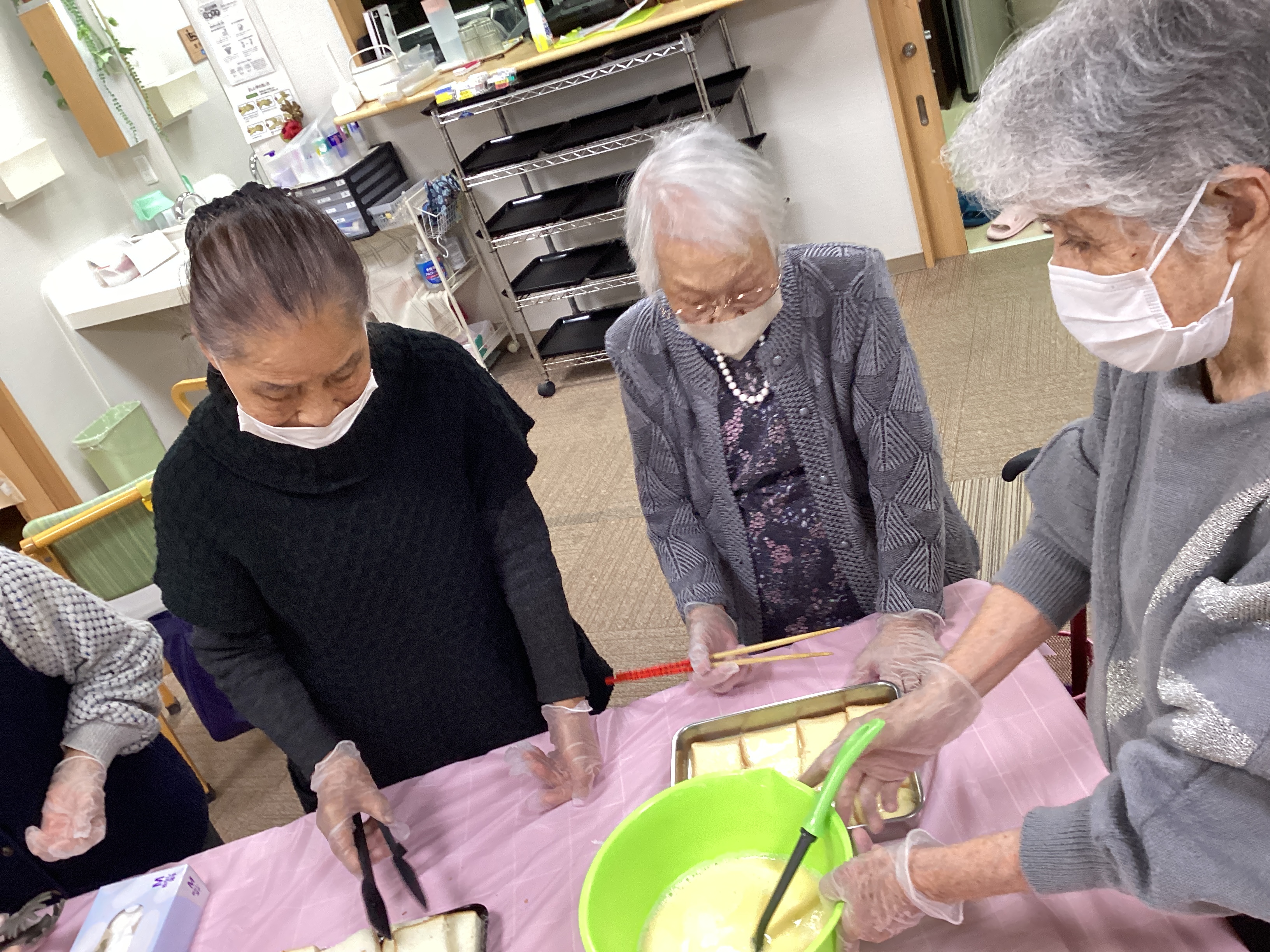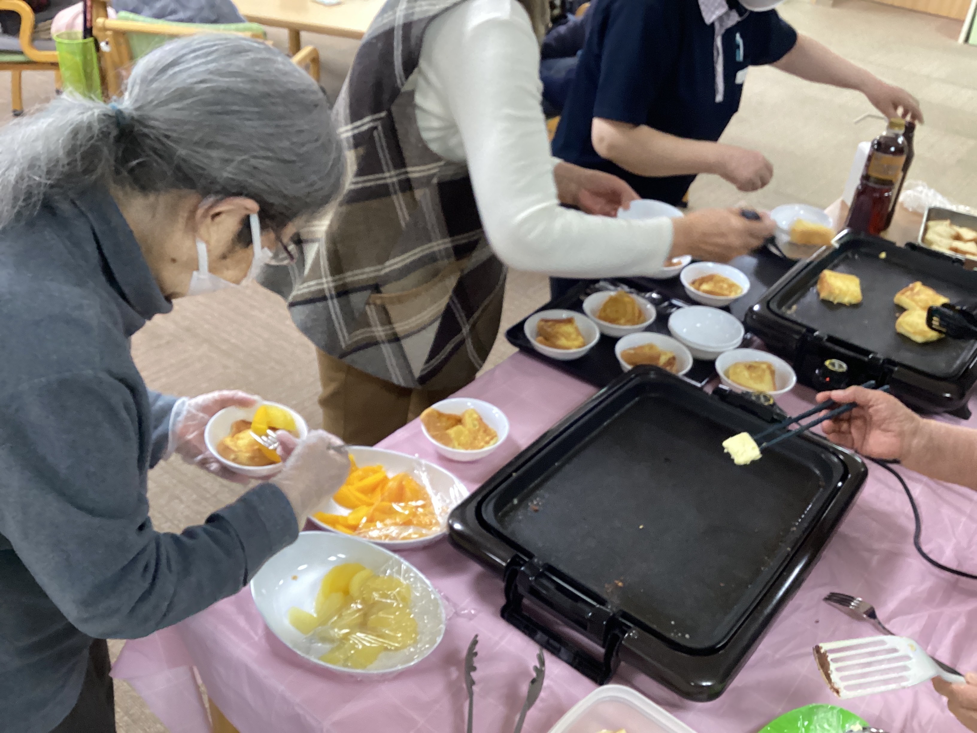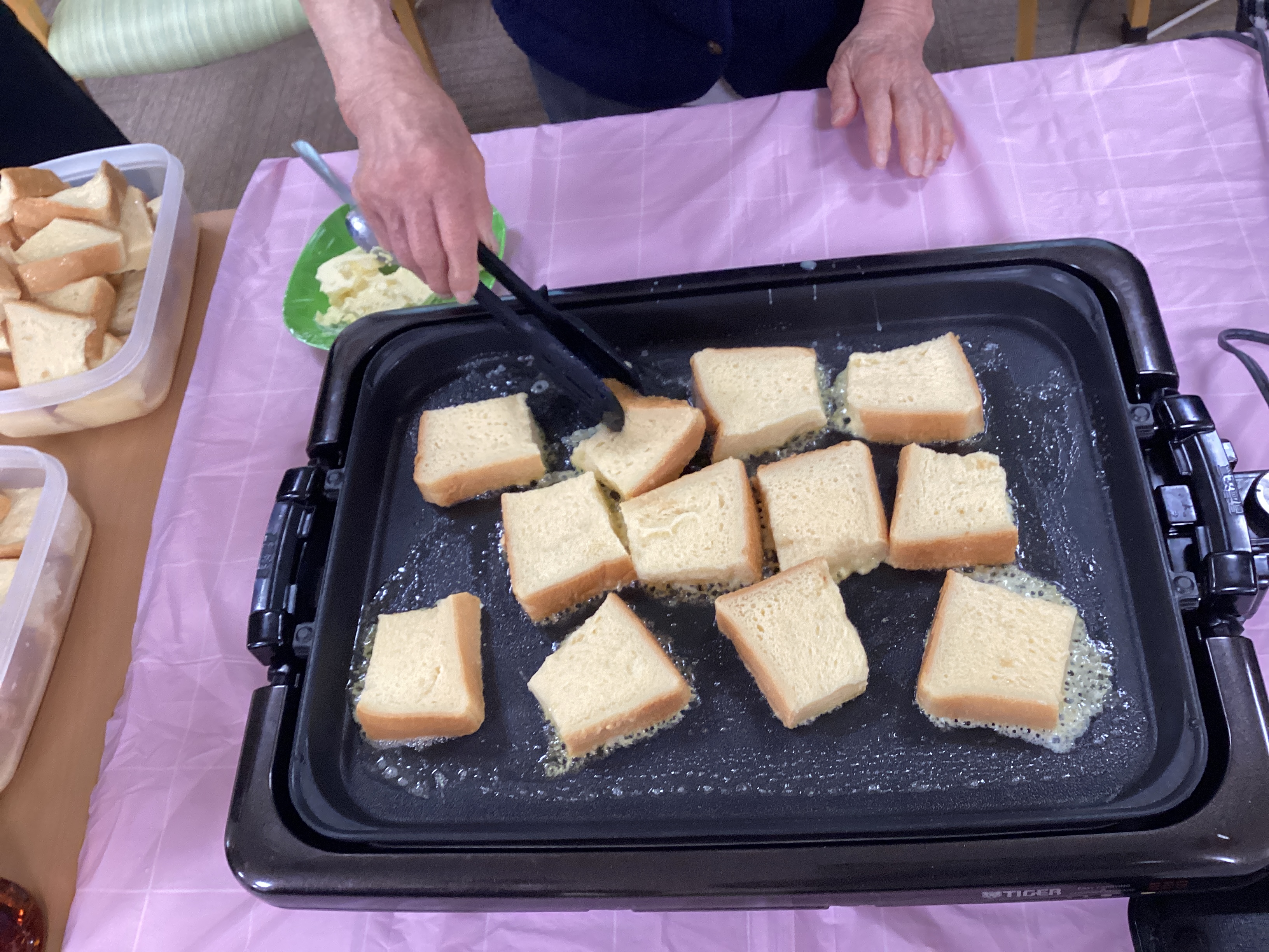 「フレンチトースト」を作りました♡ バターのいい香りと、ふわふわに出来上がったフレンチトーストに「はちみつやチョコ」をかけて食べました。「なんて美味しいのかしらー😋」と歓声!!!