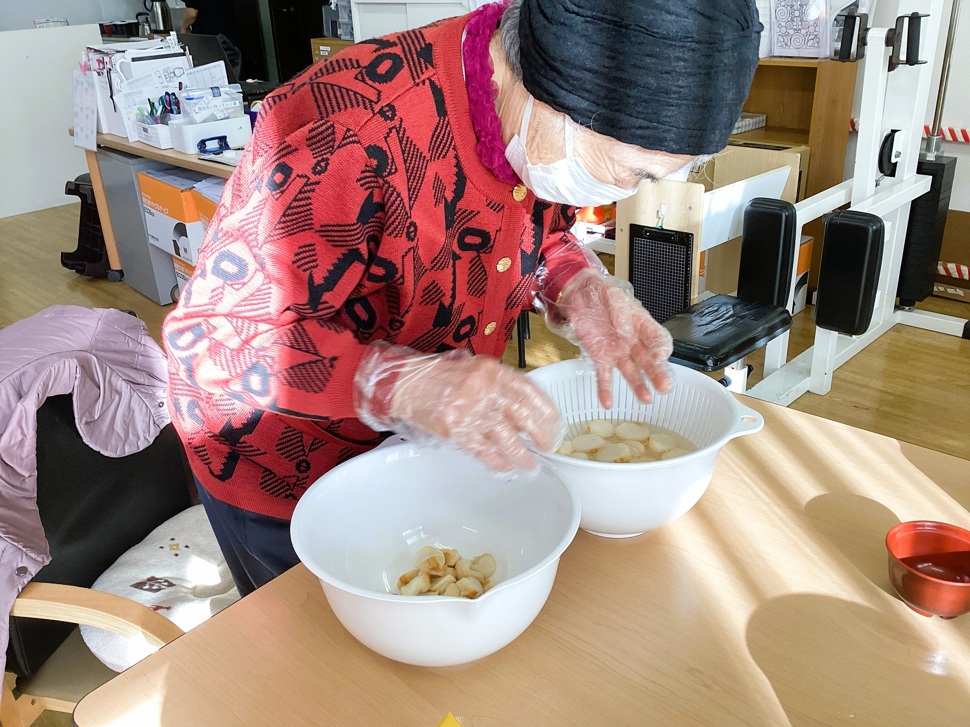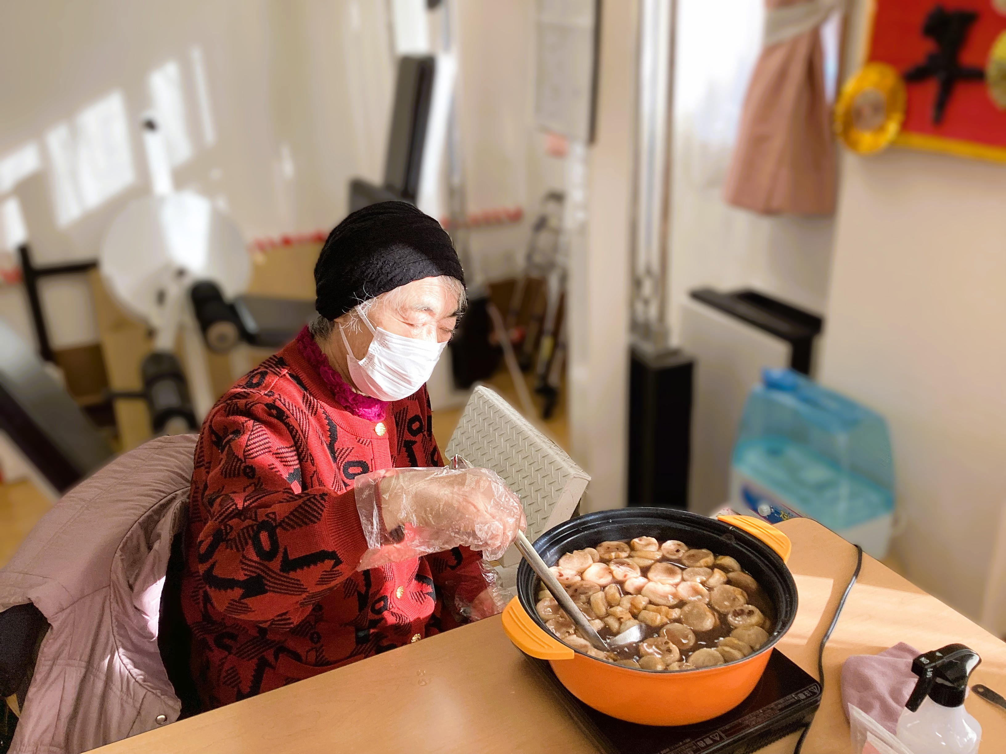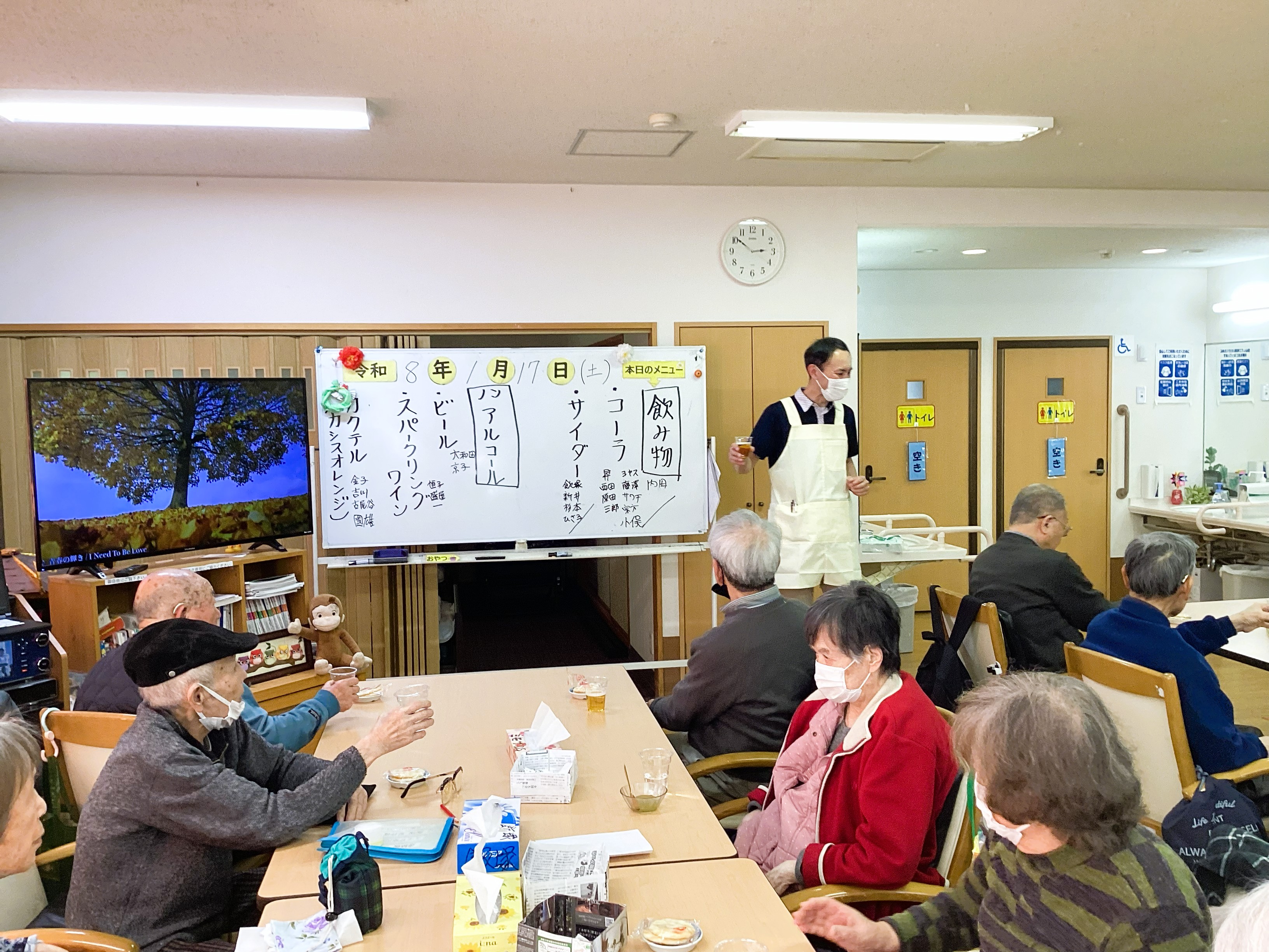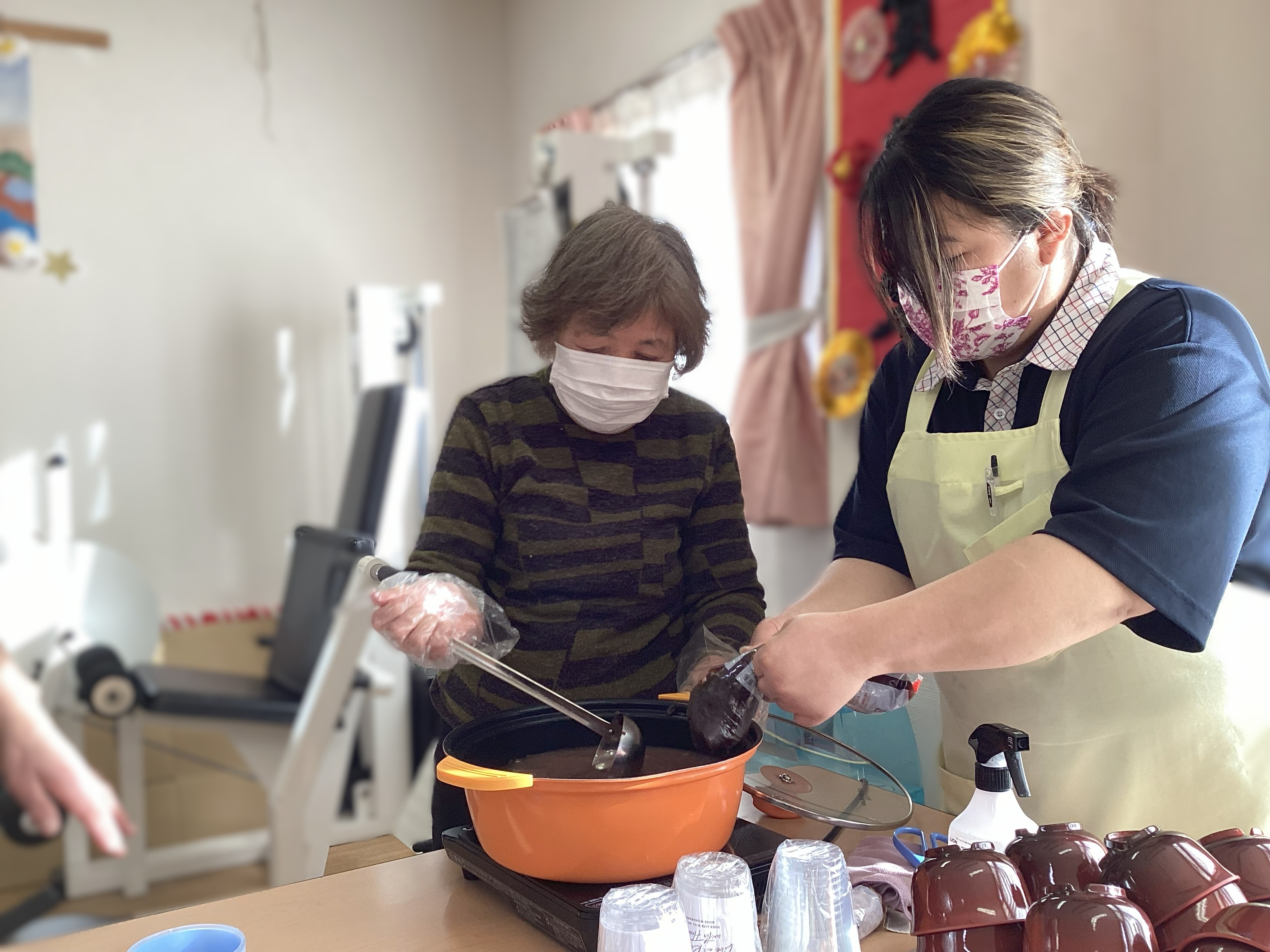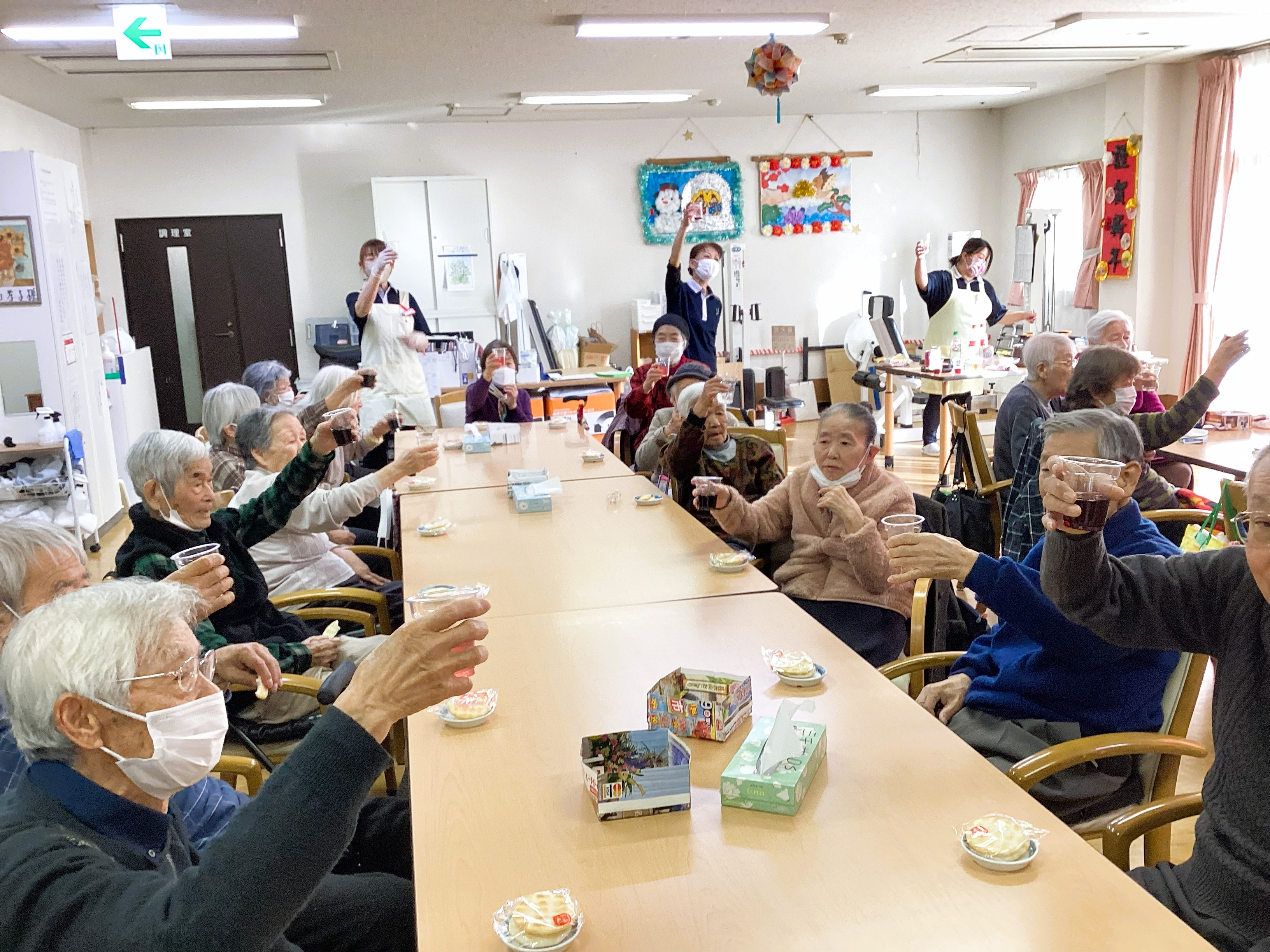 新春ビンゴゲーム大会🎍まずはお汁粉を準備し、好きな飲み物を選んでいただき同席の方やスタッフと一緒に乾杯をして、会がスタートです!!