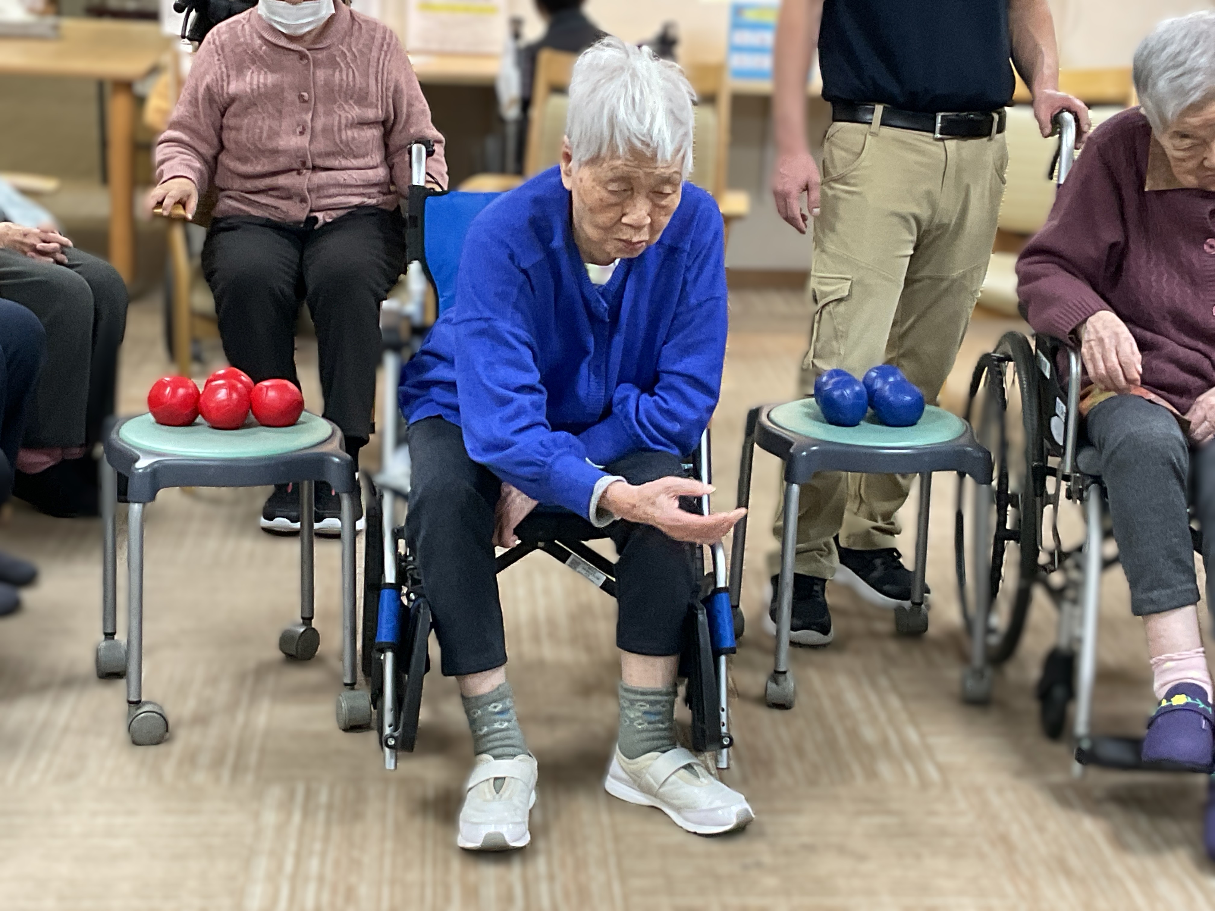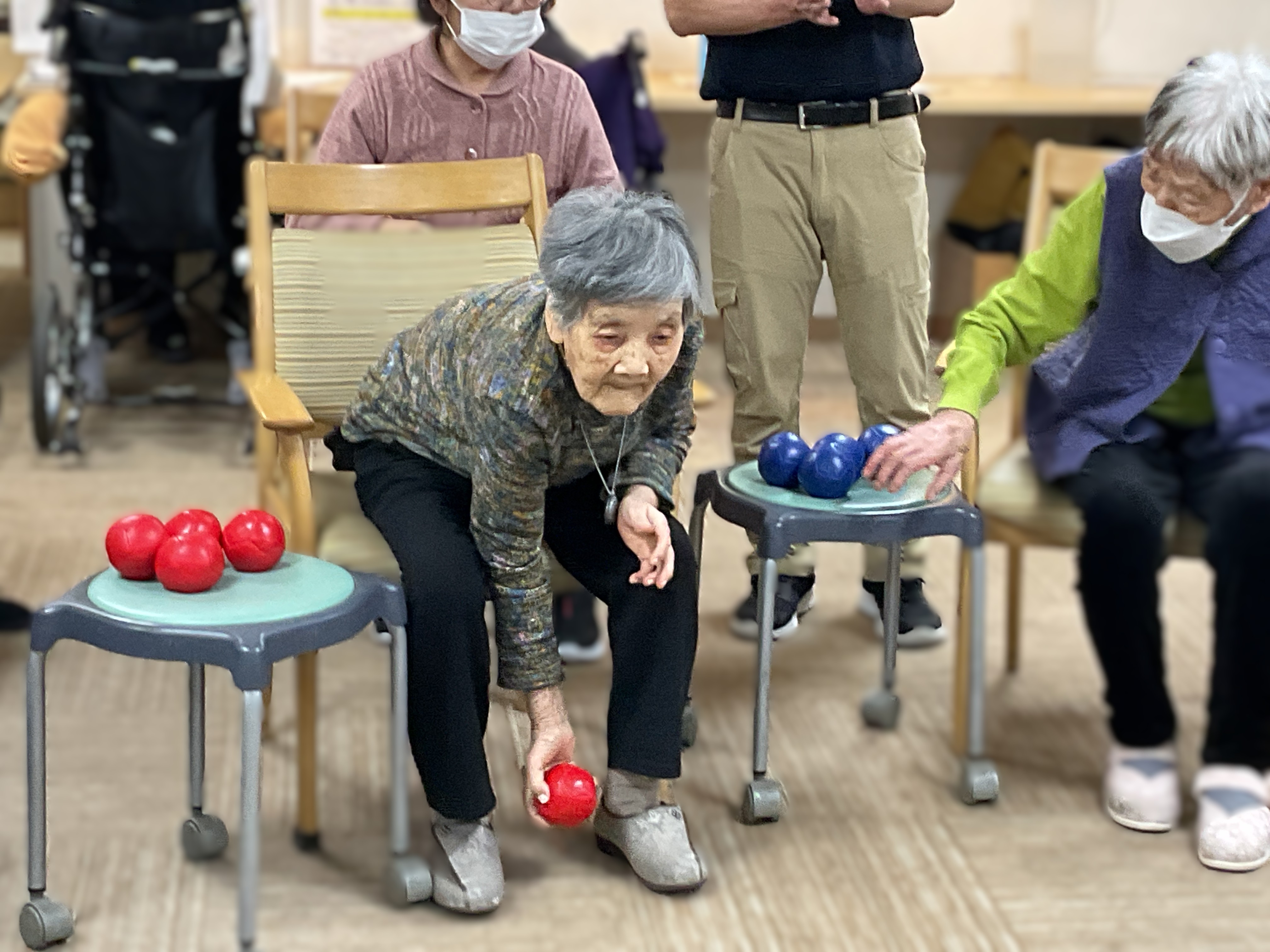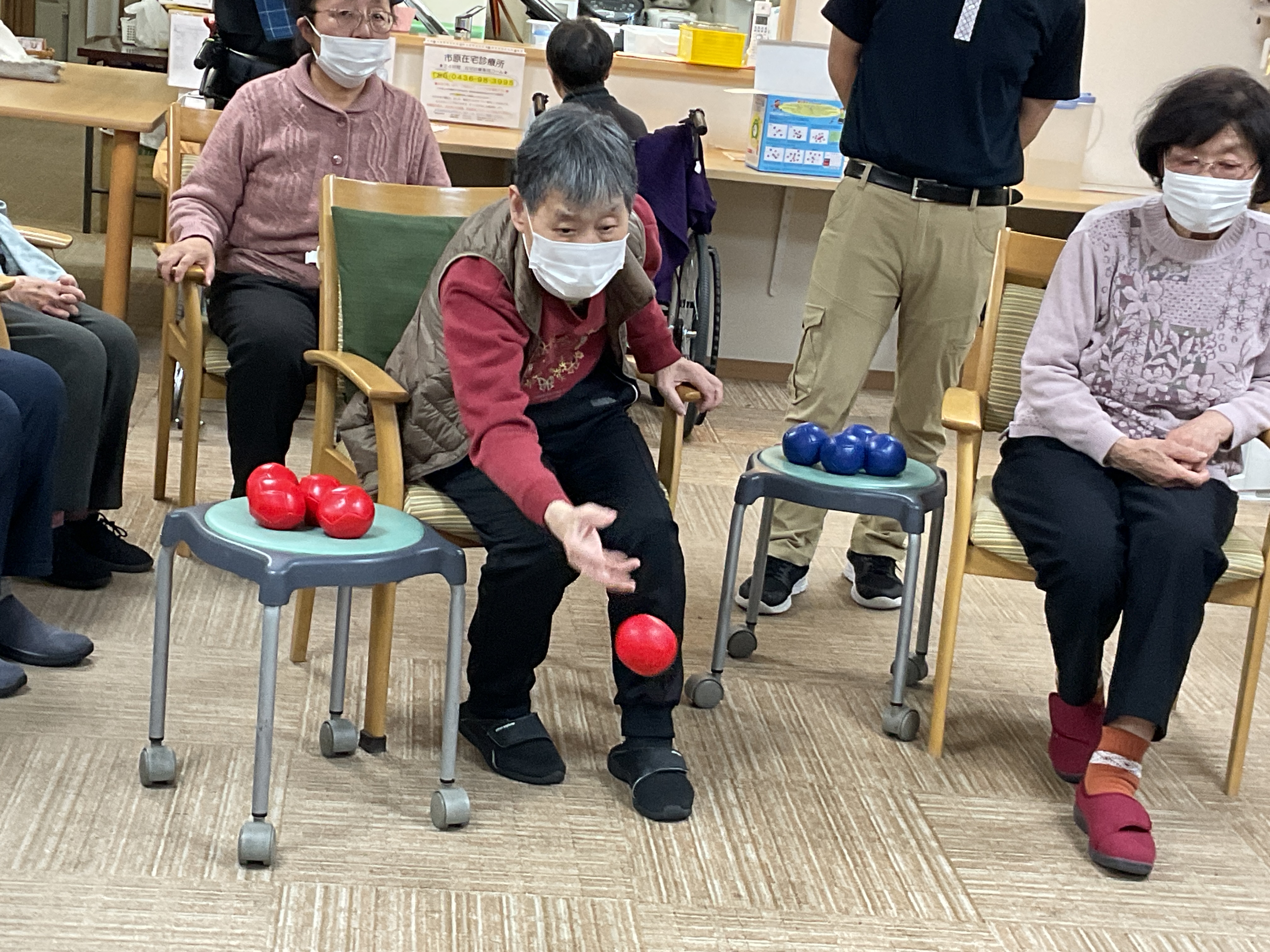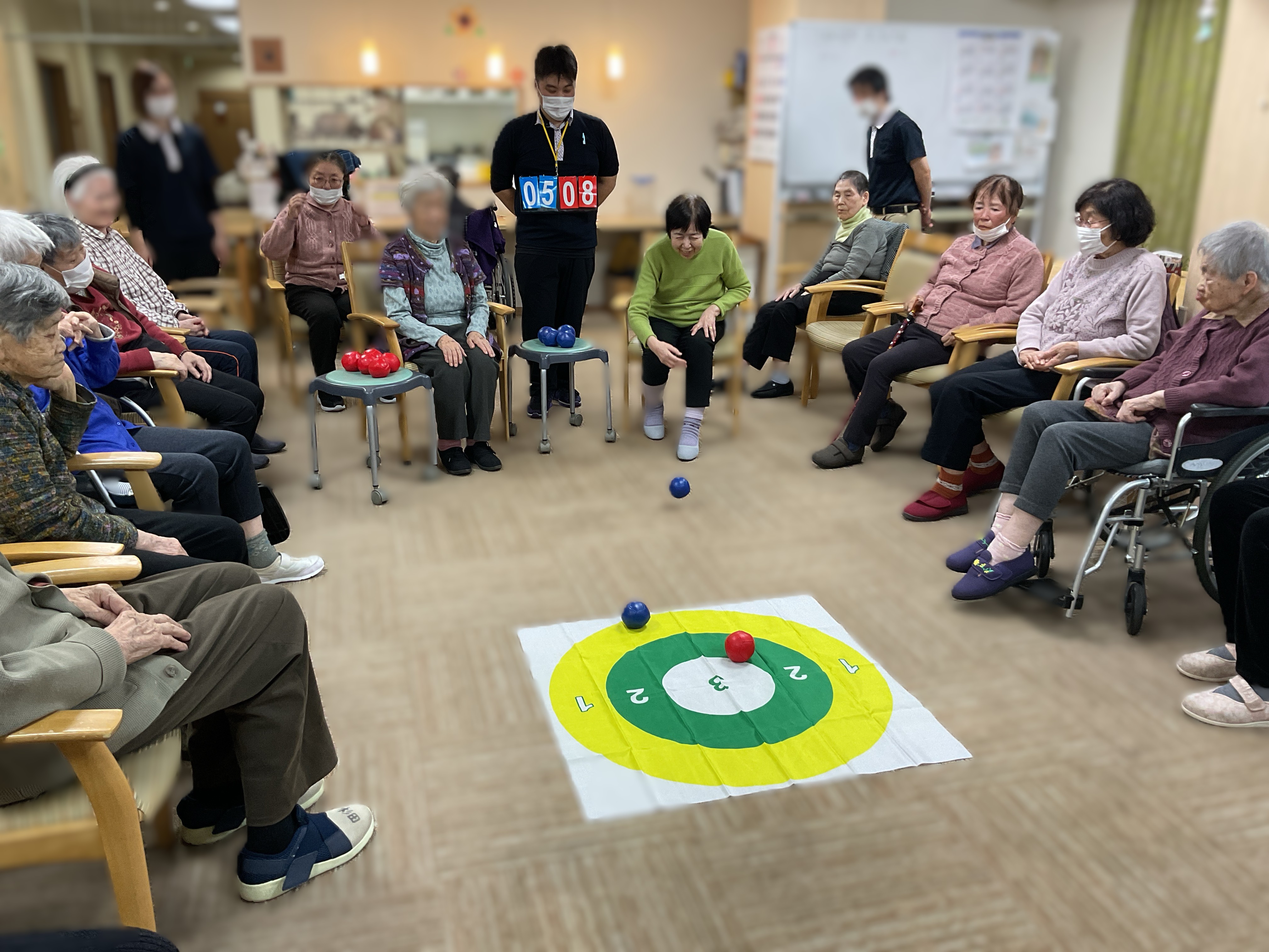 ミモザ市原には手軽にボッチャができるセットがあり、2チームに分かれて対戦しました🆚