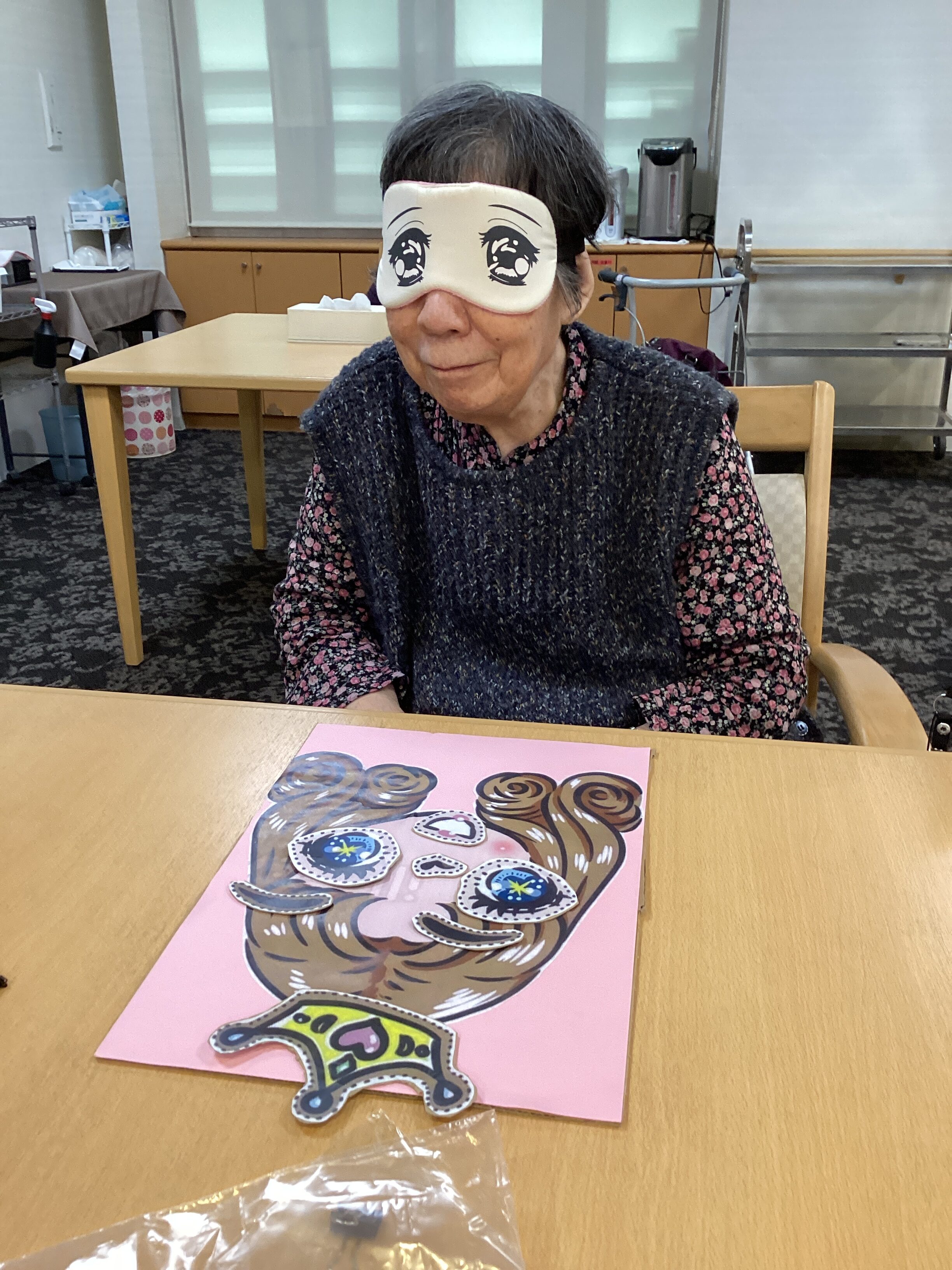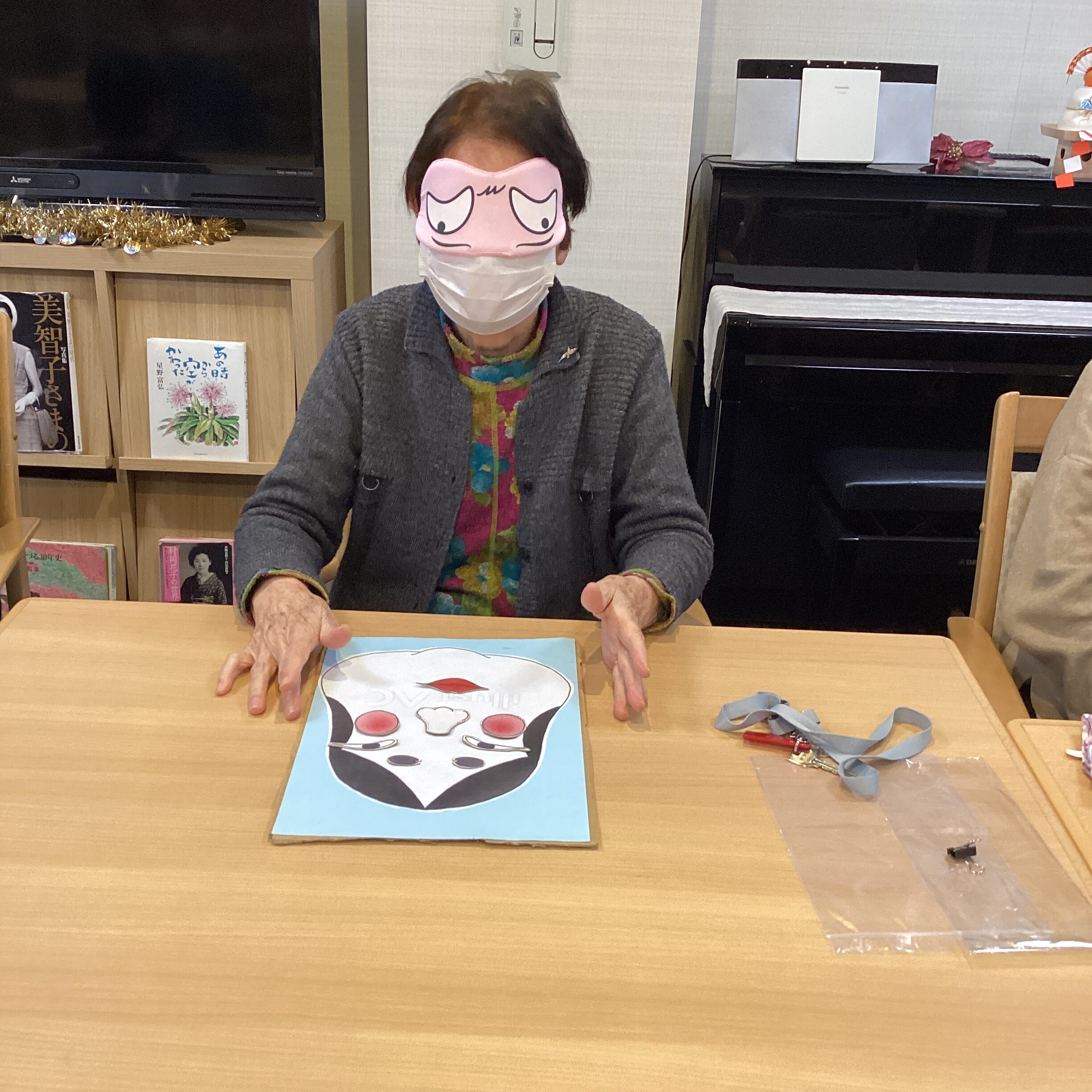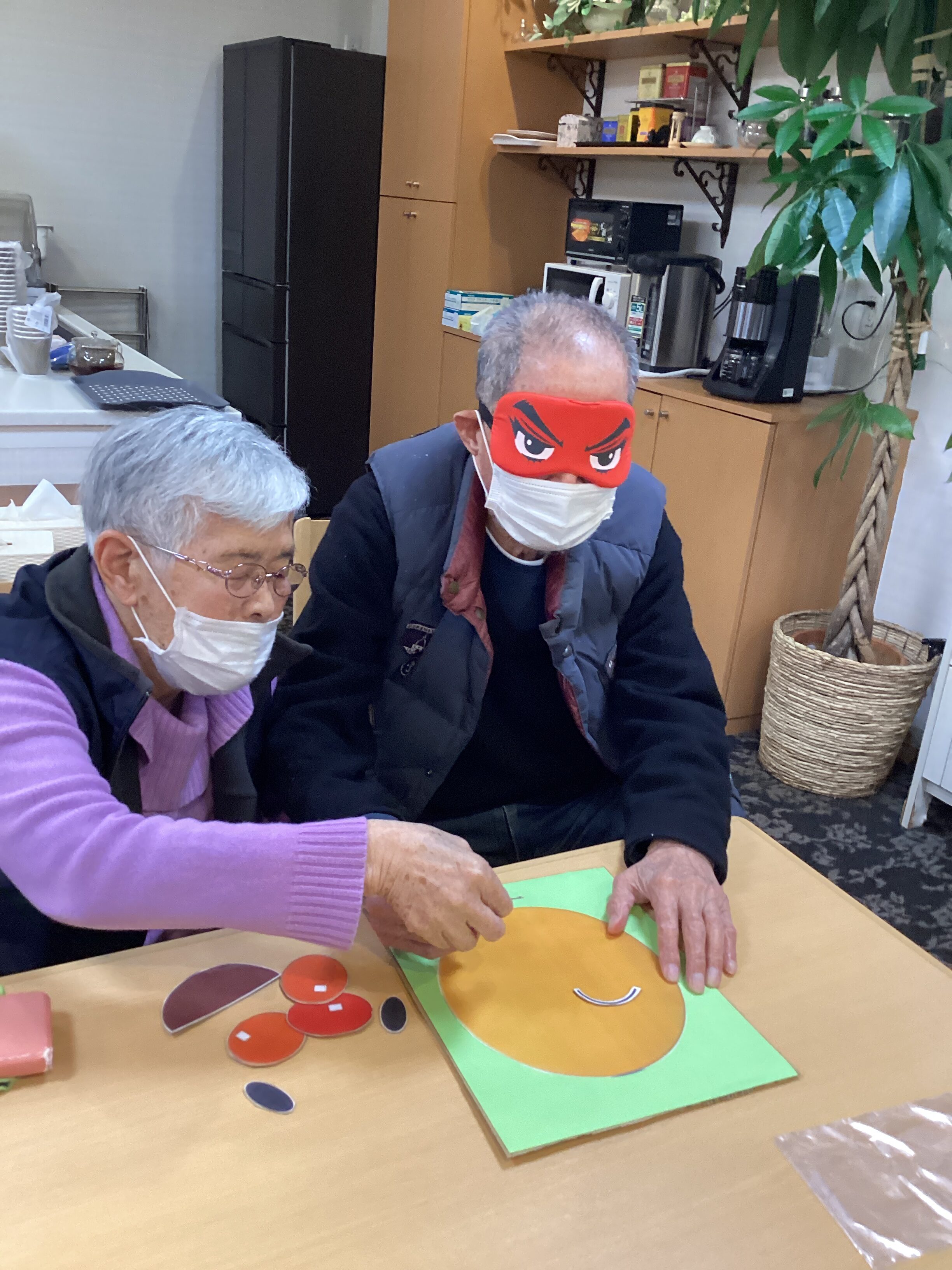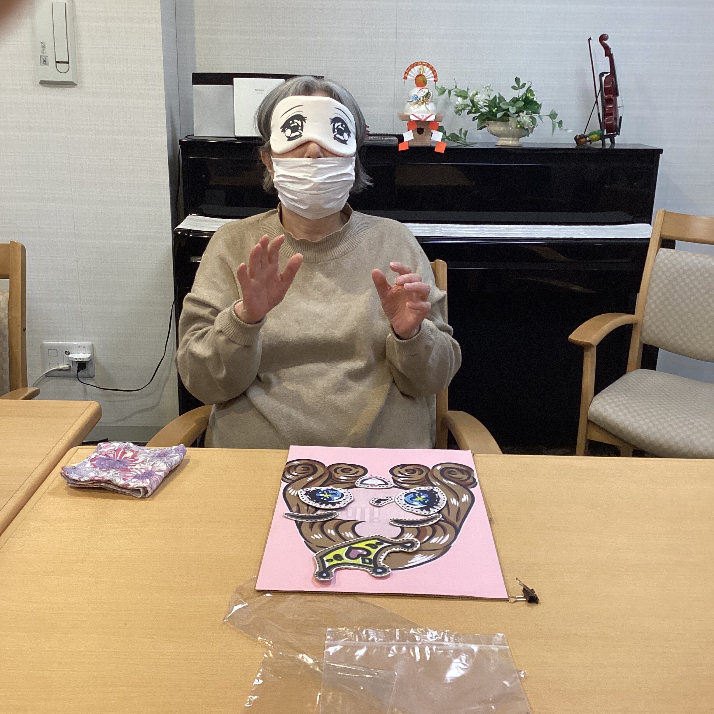 年初めに、福笑いをしました👏意外と皆様、マスにパーツが収まっていました・・・アイマスクの隙間から見たのかしら?💦大成功で終わりました😆