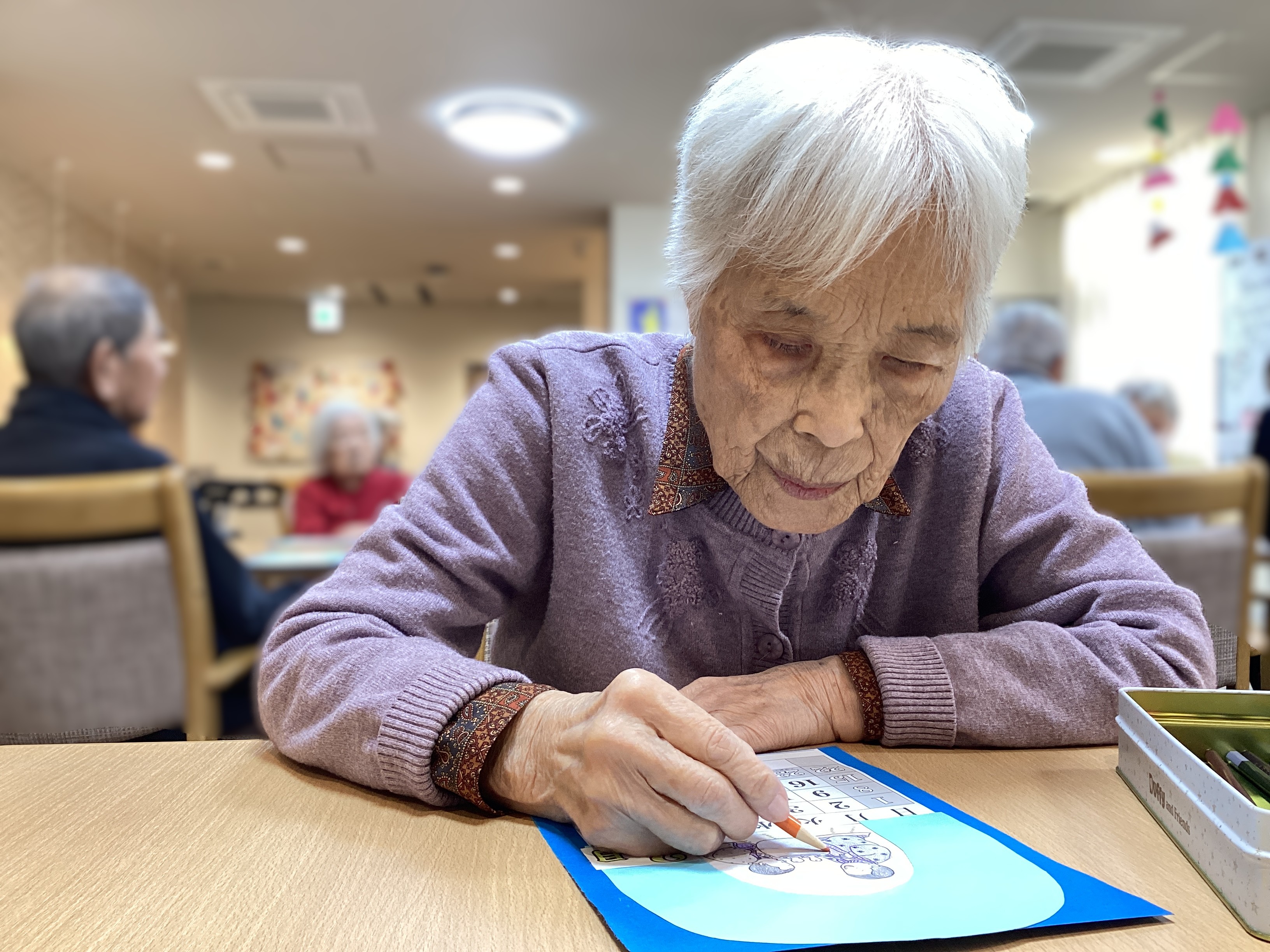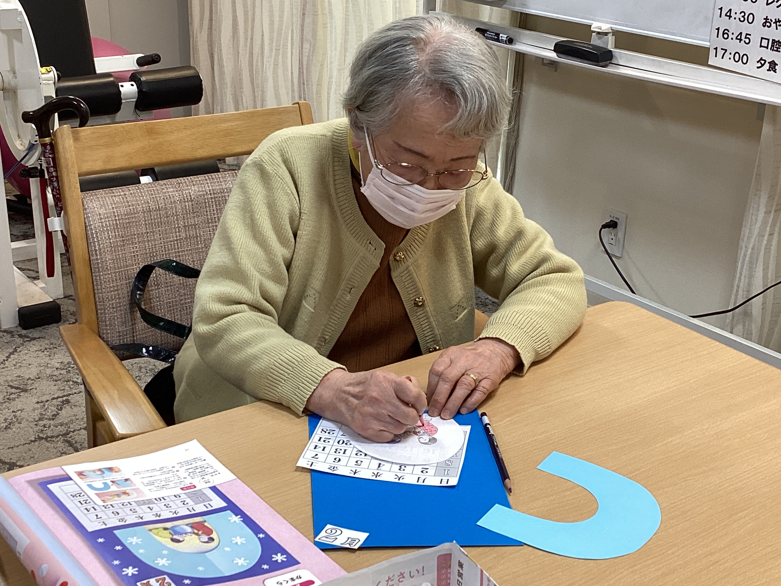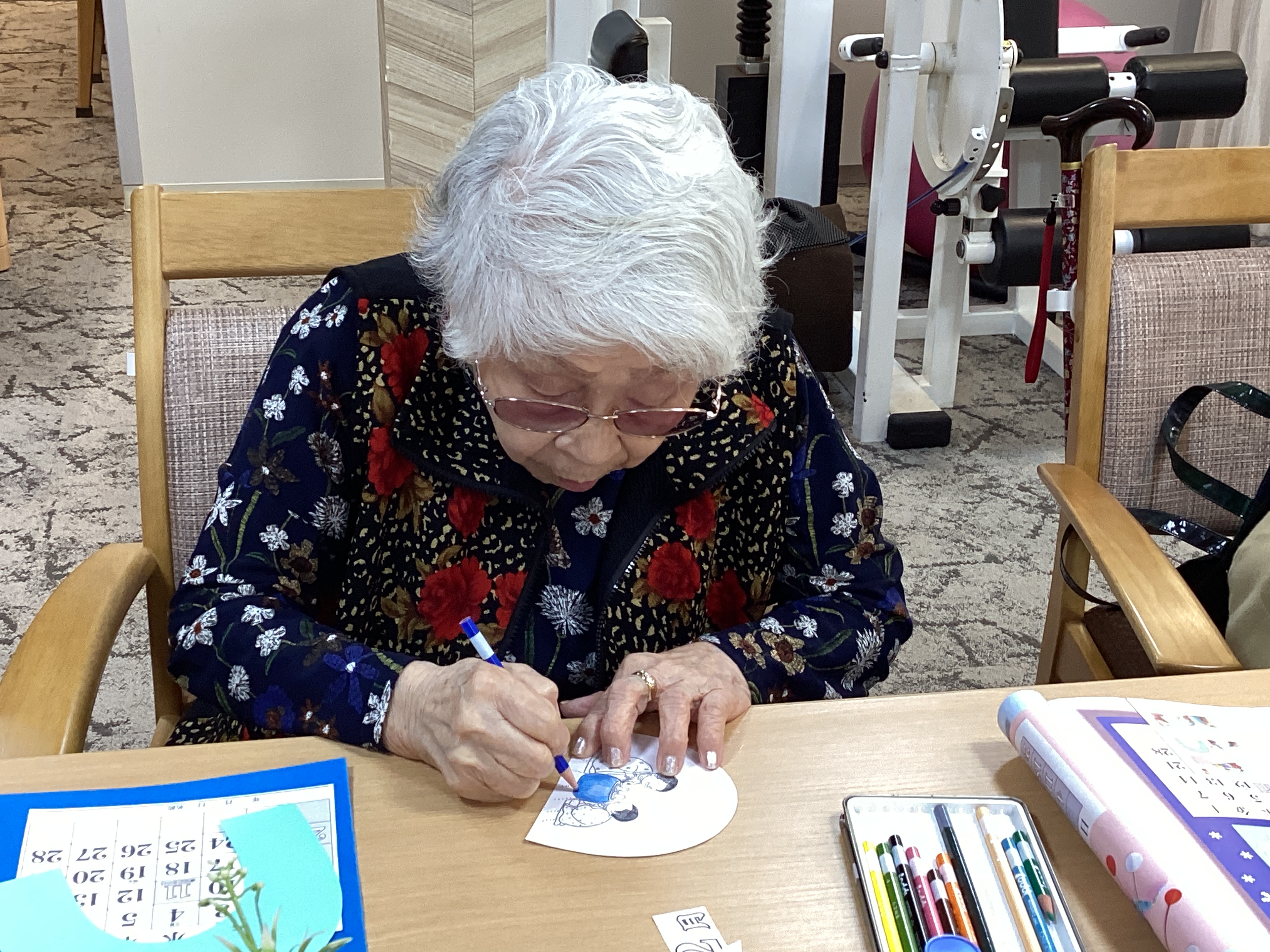もうすぐ如月を迎えるため、カレンダーを作成しました。 丁寧に色鉛筆で絵を塗られていたのが印象的でした🖌️