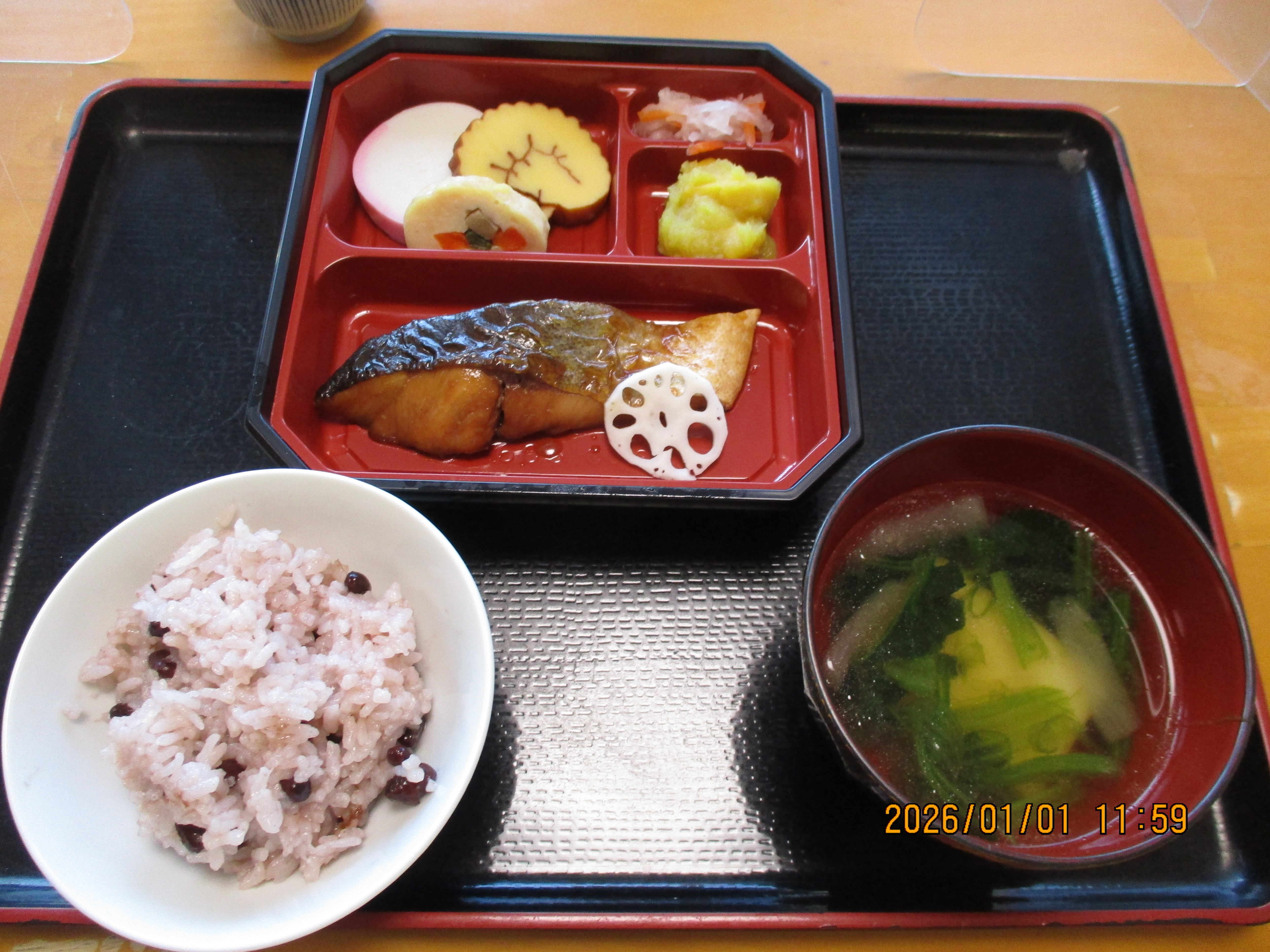 お正月は、おせち料理とお雑煮、お赤飯が出ます。皆さま夢中で召し上がっています。