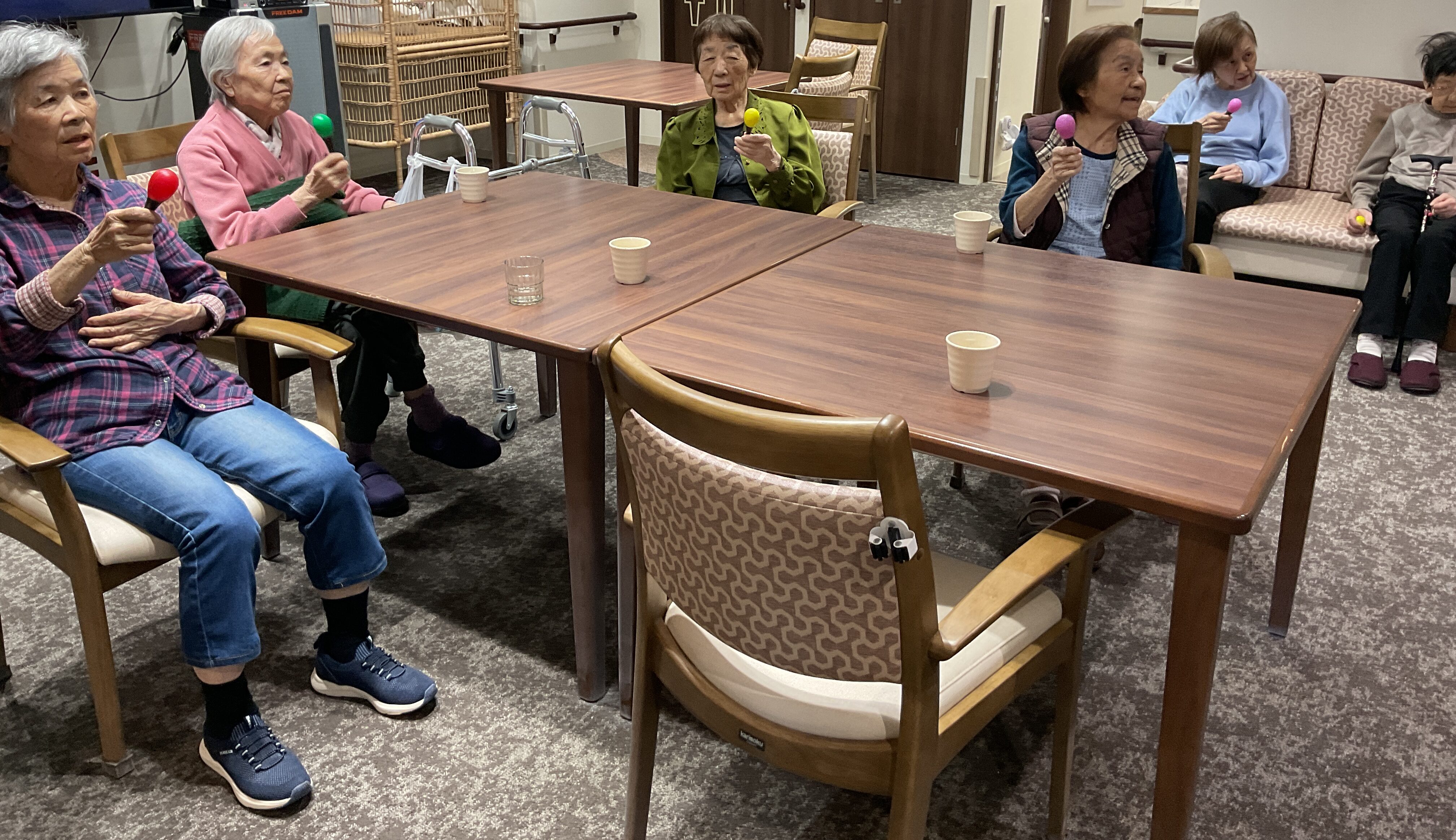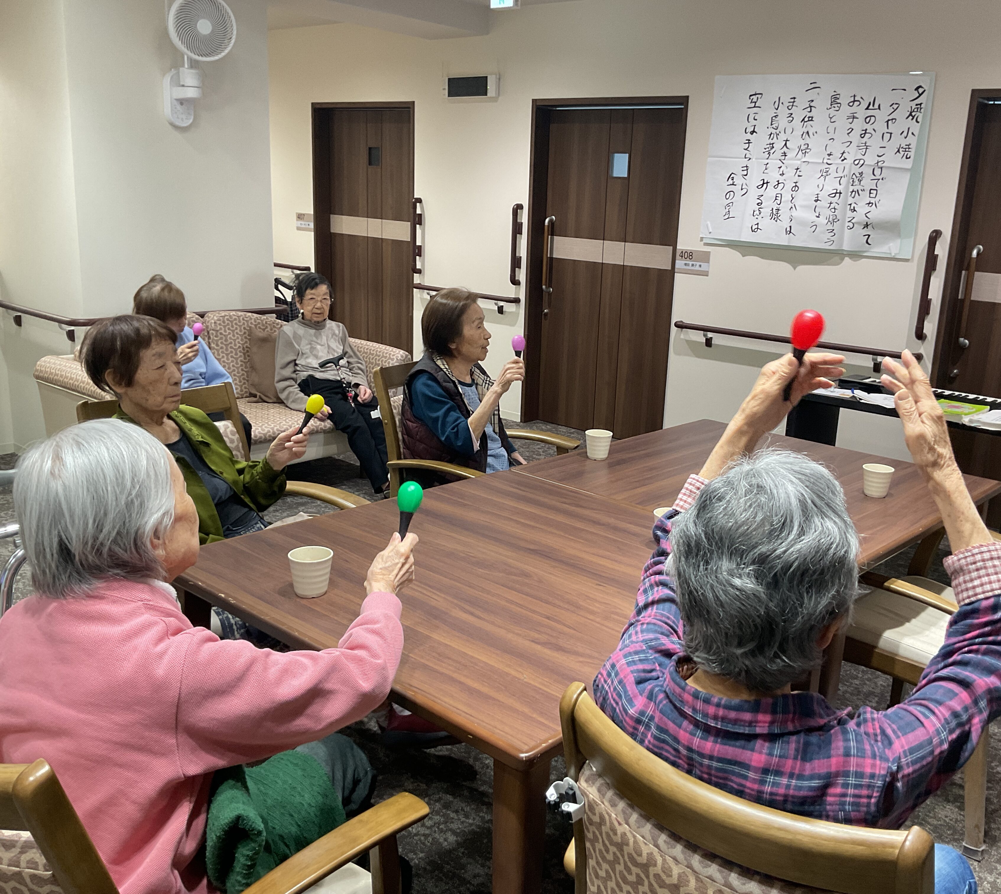 4階フロアでは先日、1月の音楽レクが開催されました! 「冬景色」や「有楽町で逢いましょう」などの懐かしの歌から、季節の歌の「節分」など様々な曲を皆さんで歌いました。 最後は皆さんでマラカスを振りながら、「夕焼け小焼け」を歌い1音楽レクは終了しました。